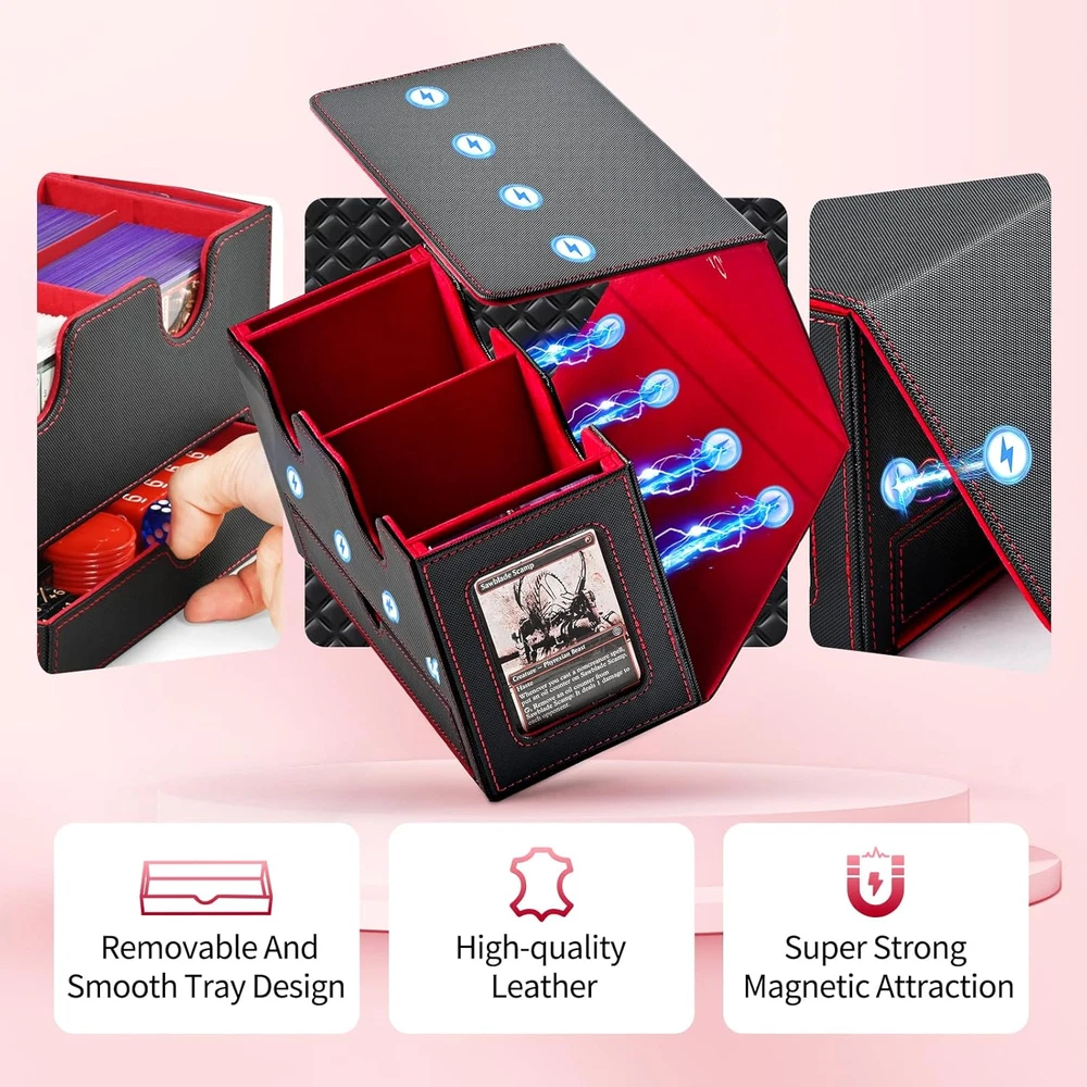 Two Commander Display: The double deck box is specially tailored for commander EDH players; Through the display window you can easily glance at the box's contents without opening the box; Included two 35pt card holder can show the card clearly Durable and Functional: Card deck box is made of PU leather exterior that provides good protection, and soft microfiber interior to protect your cards from scratches; Wide U-shaped opening ensures easy access to your cards, making it convenient Large Capacity: This display deck box works with unsleeved cards, single-sleeved cards, double-sleeved cards; Each case can hold 140+ single-sleeved cards or 100+ double-sleeved cards; Included two card dividers allow you to classify different cards Strong Magnetic: The card storage box features strong magnetic closure that ensures the box stays tightly closed even if it is tipped over, provide good protection for all types of cards; The dice tray design helps you to store dice and counters Good Choice for Card Collectors: UAONO deck case for trading card is a ideal choice for gamer, suitable for storing game card, sports card ect.; Enjoy card games with your friends or family; If you have any questions, feel free to contact us Product Description Card Deck Box With Dice Tray Large Capacity Speaking of capacity, we've tested this card storage box with various popular sleeves. It can comfortably hold up to 200+ double-sleeved cards or an impressive 280+ single-sleeved cards. And don't forget the giant dice tray that can accommodate more than 50 dices – all your gaming essentials are organized and within arm's reach. If you are an avid commander EDH player, then look no further! Our innovative design is tailored to meet the needs of commander enthusiasts like you. With this card storage box, you can safely house your cards and showcase your commander with pride in our unique commander slot. Moreover, 2 magnetic holders can prevent the commander accidentally from shuffling into your cards.