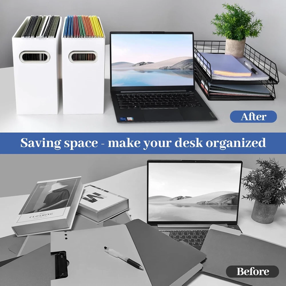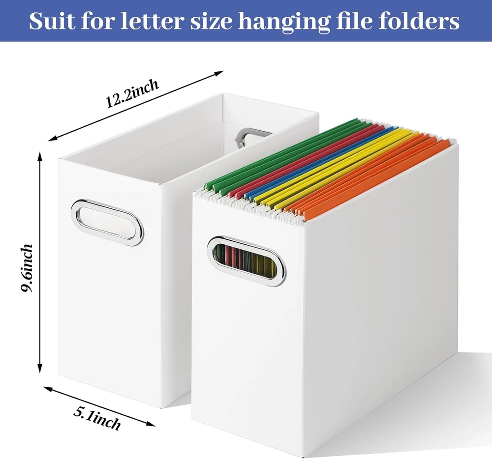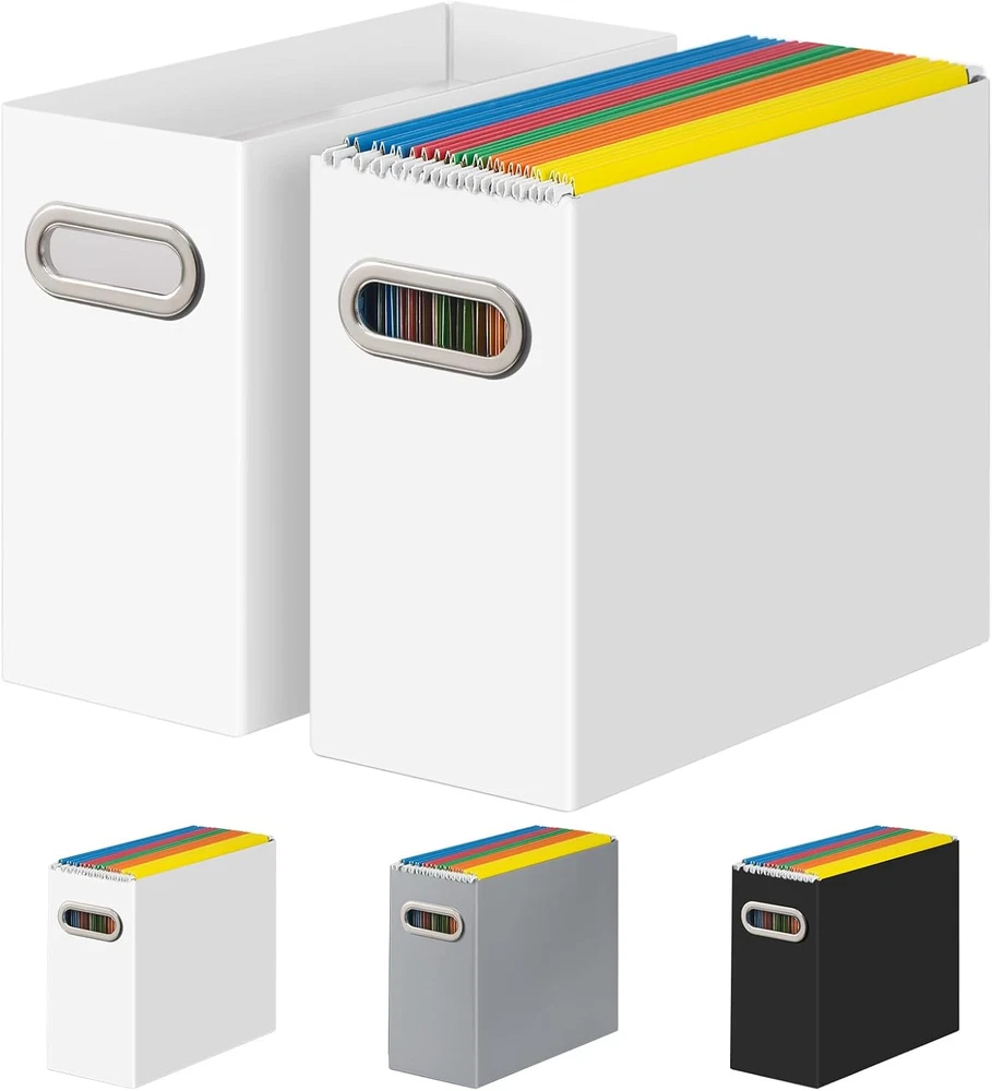 Product Description Portable Sturdy Handles Thick cardboard&Durable Large Capacity Multiple Colors Suitable for desk, shelf, or cabinet to save space. How to install Hanging File Organizer? Just 6 steps to complete the hanging file organizer, easy and convenient! You May Also Consider Add to Cart Add to Cart Add to Cart Customer Reviews 4.6 out of 5 stars 1,799 4.6 out of 5 stars 1,799 4.6 out of 5 stars 1,799 4.6 out of 5 stars 1,799 4.6 out of 5 stars 1,799 4.6 out of 5 stars 1,799 Price $9.99 $ 9 . 99 — $9.99 $ 9 . 99 $12.99 $ 12 . 99 — — Quantity 2 pack 4 pack 2 pack 4 pack 2 pack 4 pack Color White White Black Black Gray Gray Material Cardboard Cardboard Cardboard Cardboard Cardboard Cardboard Including hanging file holder ✘ ✘ ✘ ✘ ✘ ✘ Easy To Assemble ✔ ✔ ✔ ✔ ✔ ✔