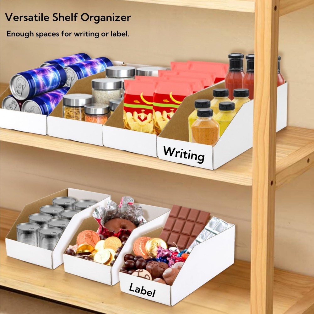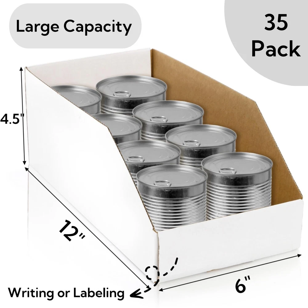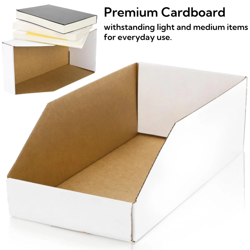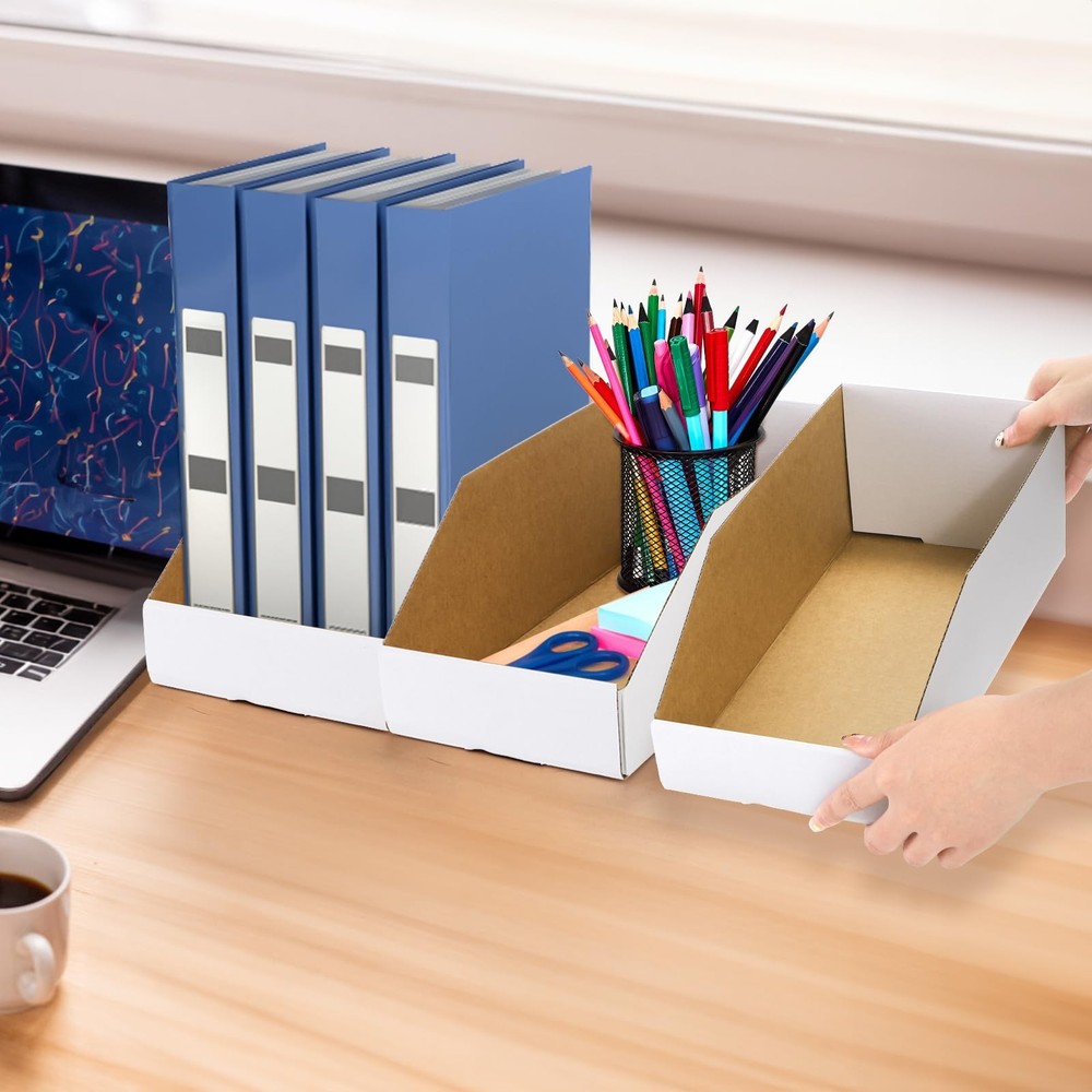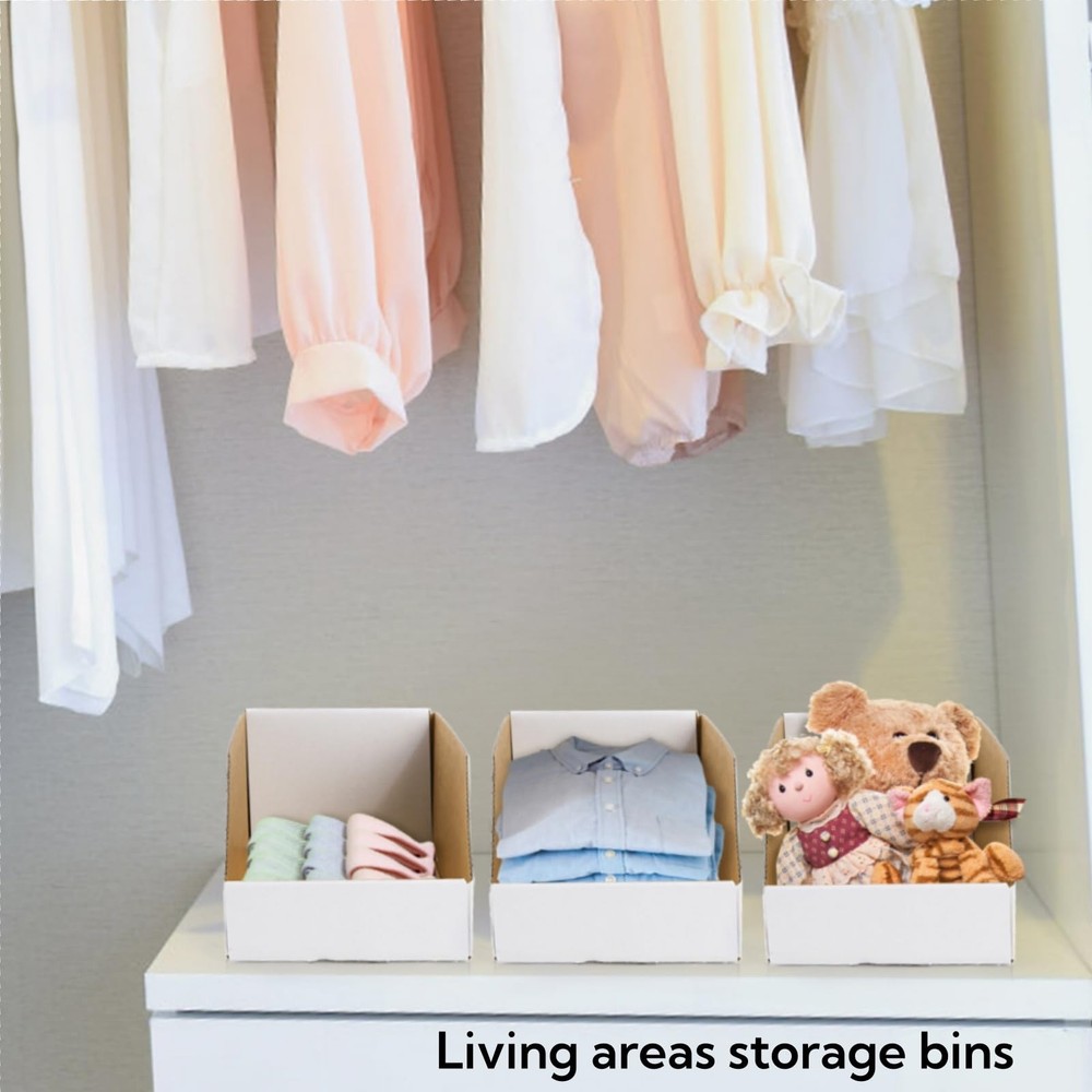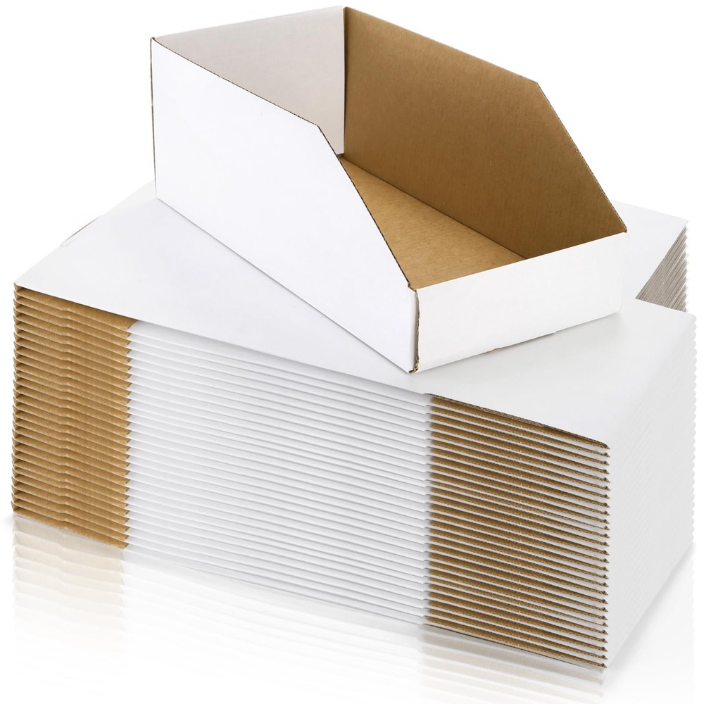 Cardboard Storage Bins, 12" x 6" x 4.5" Corrugated Open Top Box Shelf Organizer Features: Sufficient Quantity: The package comes with 35 packs of cardboard storage bins, which is adequate for you to organize various sorts of items and enough to classify different parts. The size of each shelf box is about 6"W x 12"L x 4.5"H, providing ample space to store your bigger belongings. Premium Cardboard: These open top bin boxes are made from high quality cardboard with thick single layer and sturdy construction. The white corrugated boxes are lightweight and durable, which is perfect for withstanding light and medium items for everyday use. Easy to Assemble: The cardboard parts bins are unfolded and can be easily stored. When you need the organizer bins, you just need to fold it up without tape. Put the cardboard on the ground, stand up the long wings on both sides, then fold the wings on both sides inward, and then insert the front and back covers downward into the bottom slot. Easy to Classify: The front of our sorting bins is designed with plenty of room for writing or labeling, so you can easily mark on the white shelf storage box and find what you want. Also, the multifunctional storage bin is convenient for moving to another place. Versatile Shelf Organizer: Ideal for a wide range of applications, the corrugate bins are built as file organizers, pantry storage, shelf dividers, warehouse storage bins, work and living areas storage bins, shipping boxes and more to keep your pantry, garage, or office clutter-free. SHIPPING We are always working hard to ensure your package arrives as soon as possible. Please understand that some factors like weather, high postal traffic, and the performance of shipping companies are outside of our control. We offer free shipping to the lower 48 states and ship within 3 business days of payment, usually sooner. We do not accept P.O. Boxes. Please provide a physical address.