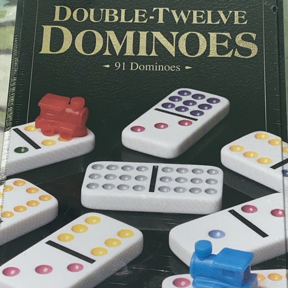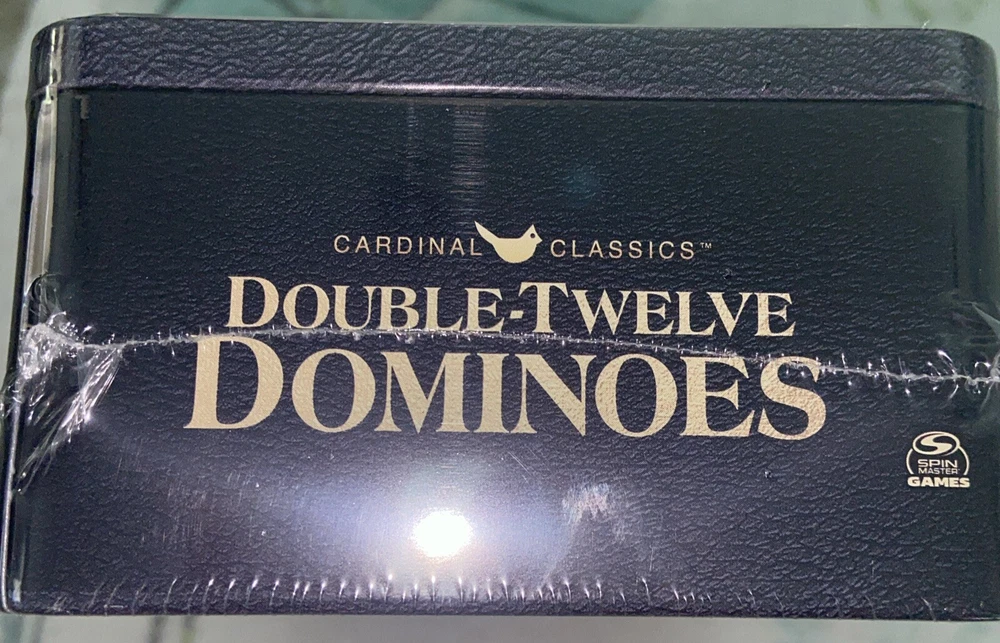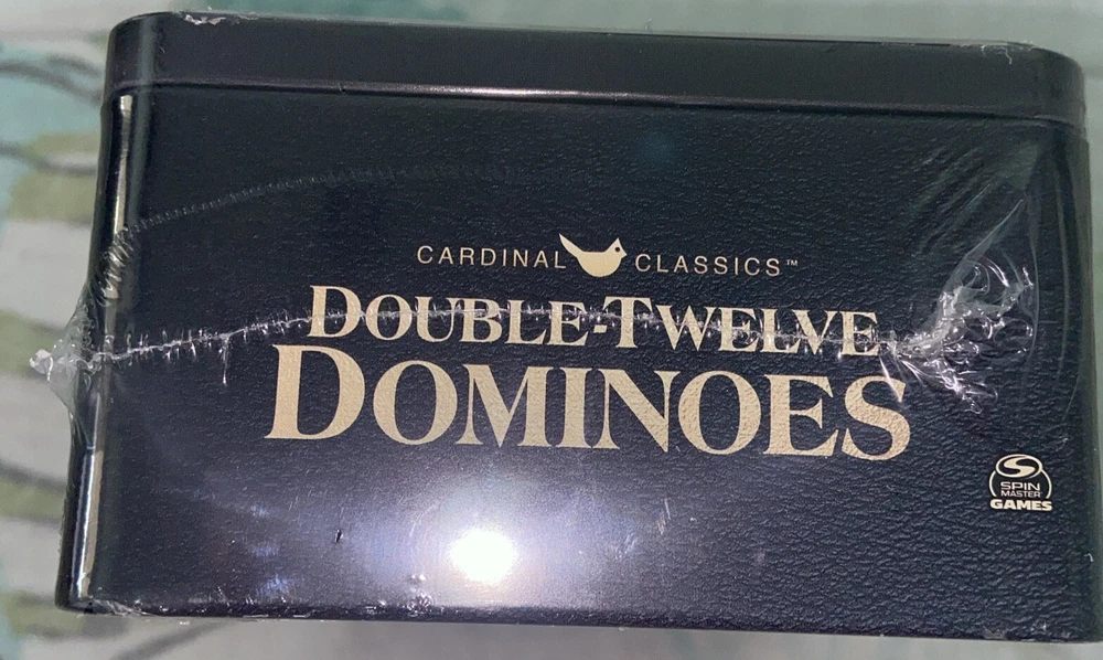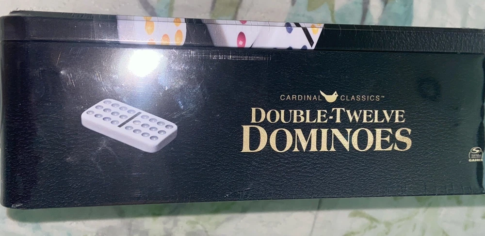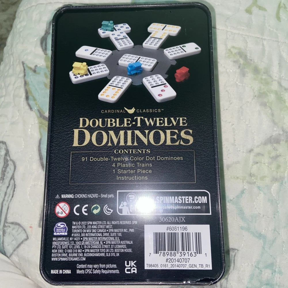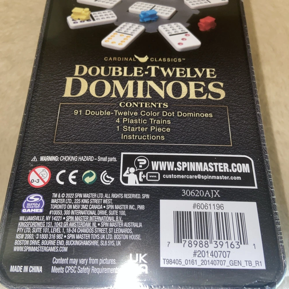 Get ready for hours of fun with this Cardinal Classics Double-Twelve 91 Dominoes set. This set comes in a convenient storage tin and includes 4 plastic trains. It's perfect for game nights with family and friends or as a gift for domino lovers. With the ability to play a variety of different games, this set is a must-have for any game collection. Made in China. Contents include s 91 dominoes, 4 plastic trains, 1 starter piece, instructions.