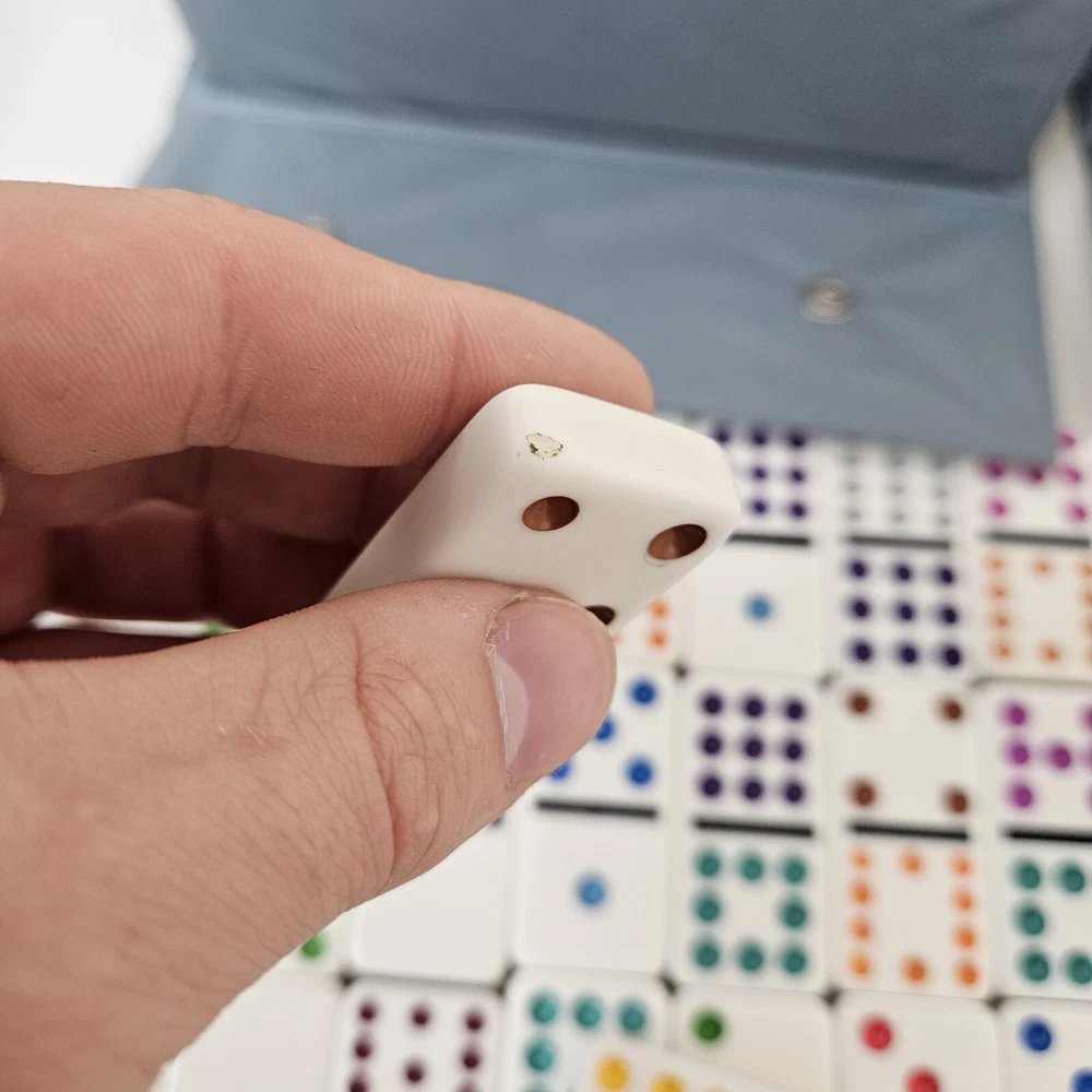 1. This set is perfect for domino lovers who don’t mind a little wear! The jumbo color dots are easy to read, and the sturdy case keeps everything organized. Sure, there are some stains and chips, but they don’t affect gameplay—just adds character. Great value for casual players who want a solid set without paying full price. Love that it comes with the original box too!