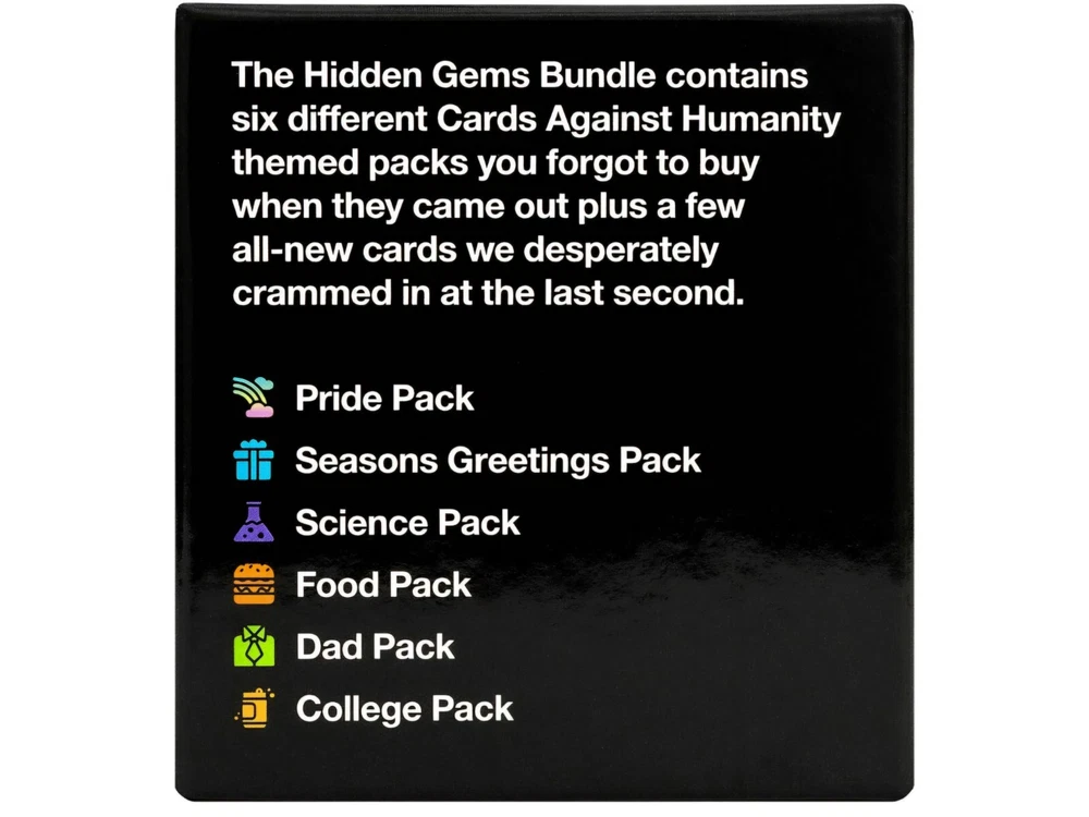 This Cards Against Humanity Hidden Gems Bundle includes 7 packs of cards, each with unique cards and expansions. The game is perfect for 3 or more players, and the packs contain cards with various animal themes. The cards are printed in China and come in their original packaging. This bundle is a great addition to any card game collection, and it has won the Deutscher Spiele Preis award. The cards are suitable for players of all ages, from 12 months and up.