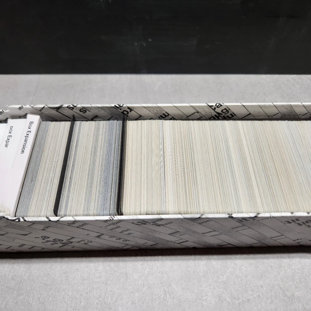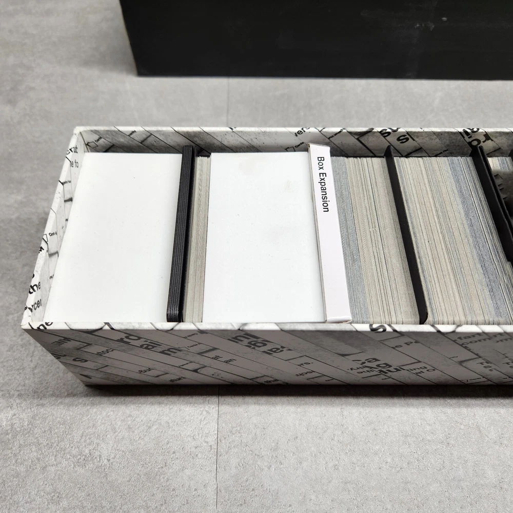Cards Against Humanity The Bigger Blacker Box Large Storage Case with Expansions Description: Organize your Cards Against Humanity collection with The Bigger, Blacker Box , the ultimate storage case designed to hold the base game and numerous expansion packs. This sturdy, oversized box provides ample space for all your Cards Against Humanity cards, including the base game, expansions, and even more future additions. Key Features: Expansive Storage: Designed to hold the Cards Against Humanity base game and multiple expansions. Durable Construction: Keeps your cards organized and protected. Includes Dividers: Comes with internal dividers to help separate different sets. Essential for Fans: Ideal for dedicated Cards Against Humanity players looking to keep their collection in one place. Condition: Good pre-owned condition. The exterior box shows minor wear, as pictured, but overall structure is solid and ready to organize your card collection. Special Notes: The Bigger, Blacker Box is the perfect accessory for any Cards Against Humanity fan looking to store and organize their growing collection. Great for parties and gatherings where you want all expansions available in one convenient place.
