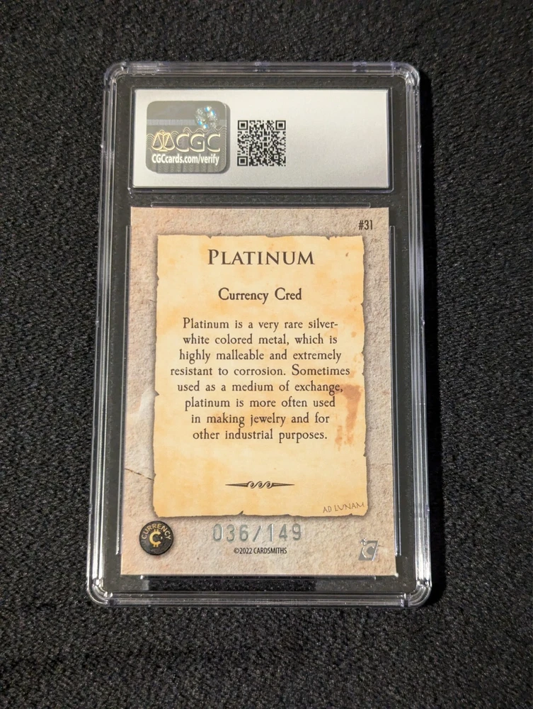 Cardsmiths Currency Series 1 - #31 BEAR+ Gemstone Collection (Beryl, Emerald, Amethyst, Ruby, and Gold). All cards are graded Excellent/Near Mint+ or higher by CGC and have sequential grading numbers. The amethyst gemstone is an Alpha/First print. Beryl Gemstone Refractor - Serial 036/149 - CGC graded 8 NM/Mint - 1401015132021 Emerald Gemstone Refractor - Serial 76/99 - CGC graded 6.5 Ex/NM+ - 1401015132022 Amethyst Gemstone Refractor - Serial 01/49 Alpha - CGC graded 7.5 Near Mint+ - 1401015132023 Ruby Gemstone Refractor - Serial 05/25 - CGC graded 7.5 Near Mint+ - 1401015132024 Gold Gemstone Refractor - Serial 08/10 - CGC graded 8.5 NM/Mint+ - 1401015132025