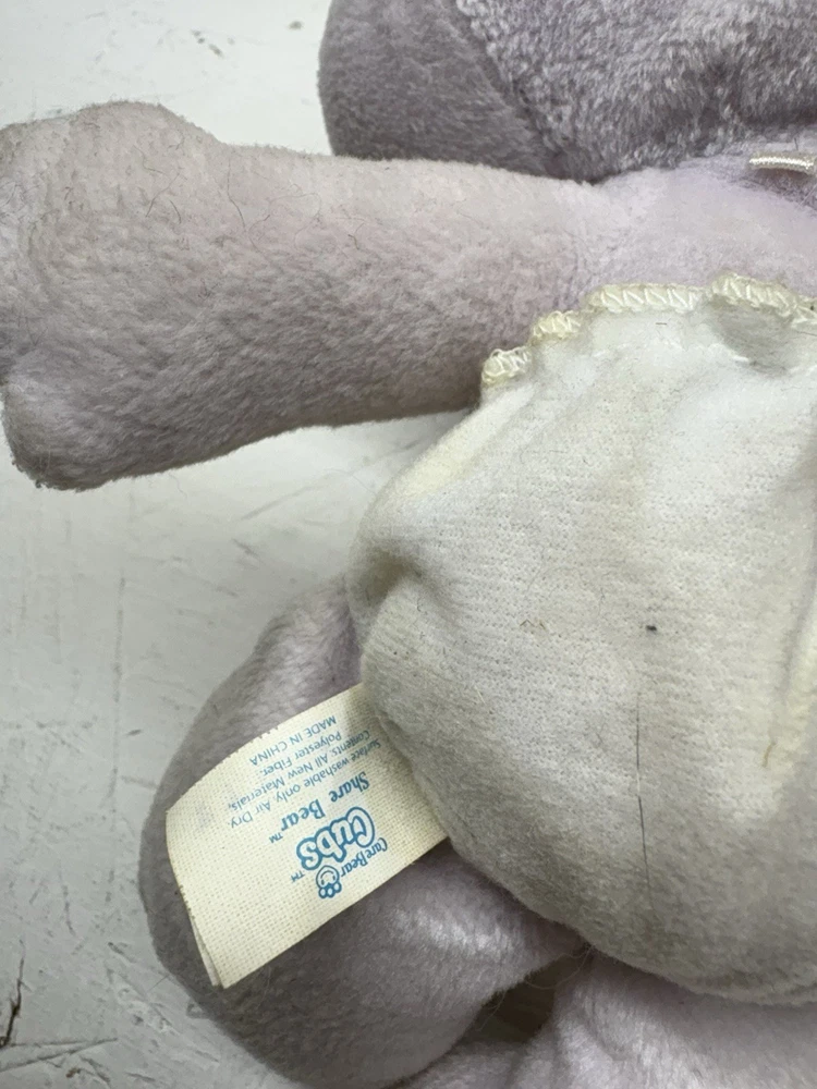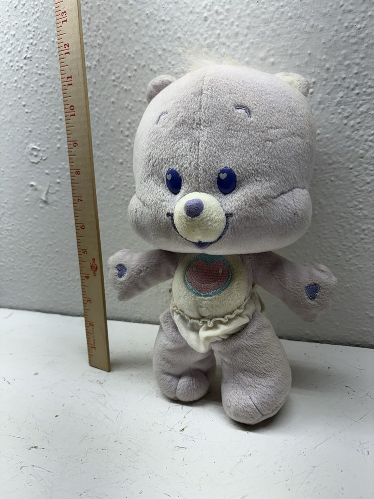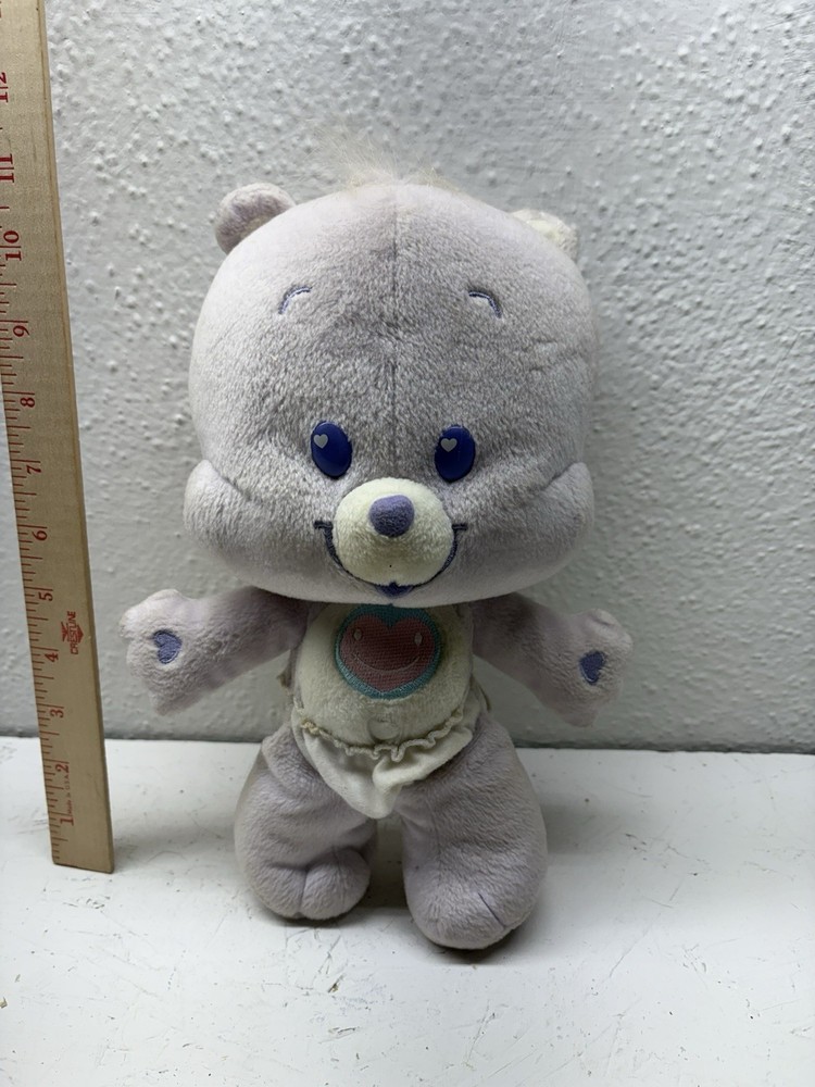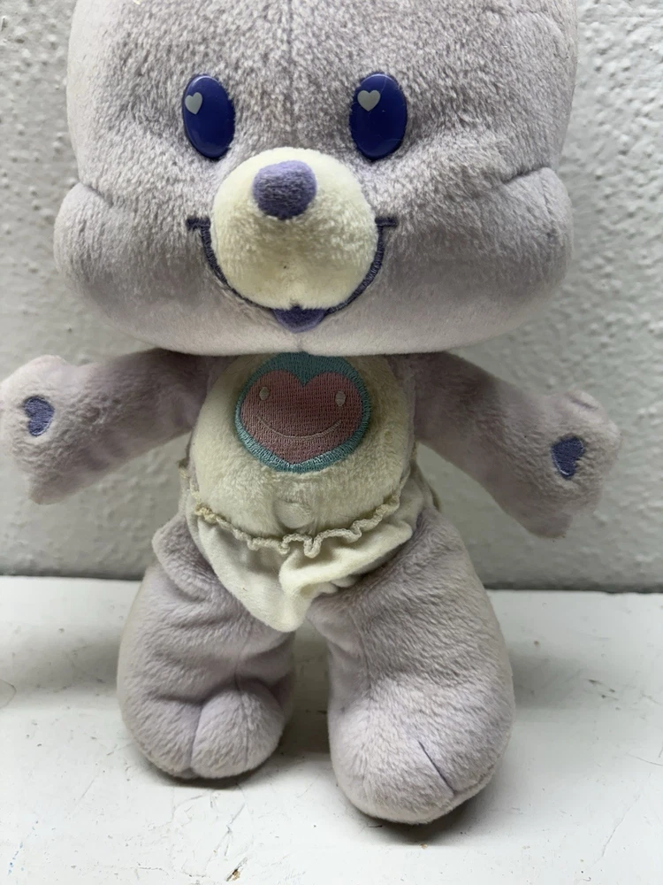 Adorable and cuddly Share Bear Cub from the Care Bears Cubs™ collection! This plush baby version of the classic Share Bear features soft lavender fur, a pastel heart belly badge, and a removable cloth diaper. Rare and hard to find! 💜 Details: • Character: Share Bear (Cubs version) • Official Care Bears Cubs™ plush • Approx. 10” tall • Purple fur with blue heart belly badge • Wears original diaper • Tag reads: Surface washable only. Polyester Fiber. Made in China. 📦 Condition: Pre-owned. Gently loved with minor surface wear and a few loose threads on the diaper (see photos). No holes or major stains. From a smoke-free home. Perfect for collectors of vintage Care Bears or nostalgic gifts for fans!