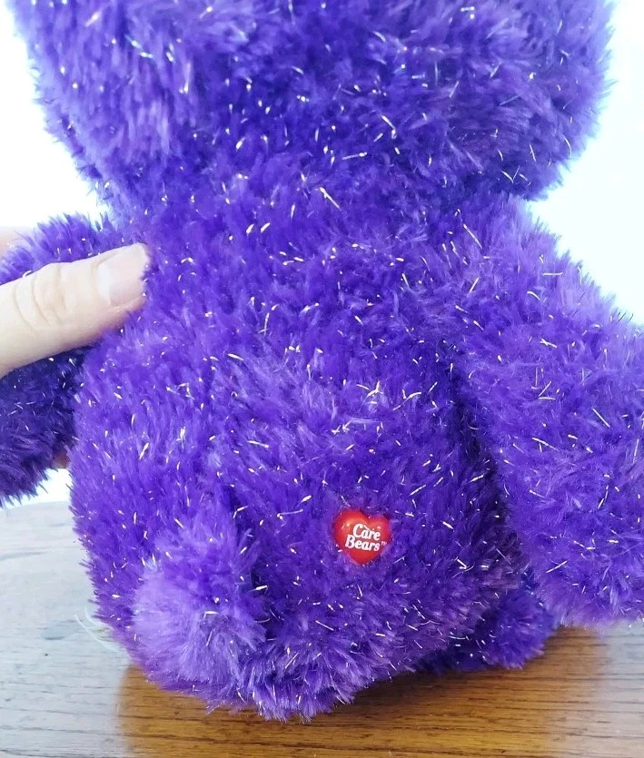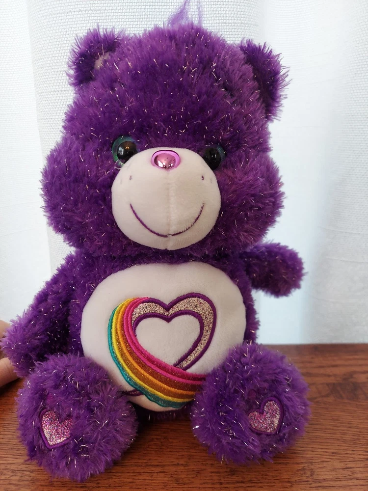This is a 13-inch plush Care Bears Rainbow Heart bear from the 35th Anniversary collection. It features a purple sparkle design, manufactured in 2017 in China. With a contemporary age range, this adorable bear is part of the Care Bears brand and recommended for ages 2 and up.
