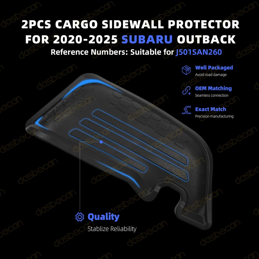 Features & details 【 Compatible with 】 2020-2025 Subaru Outback 【 Manufacturer Part Number 】J501SAN260 If you are not sure about the part fitment to your vehicle, please supply your Vehicle Model / VIN number / OE Part Number we will check it for you! 【 Description 】 Type: Cargo Sidewall Protector Set Material: Rubber Features: Waterproof Attachment Type: Insert Fitment Type: Direct Replacement Placement on Vehicle: Rear, Cargo/ Trunk 【 Features 】 Protection. Extend protection to the rear cargo and wheel well trim panel areas with the Cargo Sidewall Protectors. Provides optimal protection in the rear cargo area when used in conjunction with the Rear Seatback Protector and Cargo Tray. Durability. Durable construction, engineered for precise fit and texture-matched to complement the functionality and appearance of the Rear Seatback Protector and Cargo Tray. Easily removable and washable. T he Cargo Sidewall Protectors can be easily removed, rinsed clean and easily reinstalled. These sidewall protectors maintain their appearance and functionality over time, making essential accessory for maintaining your vehicle's interior in excellent condition. 【 Package includes 】 2 Pcs Left & Right Cargo Sidewall Protector Set 【 Note 】 Compatibility Chart is for the reference only. The best way to check compatibility is to check the Part Number on your old unit if possible. Please allow the slight color difference caused by the shooting light and 1-3cm error due to manual measurement, and make sure you do not mind before you place the order. 【 Service & Warranty 】Purchase from DASBECAN, enjoy 1 year no worries-warranty, whenever you met issue when installing or using, please contact us via eBay Message, and we will reply within 24 hours and help solve the problem. Customer Question & Answers Q1: Will This Part Fit My Vehicle? We list all the compatiblity, if your vehicle does not show up on the compatibility table at the top of our listings, welcome you to contact us for free consulation before purchasing a product. Q2: Does they come with warranty? All of our product comes with 1-year warranty, but some times you need to pay the shipping fee. Q3: How to use it? If you don't know how to install this accessory, welcome to contact us, we will provide you with a video guide. Payment Shipping Warranty & Service Returns/Exchanges Contact us Payment Most of the payment methods are available, such as Paypal, Payoneer, Credit Card. Within 1 day of receiving your payment, we will start processing your order. Shipping All Items Will Be Ship Within 1working Days, and We Will Ship out All Orders As Soon As Possible After Payment Verified, Please Allow up to 1-6 Business Days for Delivery. Why Choose the Us Stock? 1. Us Local Shipping, No Extra Customs Cost. 2. Fast Delivery: 1-6 Working Days Delivery. Warranty & Service If the item is installed or defective after 30 days , please check our warranty page. We offers an one-year warranty on all parts sold unless otherwise noted. We aim to provide the high quality auto parts and accessories, but some rare cases happened. We offer following options for warranty service: If the item fails after installation : You must provide your valid purchase record , with photos or videos proving the product's own fault via eBay messages, after which we will provide you with a replacement warranty service. Please note that this warranty only applies to automotive parts installed in full compliance with the installation instructions, as well as return requests for which photos and videos proving the product's own fault are provided to us. If we send you the wrong parts: You can promptly send us a message to inform us, and we will prioritize arranging a replacement. Meanwhile, we will provide a return label for you to send back the incorrectly shipped items. Shipping Damage. We use UPS Ground, Fedex and USPS First class to ship all items . Buyer should check the parcel condition before sign the signature . Please refuse to sign the parcel if you noticed something wrong , and get a shipping damaged report from carrier. We will send you a replacement at the same day once you provide the shipping damage report . We won’t cover any lost if buyer don’t check the parcel condition before the signature. This warranty does not cover any expenses incurred in the removal and / or re-installation of the item. Specifically, this warranty does not cover any expenses for time, rental, or other parts not purchased from us, or any labor. This warranty does not apply, and will be voided, if the item sold has been damaged by abuse, misuse, accident, neglect, or alteration, or if it has been repaired by anyone . Your warranty will be null and void if the item fails due to improper installation or use. If the item sold should prove defective in material or workmanship within the warranty period, please contact us immediately. Returns/Exchanges Please contact us via eBay messages between 9:30 a.m. and 6:00 p.m. PDT, (Monday to Friday) to obtain a return label with a return number. Without a Return Authorization Number, we will not be able to identify your return request. All returns must be done within 30 days after receiving the package. Parts must be new and unused in the original condition : including box, packaging and all other accessories,or we will charge you a partial costs. Return requests initiated directly on the eBay platform may not be processed promptly due to delays in eBay's procedural timeline. We highly recommend that you contact us first to receive priority processing. If you receive an item that is incorrect, damaged, defective, or not as described, please contact us and provide relevant evidence (such as photos, videos, or other valid proof of the issue). We will cover the associated costs and arrange for a partial refund, full refund, or replacement. Contact us If you encounter any problems during purchase or use, please contact us via eBay message direc