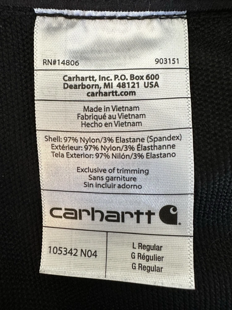 Size: L Performance/Activity: Hiking, Walking Occasion: Casual, Workwear Style: Rain Coat Outer Shell Material: Nylon Closure: Zip Fit: Relaxed Theme: Classic, Outdoor Department: Men Season: Fall, Spring, Summer, Winter Garment Care: Machine Washable Color: Black Features: Full Zip, Pockets Seller Notes: “In great condition - no flaws.” Type: Jacket Size Type: Regular Brand: Carhartt
