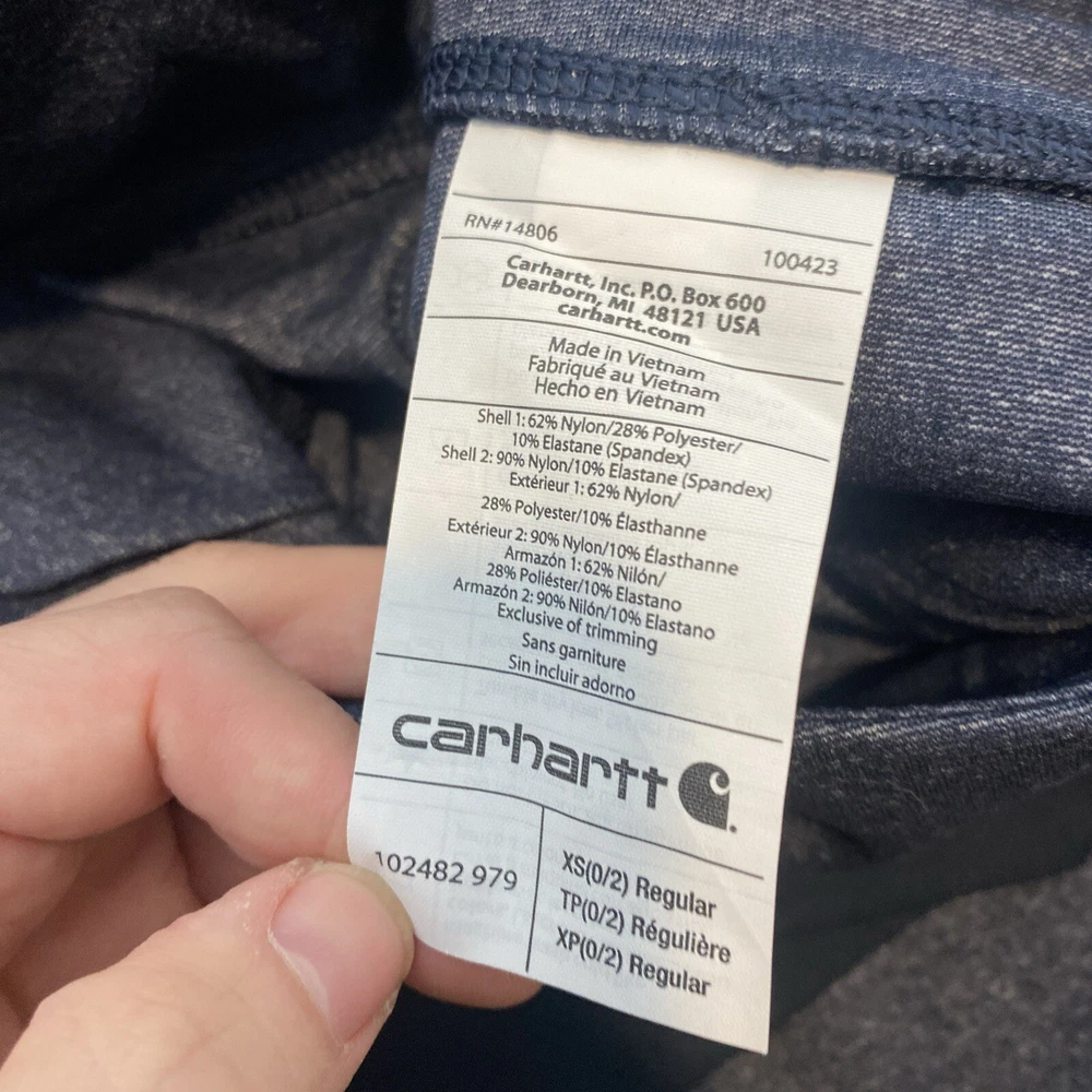 Style: Ankle Occasion: Workwear, Travel, Casual, Business Vintage: No Season: Fall, Spring, Summer, Winter Fabric Type: Canvas Rise: Mid (8.5-10.5 in) Model: Carhartt Force Size Type: Regular Features: Pockets, Stretch, Comfort Fit: Regular Accents: Pocket gtin13: Does Not Apply Type: Pants Pattern: Solid Front Type: Flat Front Inseam: 29 in Theme: Work, Utitlity Brand: Carhartt Department: Women Size: XS Leg Style: Tapered Garment Care: Machine Washable Closure: Pull On UPC: Does Not Apply Material: 95% Nylon, 5% Spandex Country/Region of Manufacture: China Color: Blue