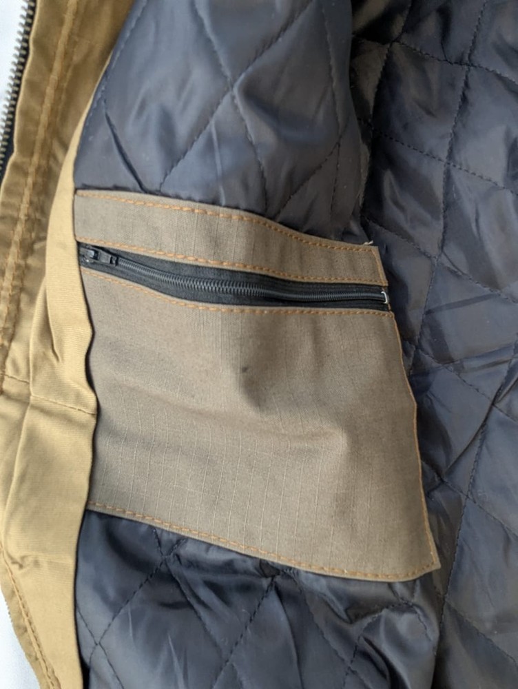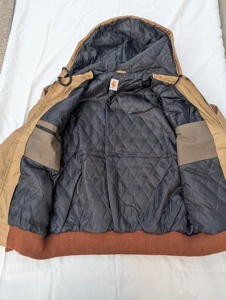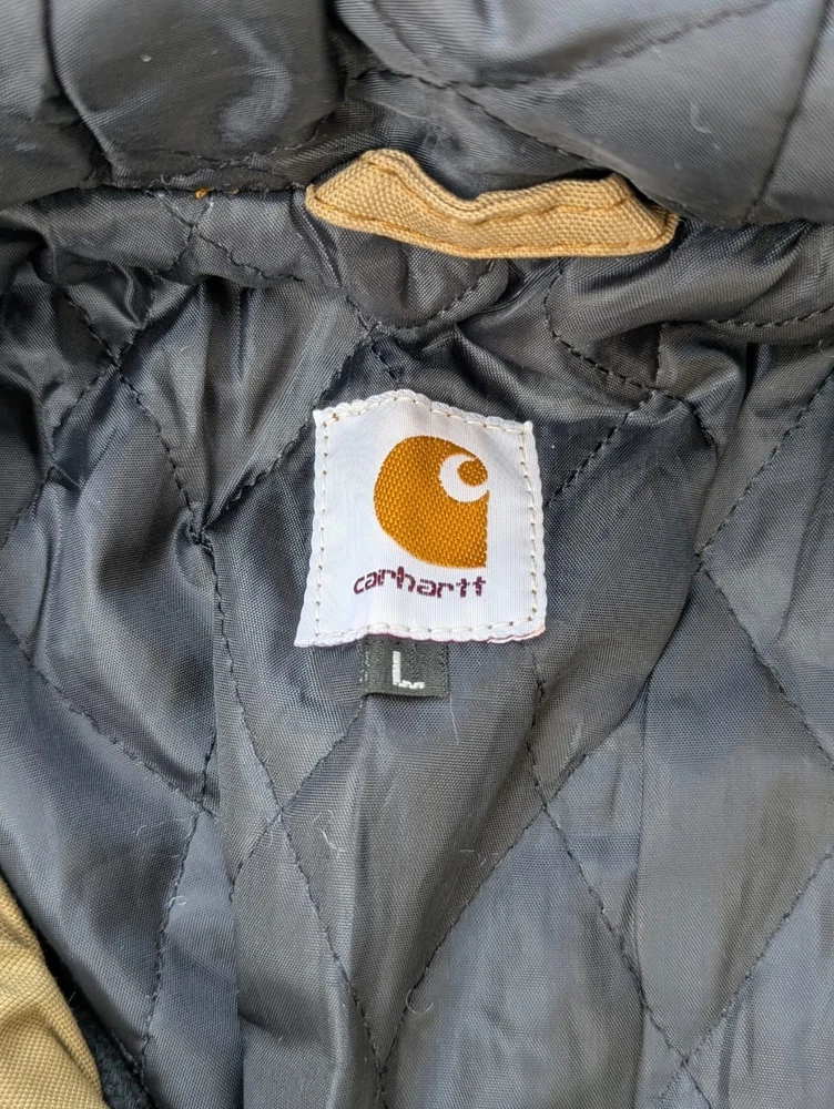 Carhartt Men's Sandstone Duck Active Jacket - Quilted Lined Up for sale is a classic Carhartt hooded work jacket in the iconic tan/brown colorway. This jacket features the "Sandstone" duck canvas finish with the leather Carhartt logo patch on the pocket. It has a warm, black diamond-quilted lining that makes it easy to layer over flannel or hoodies without bunching up. This item features the desirable "broken-in" workwear look with natural fading. Features: Heavyweight Cotton Duck Canvas shell. Black quilted nylon lining (Midweight insulation). Attached hood with drawstring. Rib-knit cuffs and waistband to keep the cold out. Two large front hand-warmer pockets. Interior zippered pocket for valuables. Heavy-duty brass front zipper. Measurements (Taken flat): Chest (Armpit to Armpit): 23.5 inches Length (Shoulder to Hem): 26 inches Tag Size: Large Shipping: Fast and secure shipping! Your item will be packed with care. Shipped withing 2-3 days. Estimated delivery time within 10-14 days.