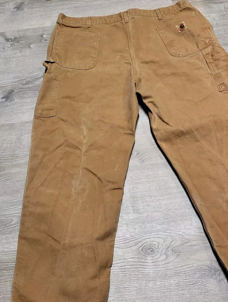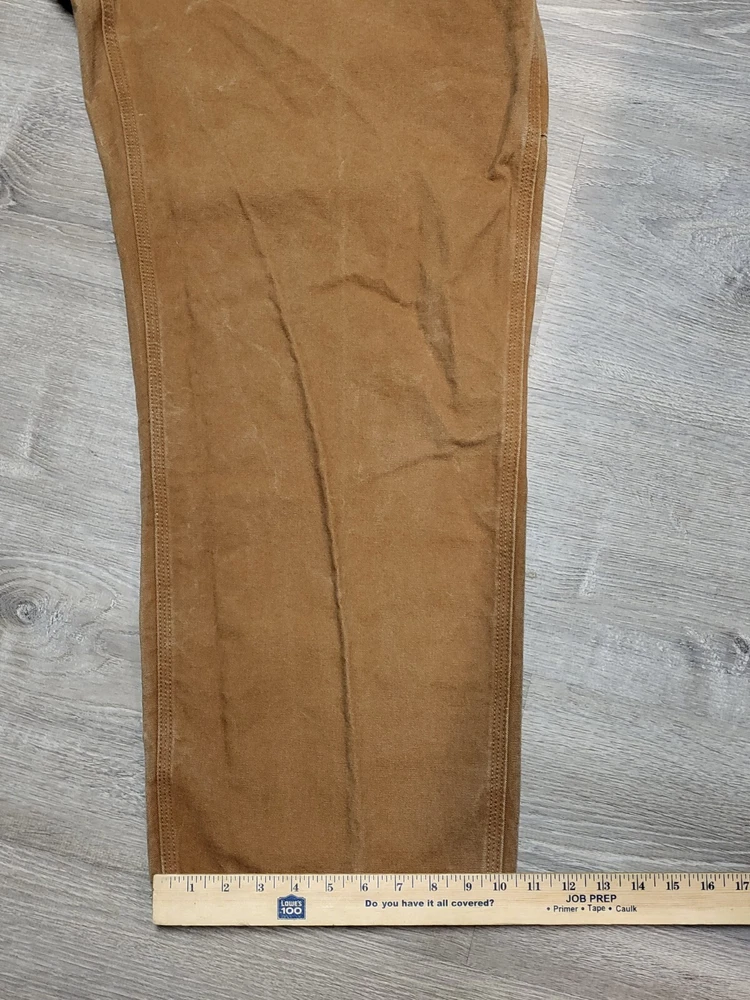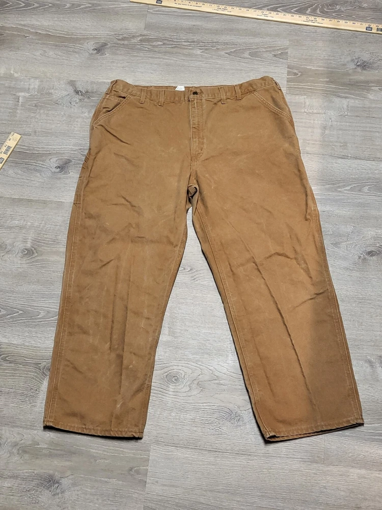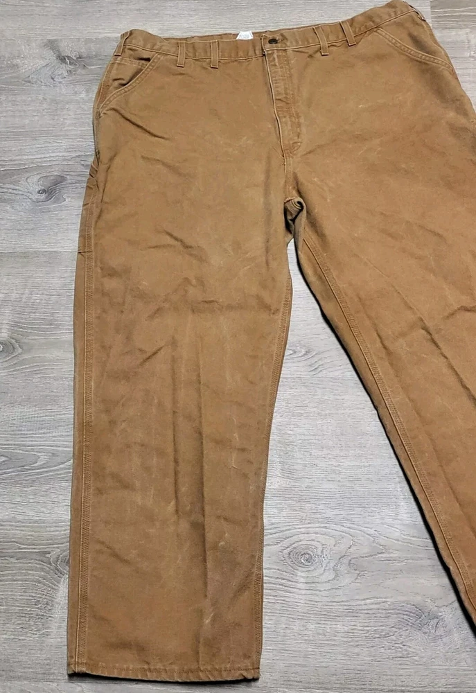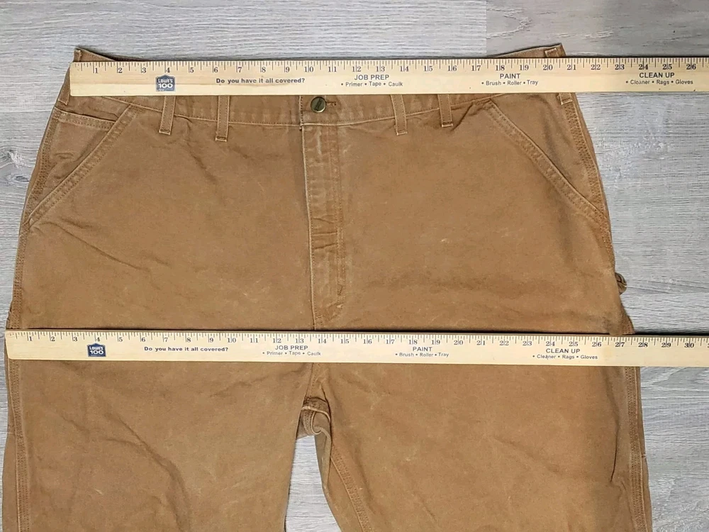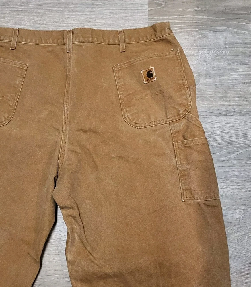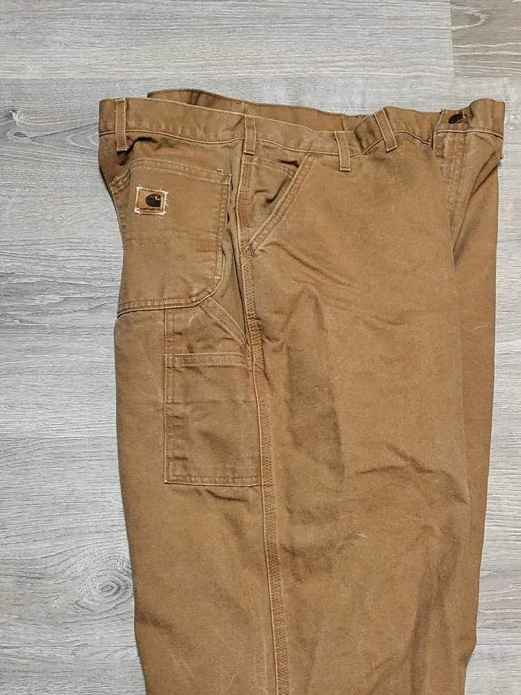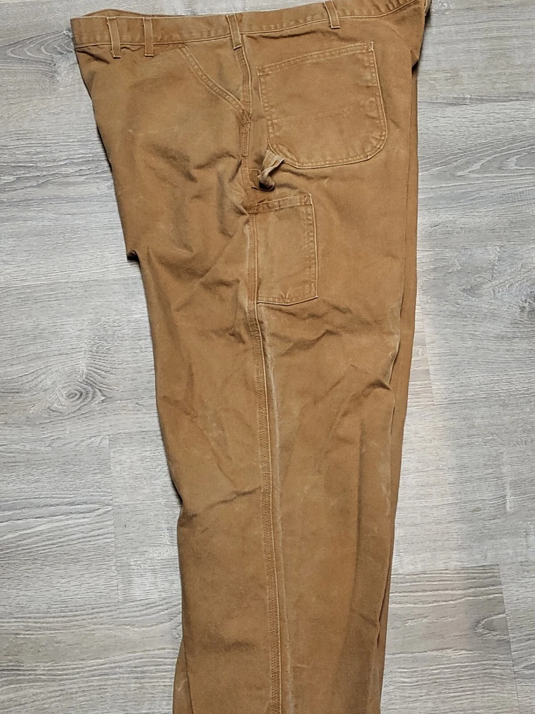 Enhance your work wardrobe with these Carhartt men's dungaree fit carpenter pants. Made of sturdy duck canvas fabric, these pants are perfect for outdoor and classic themed works. The pants feature a mid-rise waist, zip closure, and belt loops for a comfortable and secure fit. See pics for some discoloration, but no damage to the pants. With eight pockets, these pants provide ample space for your tools and personal items. The pants are machine washable, making them easy to care for. The brown color is accented with the Carhartt logo, giving it a classic look. These pants are perfect for any season, whether it's winter, summer, fall, or spring.