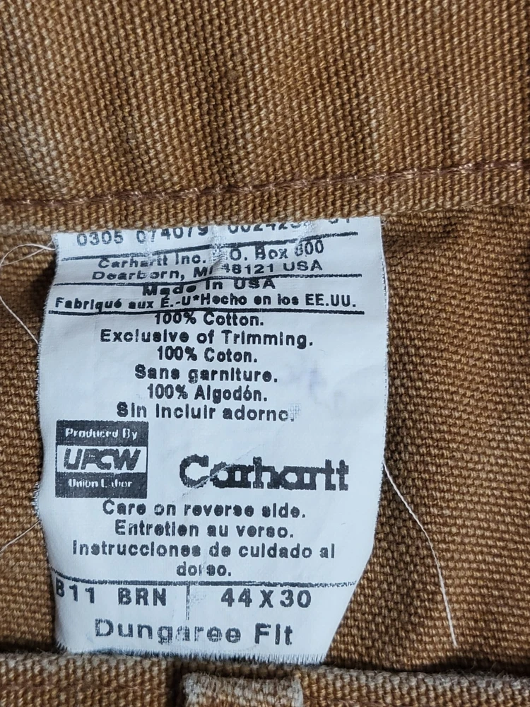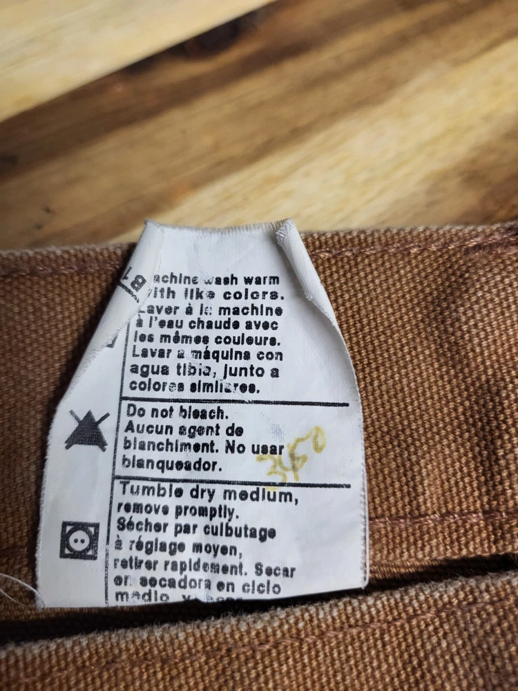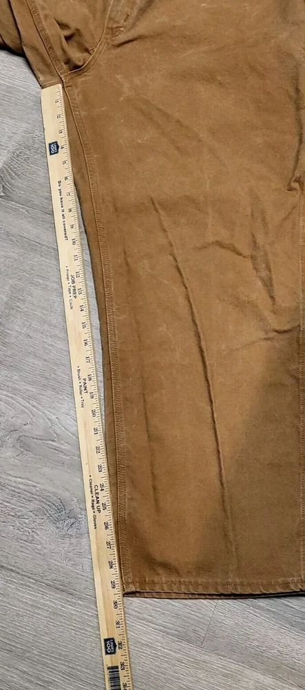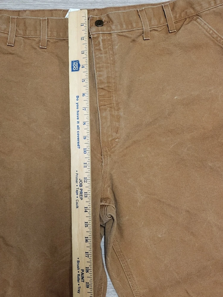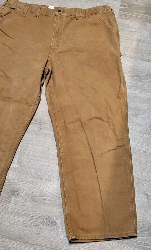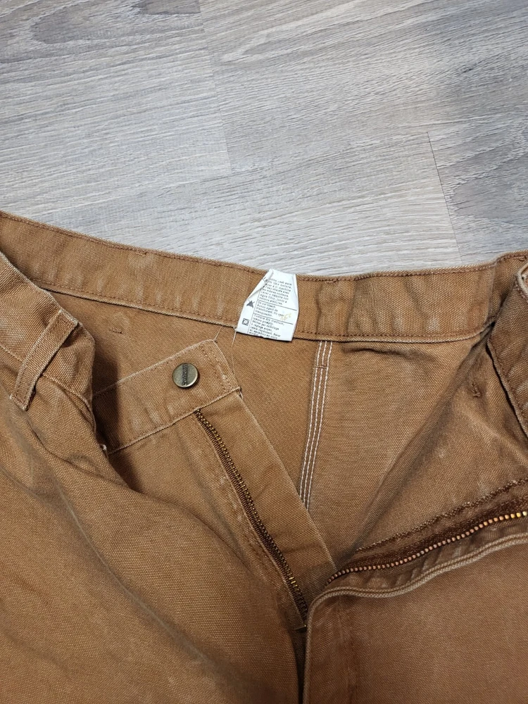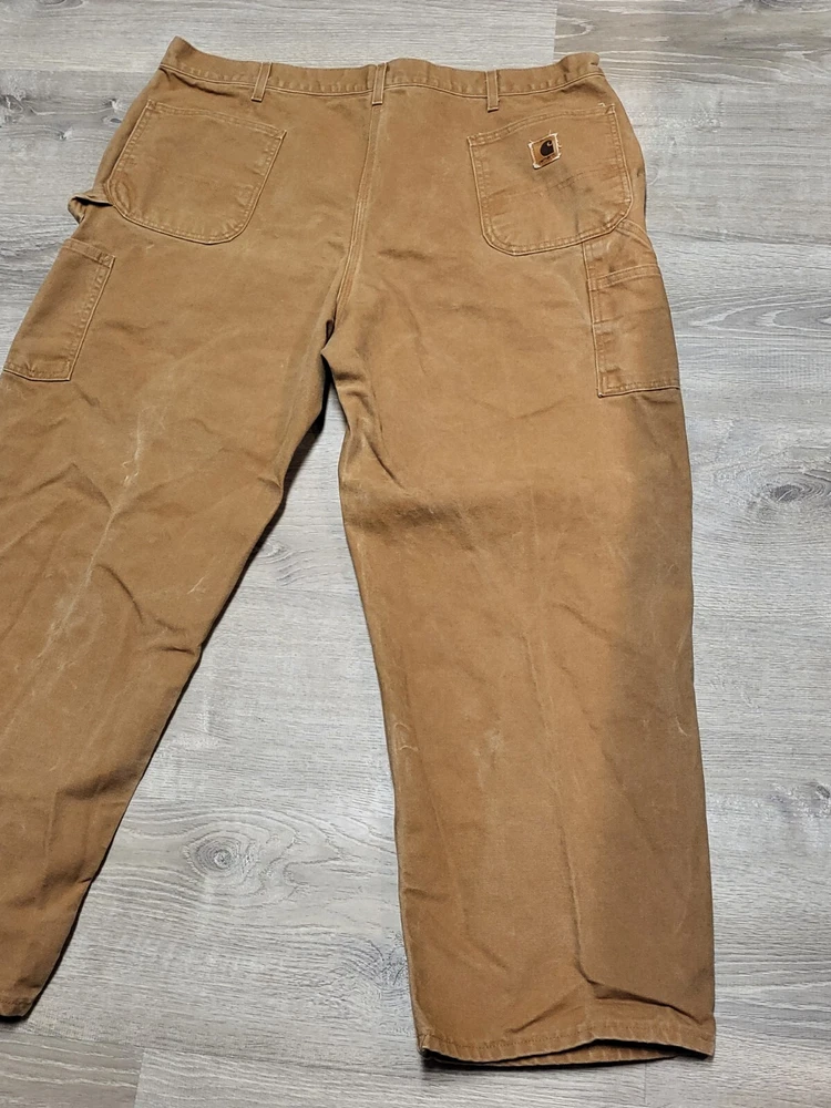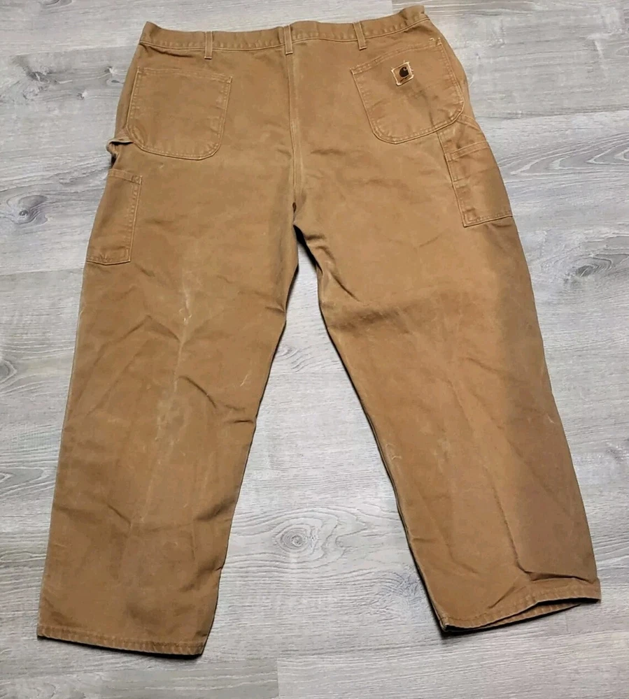 Enhance your work wardrobe with these Carhartt men's dungaree fit carpenter pants. Made of sturdy duck canvas fabric, these pants are perfect for outdoor and classic themed works. The pants feature a mid-rise waist, zip closure, and belt loops for a comfortable and secure fit. See pics for some discoloration, but no damage to the pants. With eight pockets, these pants provide ample space for your tools and personal items. The pants are machine washable, making them easy to care for. The brown color is accented with the Carhartt logo, giving it a classic look. These pants are perfect for any season, whether it's winter, summer, fall, or spring.