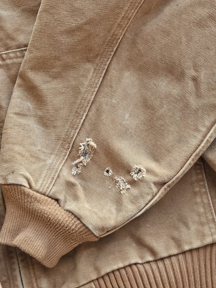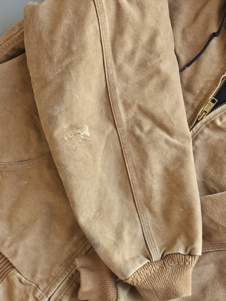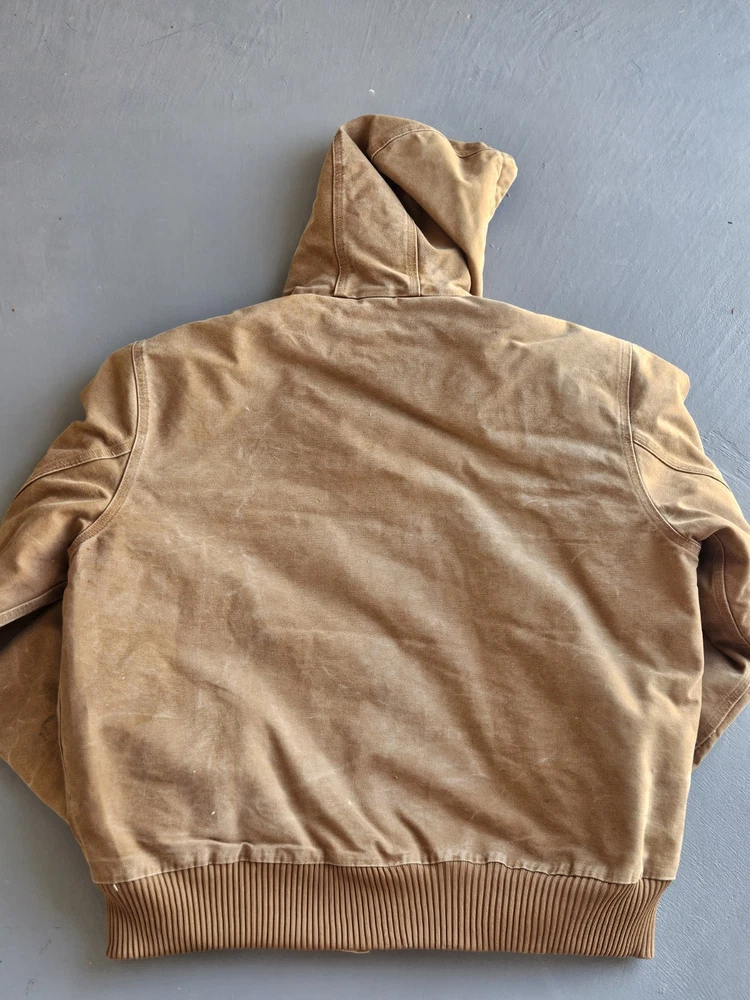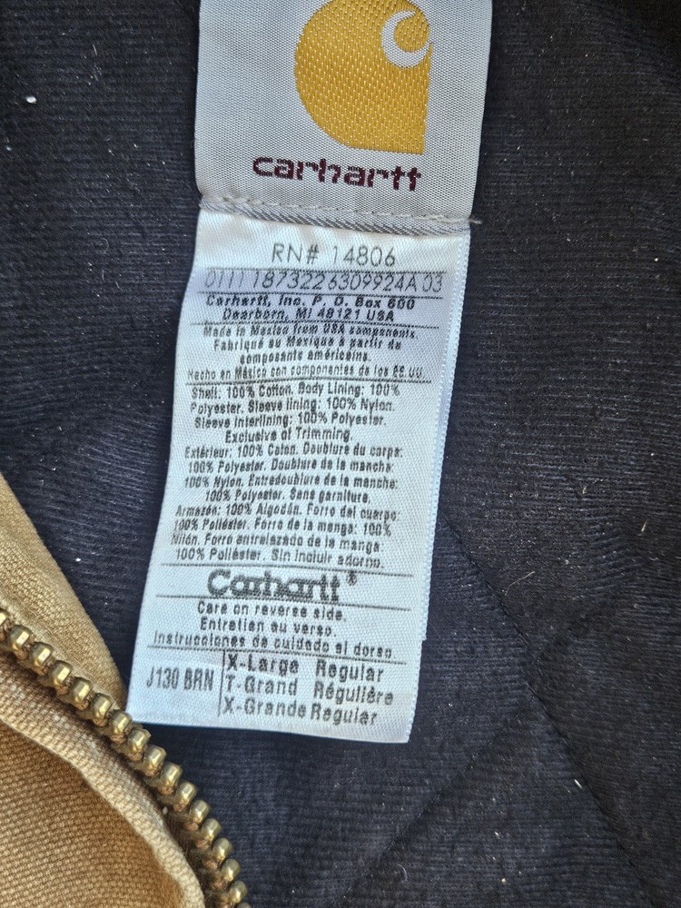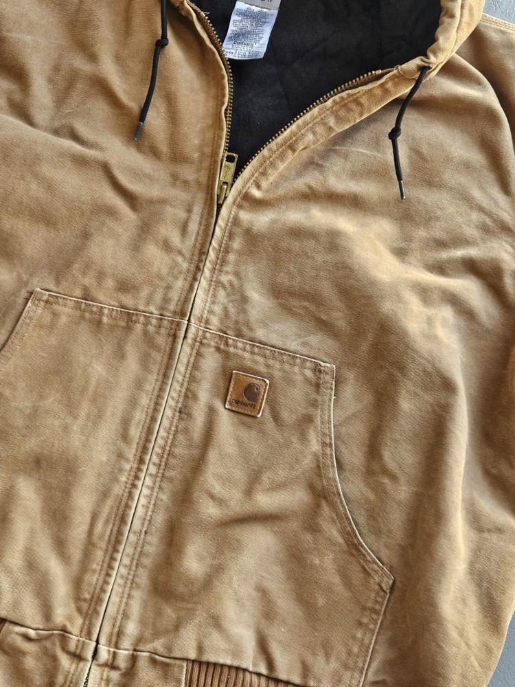 The Carhartt J130 Brown Heavy Duck Canvas Hooded Insulated Jacket in men's size XL is a vintage-style bomber jacket perfect for travel, casual, and workwear occasions. Made with cotton canvas outer shell material and lined with polyester, this jacket features a spread collar, zip closure, and various pockets for convenience. The brown color, embroidered logo accents, and USA-themed design add a touch of rugged style to this winter, fall, and spring essential. Machine washable and designed for walking, working, hunting, and hiking activities, this Carhartt jacket is both functional and fashionable. Has flaws but adds character to the work jacket