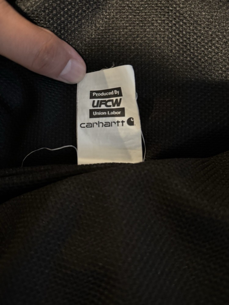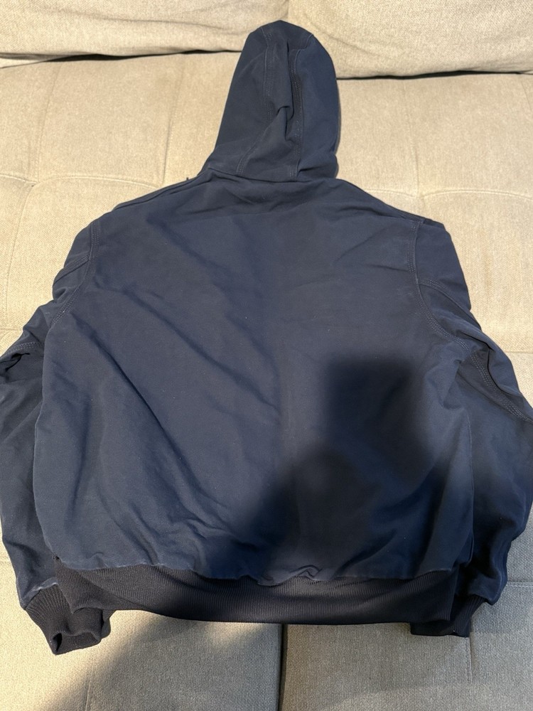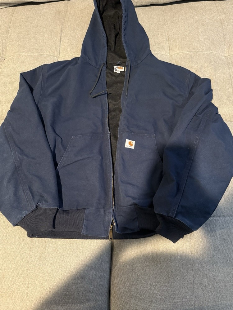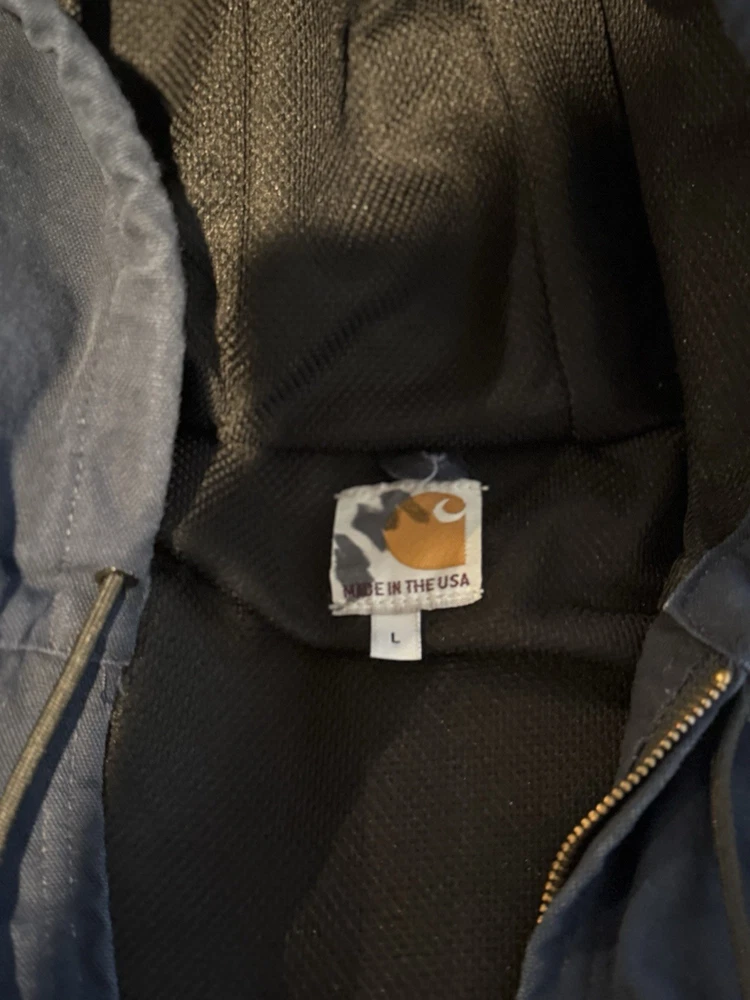 The Carhartt Jacket Men Size L in Navy Blue is a vintage USA-made bomber jacket featuring a full zip closure, making it perfect for travel, casual wear, and work. Made of durable cotton canvas with a polyester lining and insulation, this mid-length jacket is ideal for winter, fall, and spring seasons. The jacket bears the Carhartt logo and can be personalized with an embroidered company name, adding a unique touch to this classic piece of men's clothing.