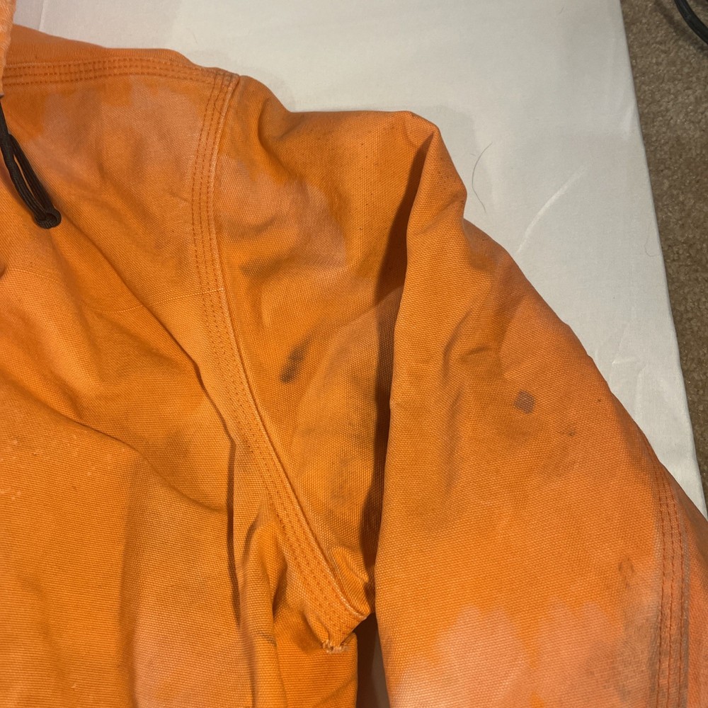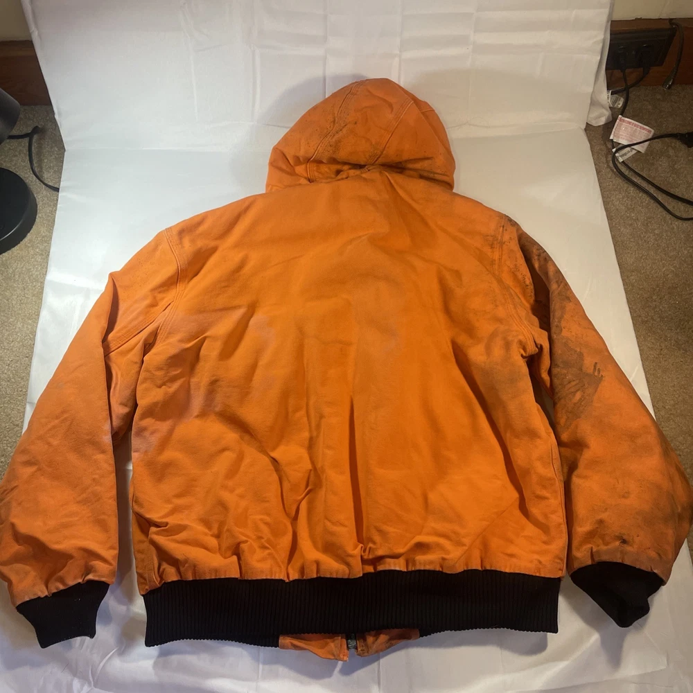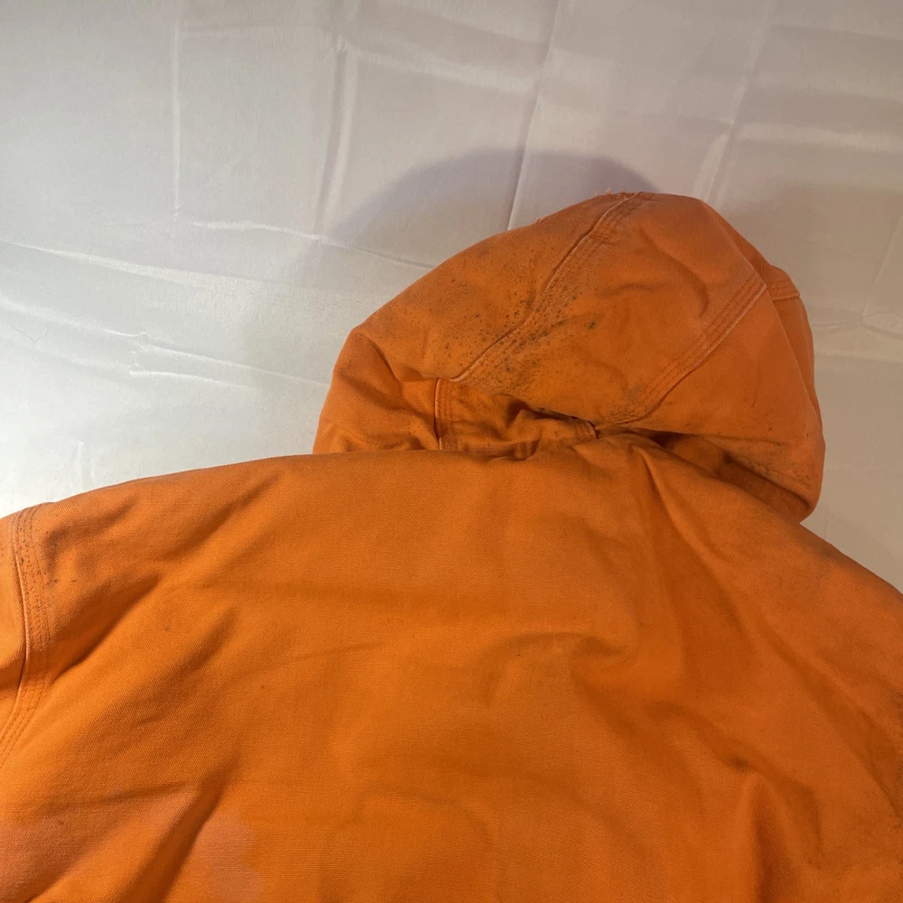 The Carhartt Men's J140 BLZ Size L Tall Orange Quilt Lined Duck Canvas Hooded Coat is a jacket suitable for casual and workwear occasions. Made with cotton canvas outer shell material and polyester lining, this jacket is insulated for added warmth. This jacket is used in fair condition, giving the exterior a classic, vintage, distressed look. The interior is in great shape. Check pictures and make your own judgment.