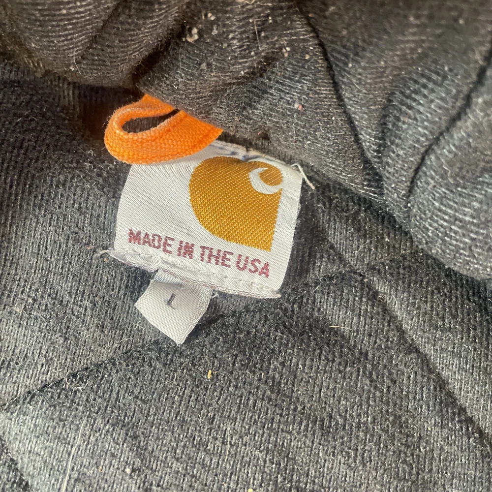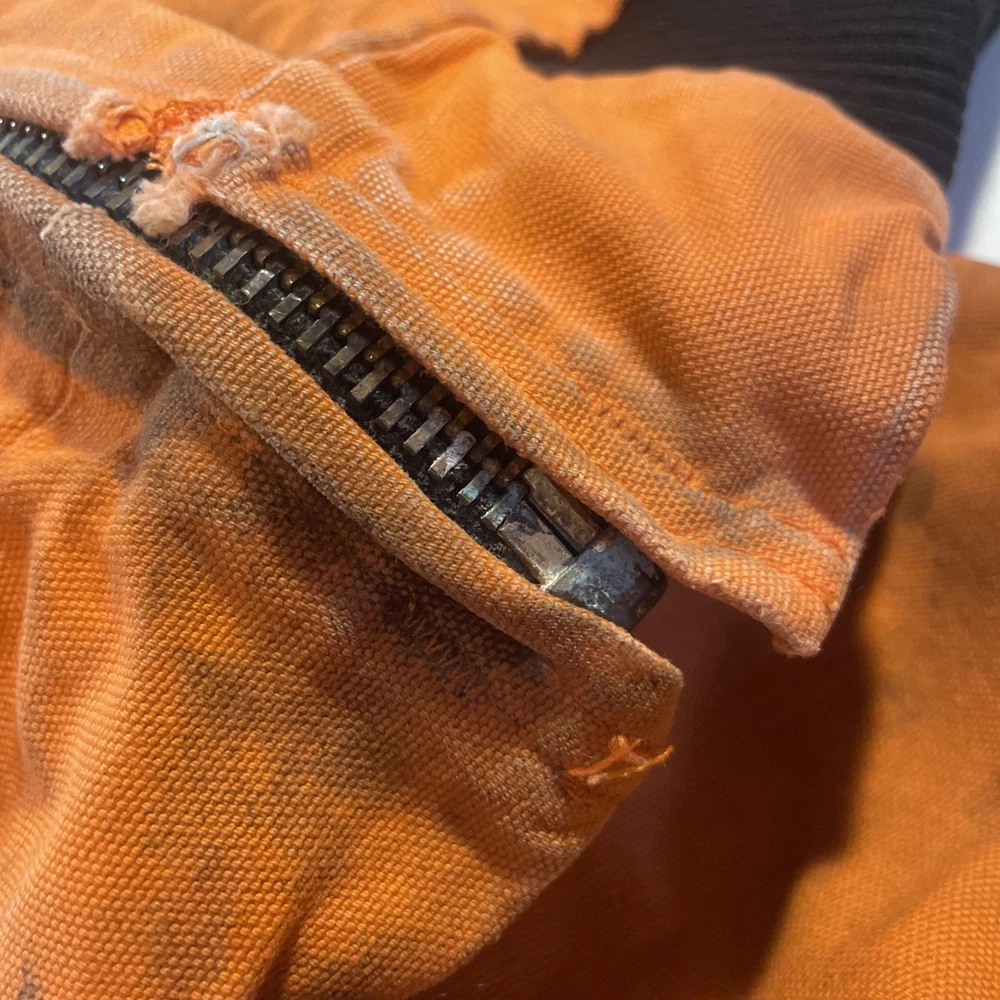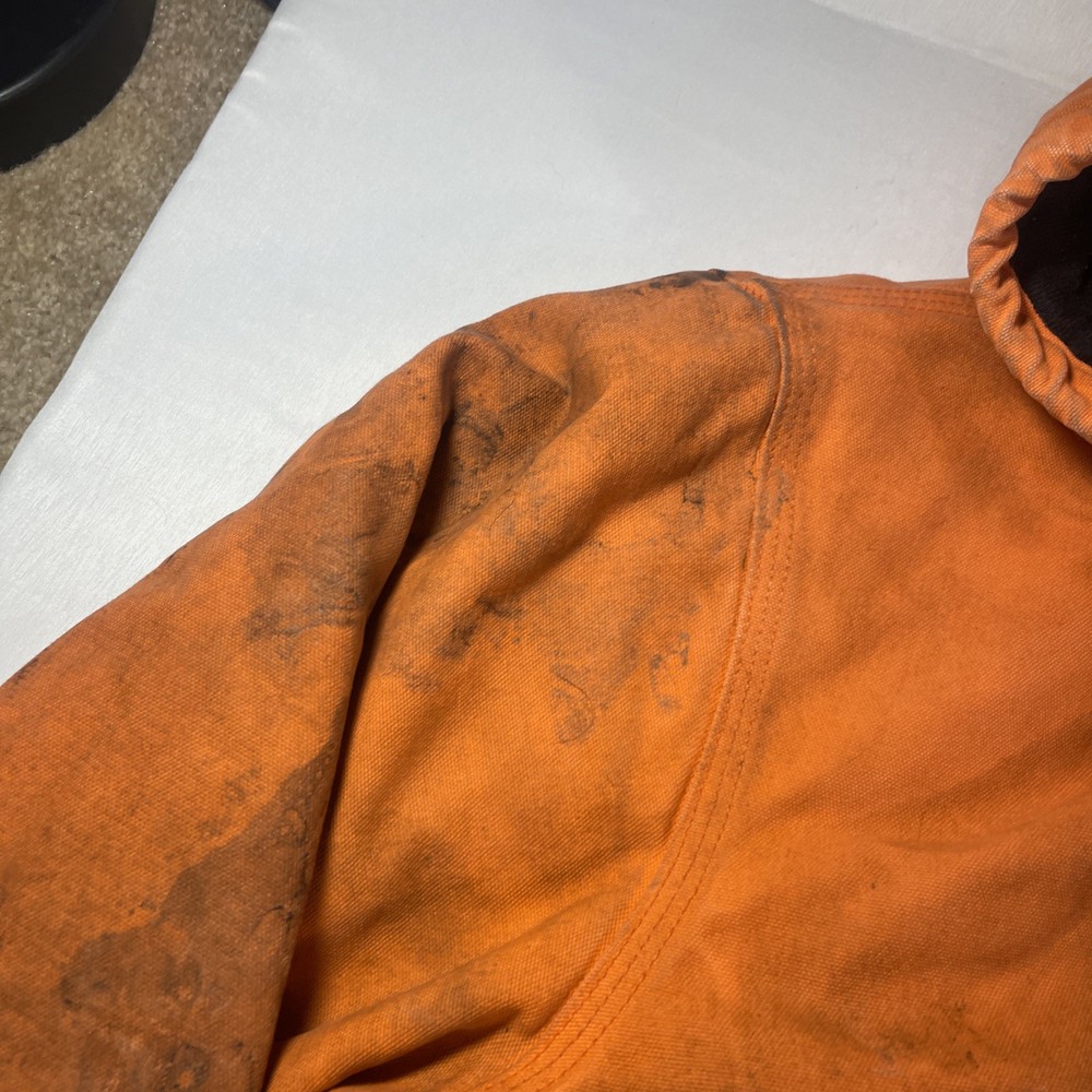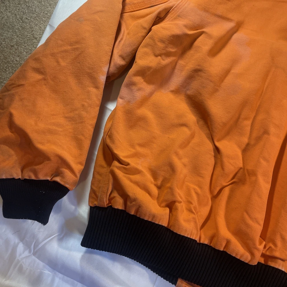 The Carhartt Men's J140 BLZ Size L Tall Orange Quilt Lined Duck Canvas Hooded Coat is a jacket suitable for casual and workwear occasions. Made with cotton canvas outer shell material and polyester lining, this jacket is insulated for added warmth. This jacket is used in fair condition, giving the exterior a classic, vintage, distressed look. The interior is in great shape. Check pictures and make your own judgment.