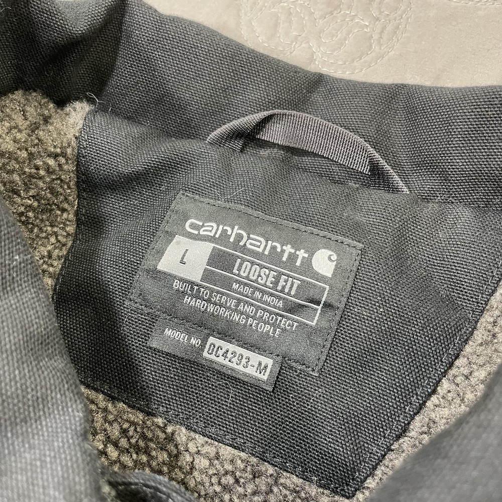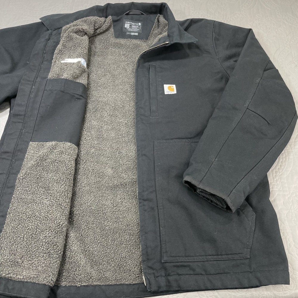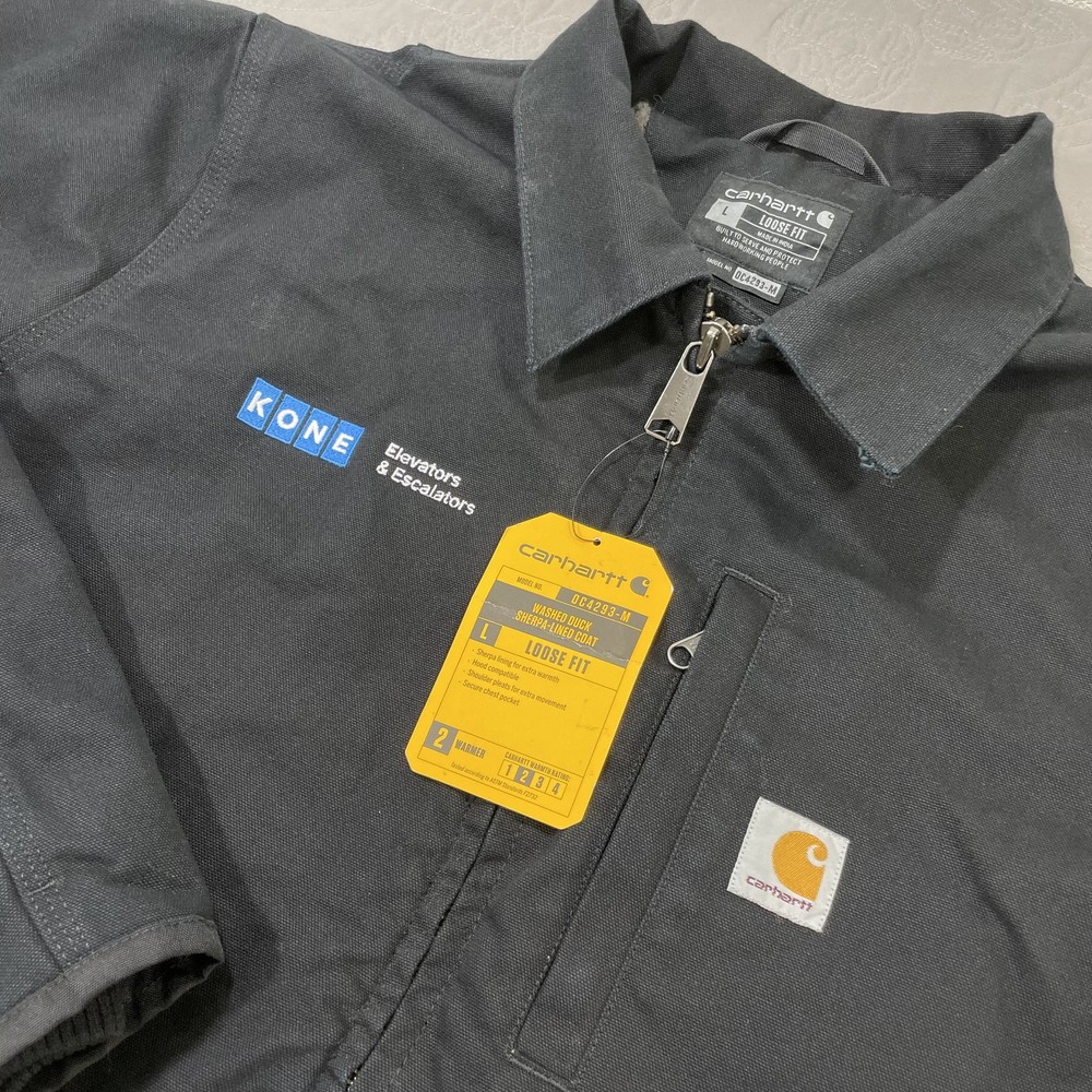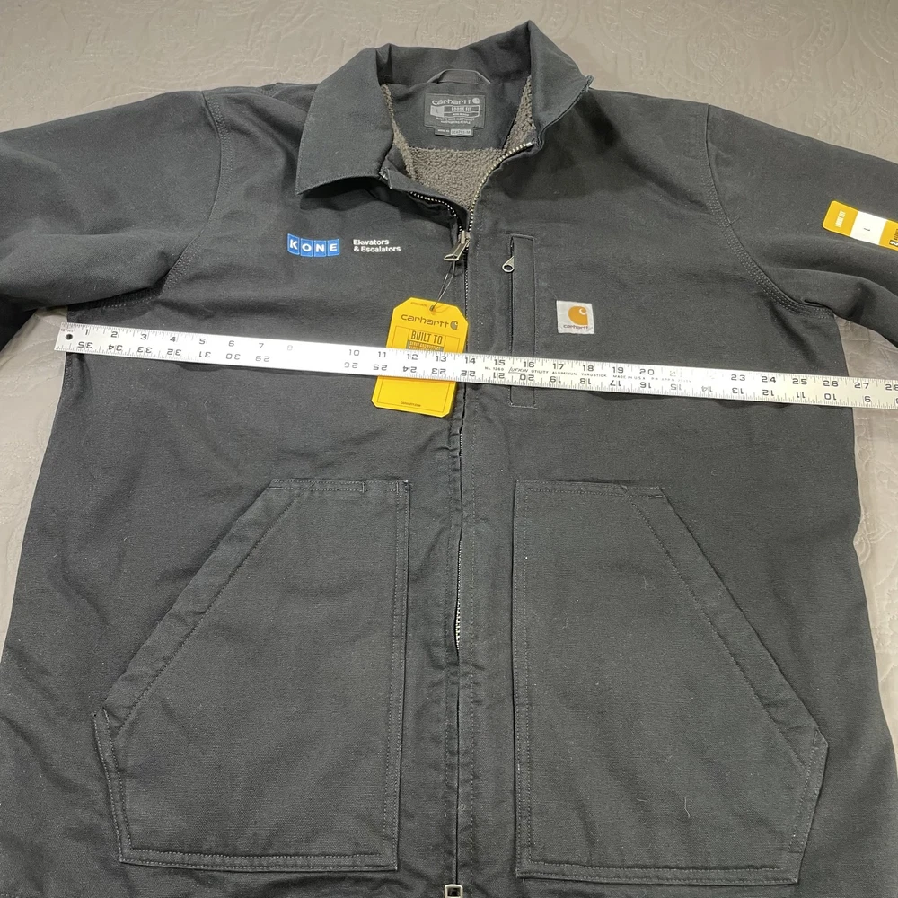 Carhartt Coat Mens Large Black Canvas Sherpa Lined Workwear Jacket Loose Fit Condition: Brand New with Tags — no visible flaws Shell: 100% cotton canvas, body lining: sherpa polyester fleece, sleeve lining: 100% quilted polyester Features full front zipper closure with Carhartt branded zipper pull Two large front pockets and one zip chest pocket Embroidery on chest: KONE Elevators & Escalators Carhartt signature logo patch on left chest pocket Heavyweight, durable canvas for reliable outdoor or worksite use Model code: OC4293-M; Tag size: Large (Mens) Loose Fit - designed for layering and ease of movement Color: Black exterior, gray sherpa fleece interior lining Approximate measurements (see photos): - Pit to pit: 26 in - Back length: 31 in - Sleeve length: 36 in Made in India