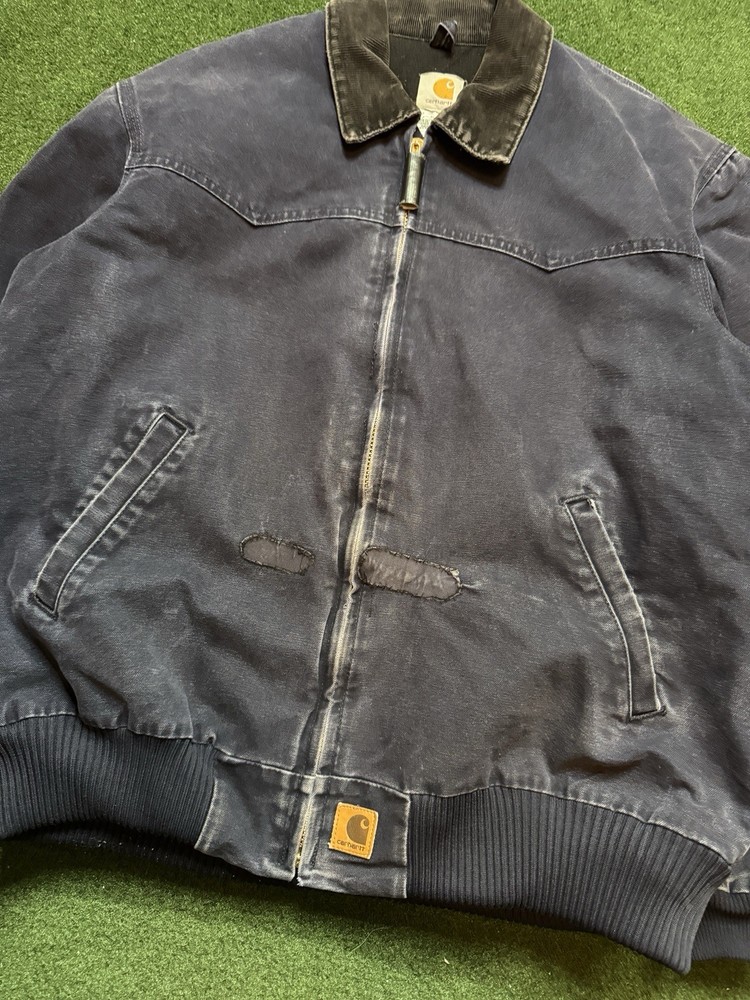Nicely Distressed and Faded navy blue Santa fe Carhartt Jacket. Two big repair patches on the front and pictured. Replaced zipper. Great condition apart from those two repairs.