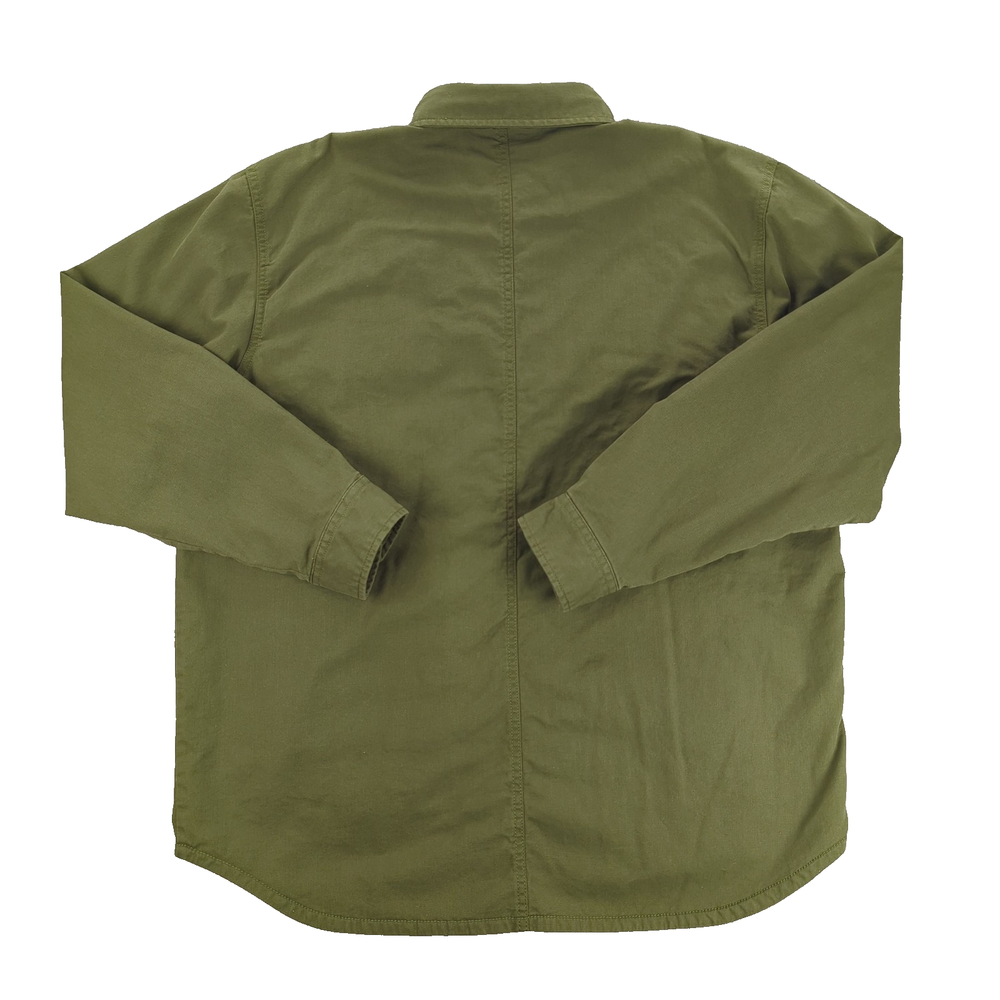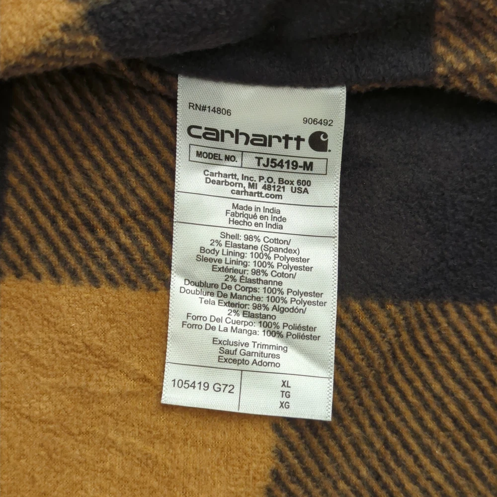 Carhartt Shirt Jacket Mens XL Green Rugged Flex Flannel Lined Workwear Condition: Gently worn, no visible flaws or stains. Light general wear only. All snaps, pockets, and stitching intact. Shell: 98% cotton, 2% elastane for rugged comfort and stretch Body/sleeve lining: 100% polyester soft brown and black buffalo plaid flannel Model: TJ5419-M (per interior label) Relaxed fit with roomy chest and body, designed for layering Snap front closure with two snap flap chest pockets and Carhartt logo patch Embroidered "ICBS Industrial Conveyor Belt Systems" patch on left chest Olive green exterior with contrast black and orange plaid lining Side-entry hand pockets, interior chest pocket for organization Machine washable. Tag says: Machine wash warm with like colors, tumble dry low, do not use fabric softeners. Care instructions and full material breakdown on attached tag Tag size: XL (Mens) Made in India Production: Fall 2022 season