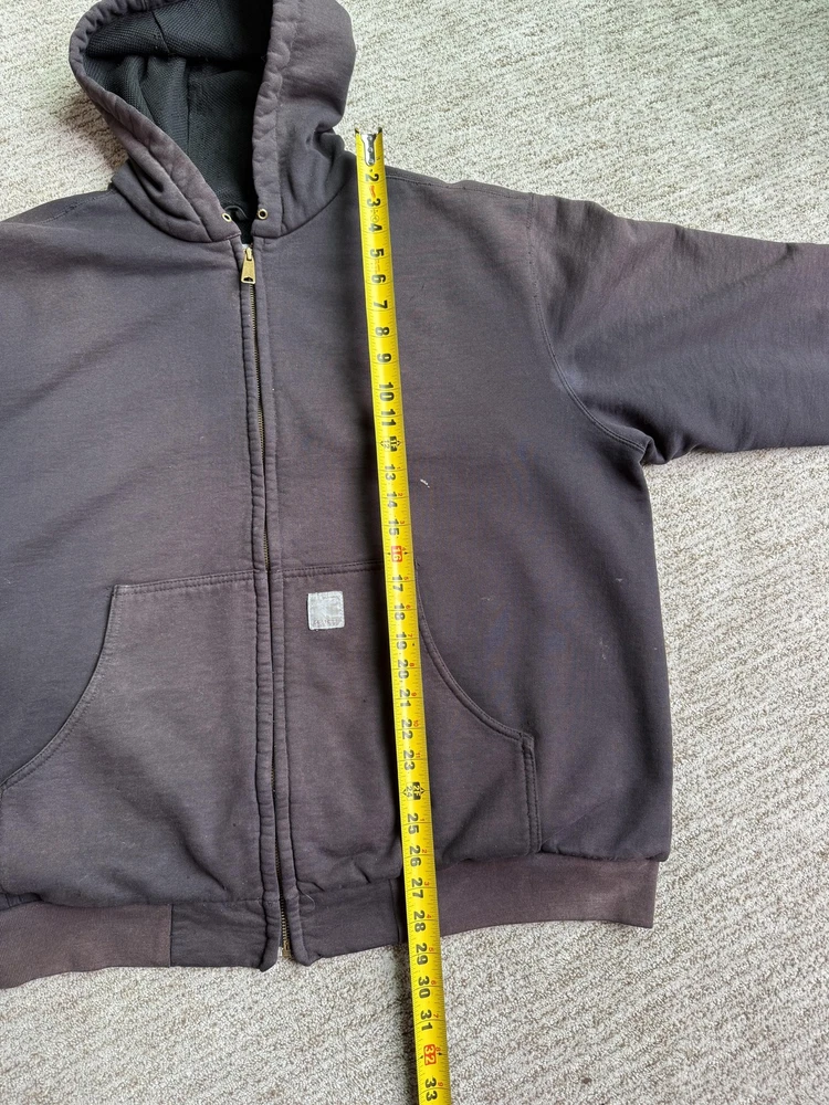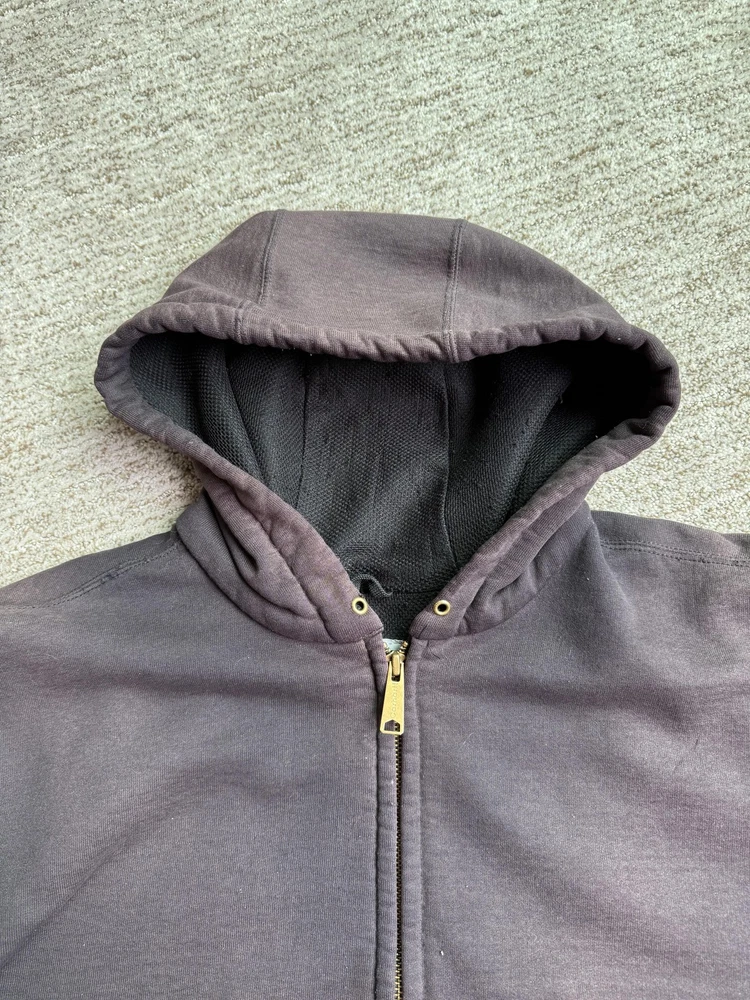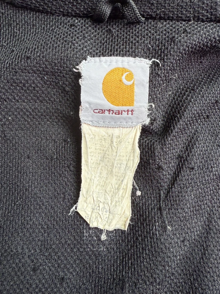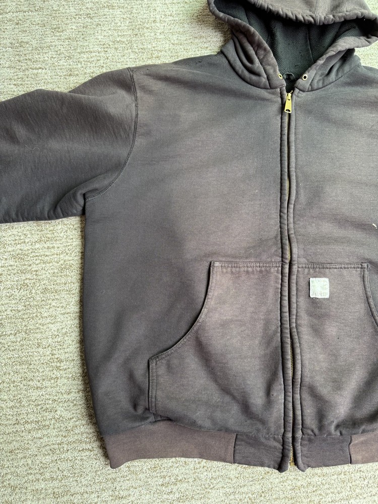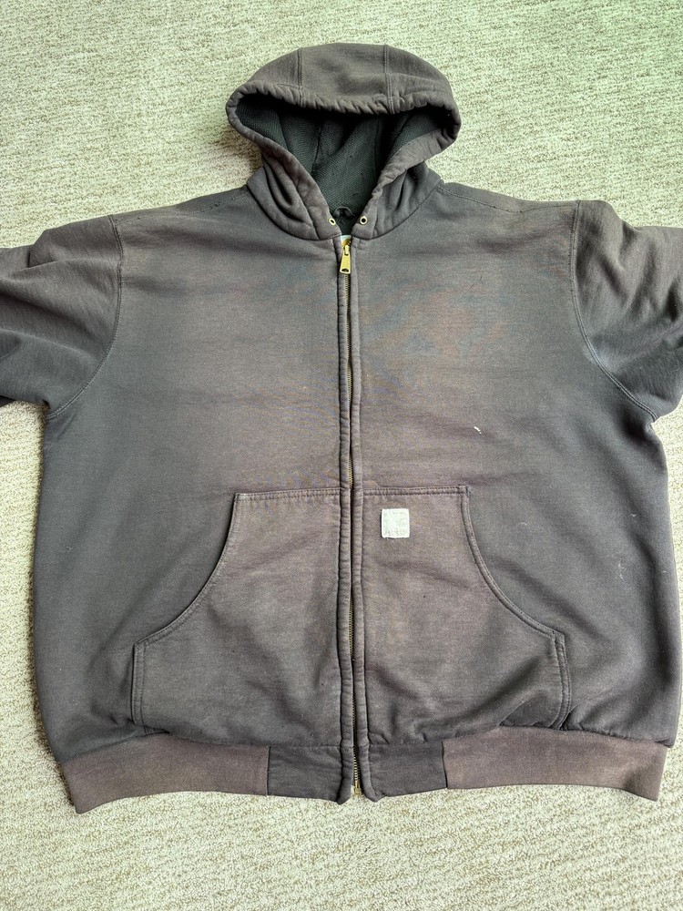 Carhartt Hoodie Mens XL Black Full Zip Workwear Heavyweight Distressed Condition: Fair used condition with heavy wear and distressing throughout. Visible fading across the exterior. Several small white paint or bleach marks and scattered stains/spots to front, pocket, and sleeves. Noticeable pilling and lint on the inner mesh lining. Significant wear at both sleeve cuffs including fraying and a small hole. Interior mesh shows a hole near the zipper seam on one side. Please see photos for all details and closeups of wear and flaws. 80% cotton / 20% polyester (based on typical Carhartt fleece blend, tag is heavily faded and hard to fully read) Carhartt patch logo on front pocket Heavyweight hooded sweatshirt style with brass Carhartt-branded zipper Two front hand-warmer pockets Ribbed/cuffed sleeves and waistband Color: Black (faded) Tag size: 2XL (Mens) – see photos for measurement references Approximate flat measurements (for fit reference): - Chest (pit to pit): 28" - Length (top of shoulder to bottom hem): 28" - Sleeve length (shoulder seam to cuff): 25" Made in the USA (per tag details and Carhartt era/label style) Ideal for grunge, workwear, raw/heritage style, or everyday use in cold weather