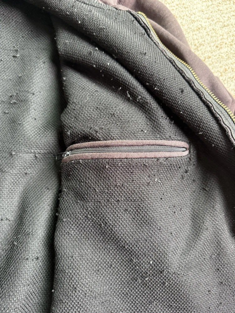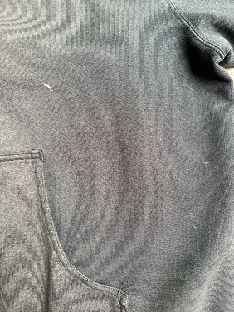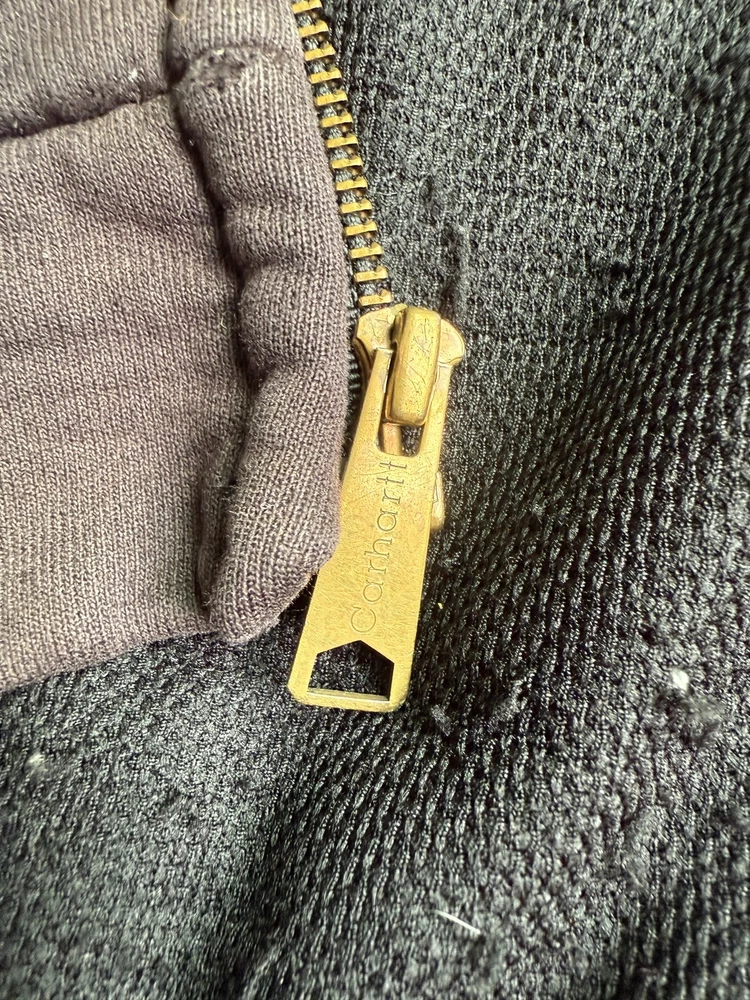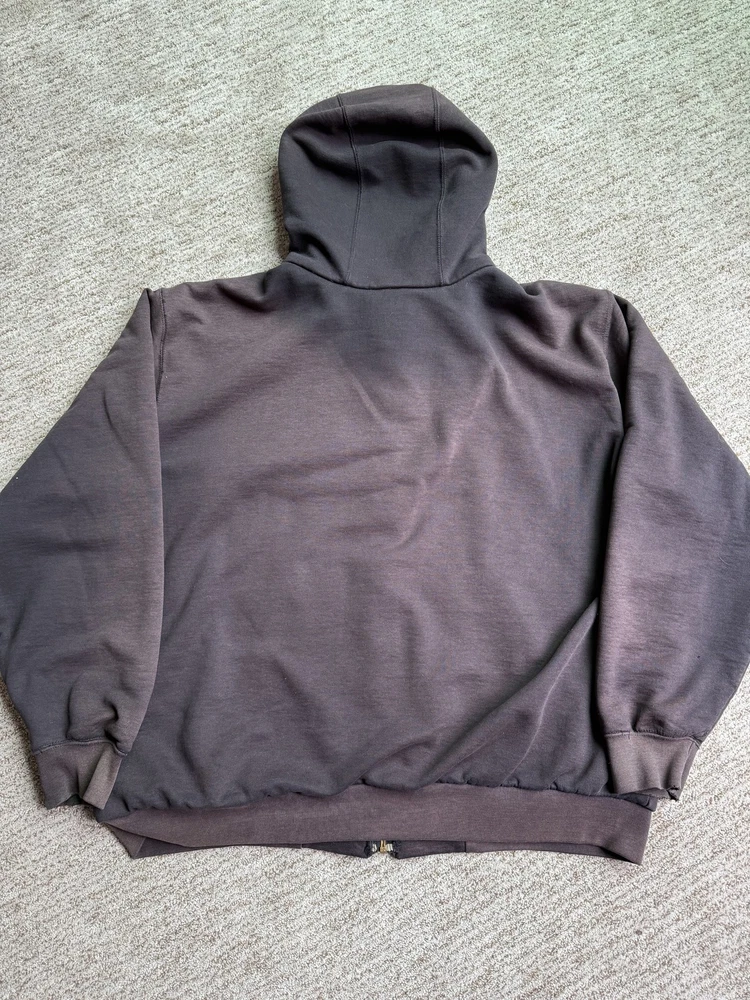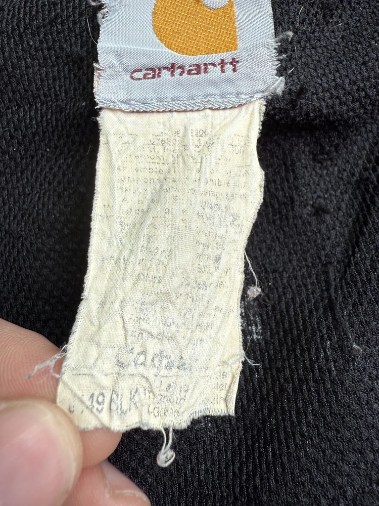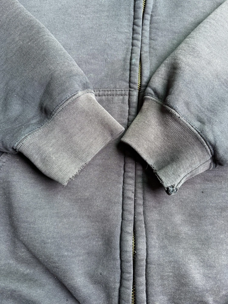 Carhartt Hoodie Mens XL Black Full Zip Workwear Heavyweight Distressed Condition: Fair used condition with heavy wear and distressing throughout. Visible fading across the exterior. Several small white paint or bleach marks and scattered stains/spots to front, pocket, and sleeves. Noticeable pilling and lint on the inner mesh lining. Significant wear at both sleeve cuffs including fraying and a small hole. Interior mesh shows a hole near the zipper seam on one side. Please see photos for all details and closeups of wear and flaws. 80% cotton / 20% polyester (based on typical Carhartt fleece blend, tag is heavily faded and hard to fully read) Carhartt patch logo on front pocket Heavyweight hooded sweatshirt style with brass Carhartt-branded zipper Two front hand-warmer pockets Ribbed/cuffed sleeves and waistband Color: Black (faded) Tag size: 2XL (Mens) – see photos for measurement references Approximate flat measurements (for fit reference): - Chest (pit to pit): 28" - Length (top of shoulder to bottom hem): 28" - Sleeve length (shoulder seam to cuff): 25" Made in the USA (per tag details and Carhartt era/label style) Ideal for grunge, workwear, raw/heritage style, or everyday use in cold weather