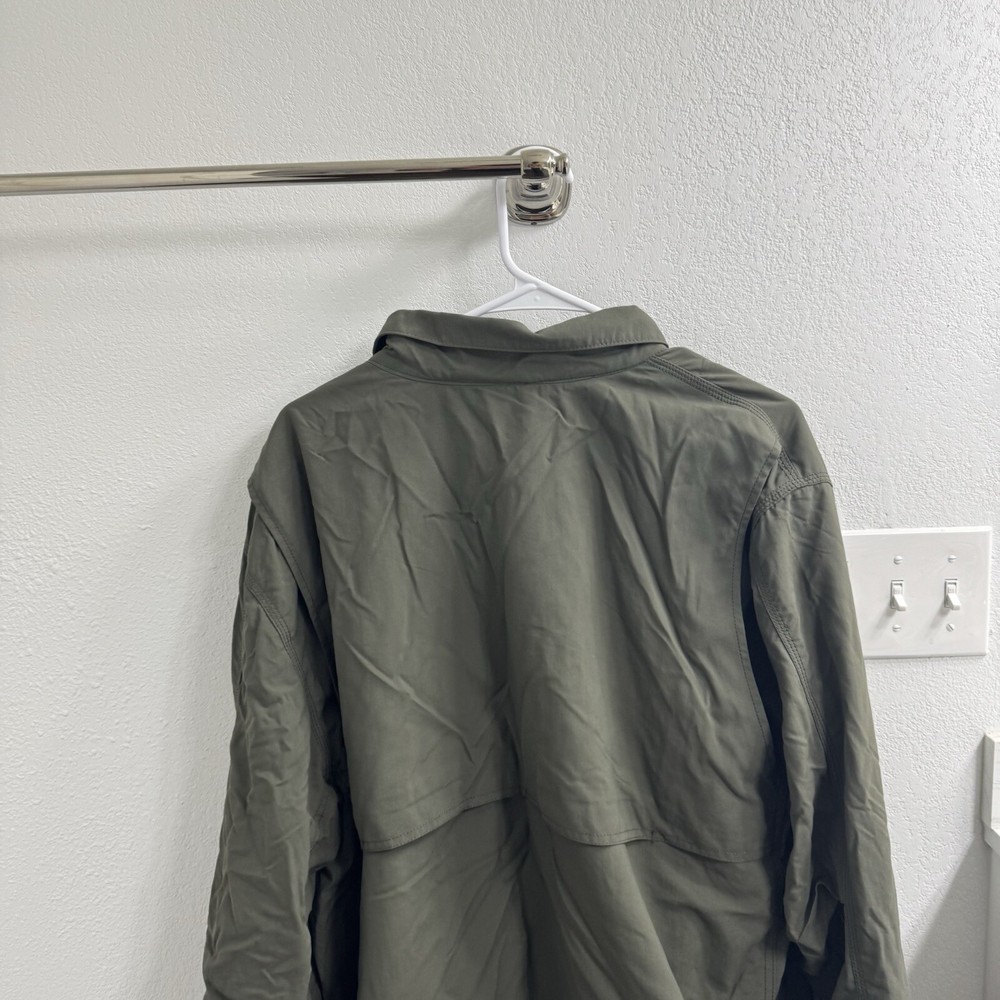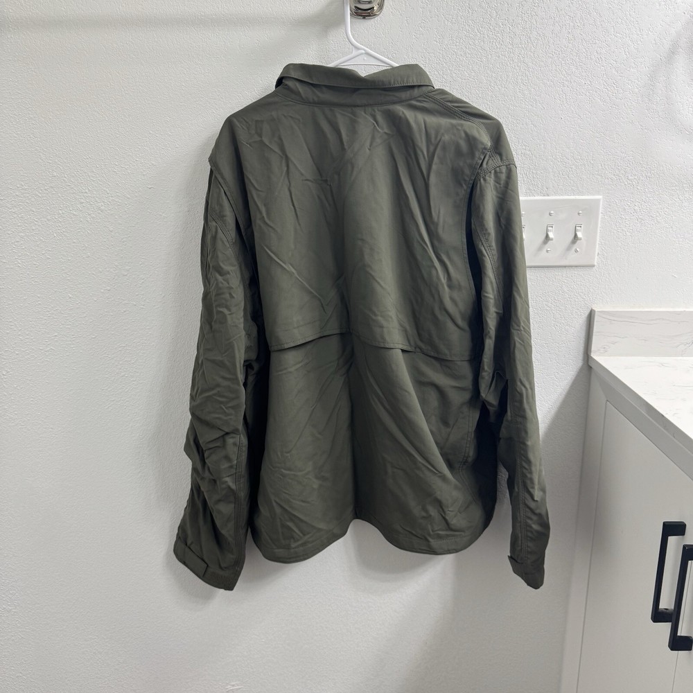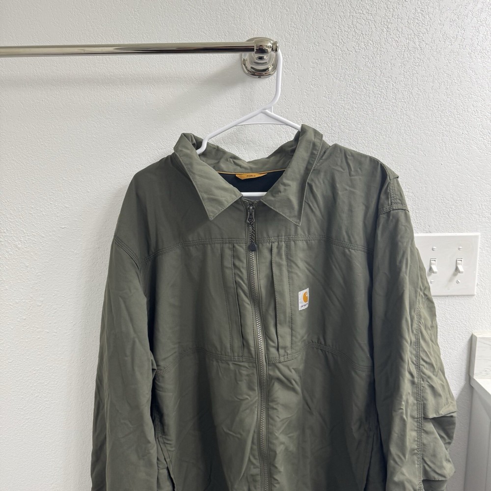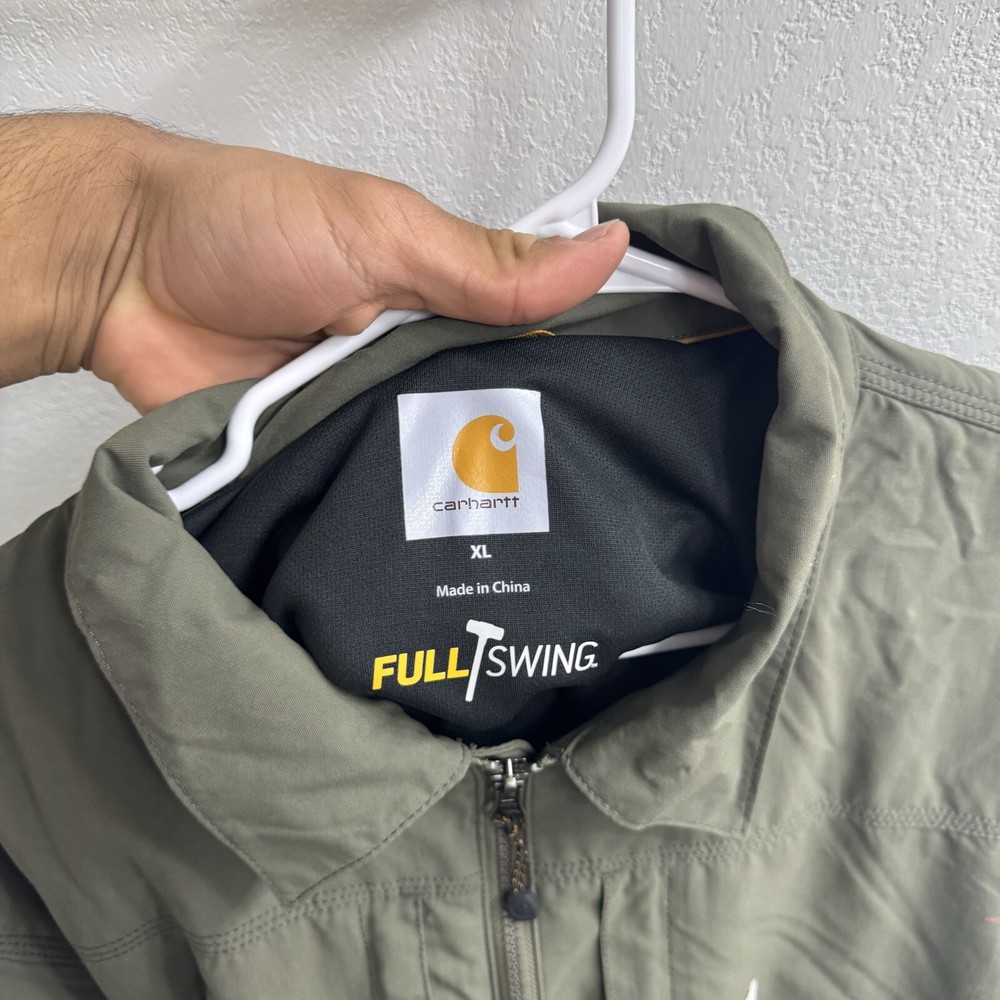 The Carhartt Men's Rain Defender Full Swing Jacket is a durable and versatile outerwear piece designed for various occasions such as travel, casual outings, and workwear. Made of green Nylon material with a softshell fabric type, this mid-length jacket features a full zip closure and is suitable for winter, summer, fall, and spring seasons. The jacket has a regular fit and a chest size of 52 inches, making it comfortable for activities like walking, hunting, and hiking. With accents like a zipper and logo, and a classic outdoor theme, this Carhartt jacket is a practical choice for those who enjoy military or army-inspired styles.