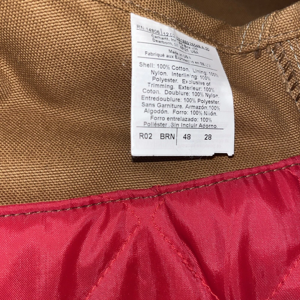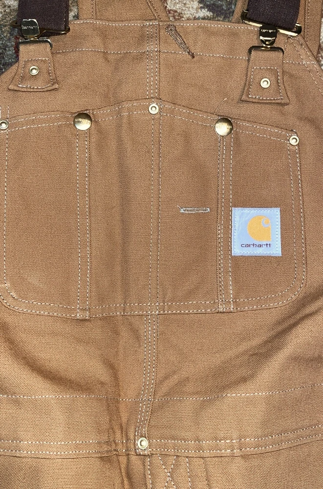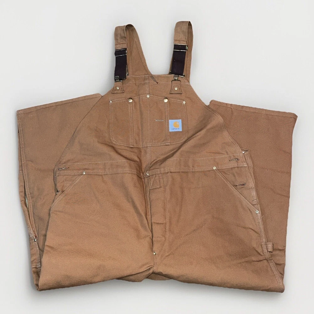 Style: Overalls Leg Style: Straight Pattern: Solid Accents: Quilted Brand: Carhartt Color: Brown Garment Care: Machine Washable Waist Size: 48 in Features: Insulated, Lined, Pockets Fabric Type: Canvas Material: Cotton Department: Men Type: Pants Occasion: Workwear Size: 48 Theme: USA Country/Region of Manufacture: United States Size Type: Regular Fit: Regular Inseam: 28 in Vintage: Yes Closure: Buckle, Button Season: Fall, Spring, Winter