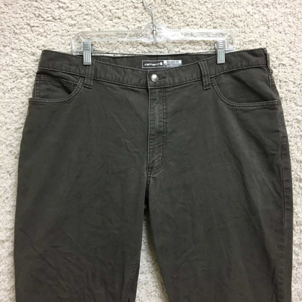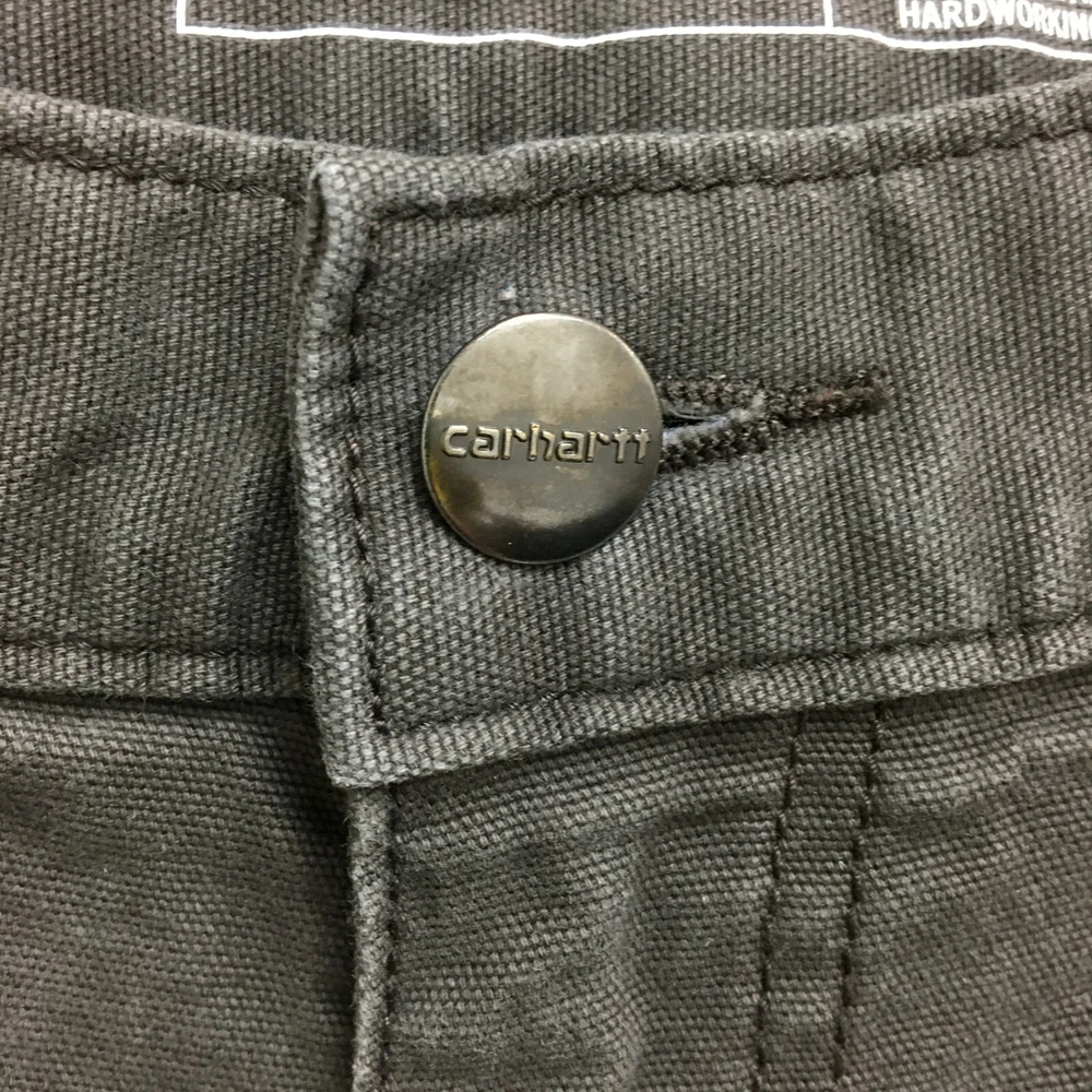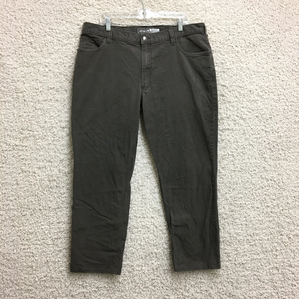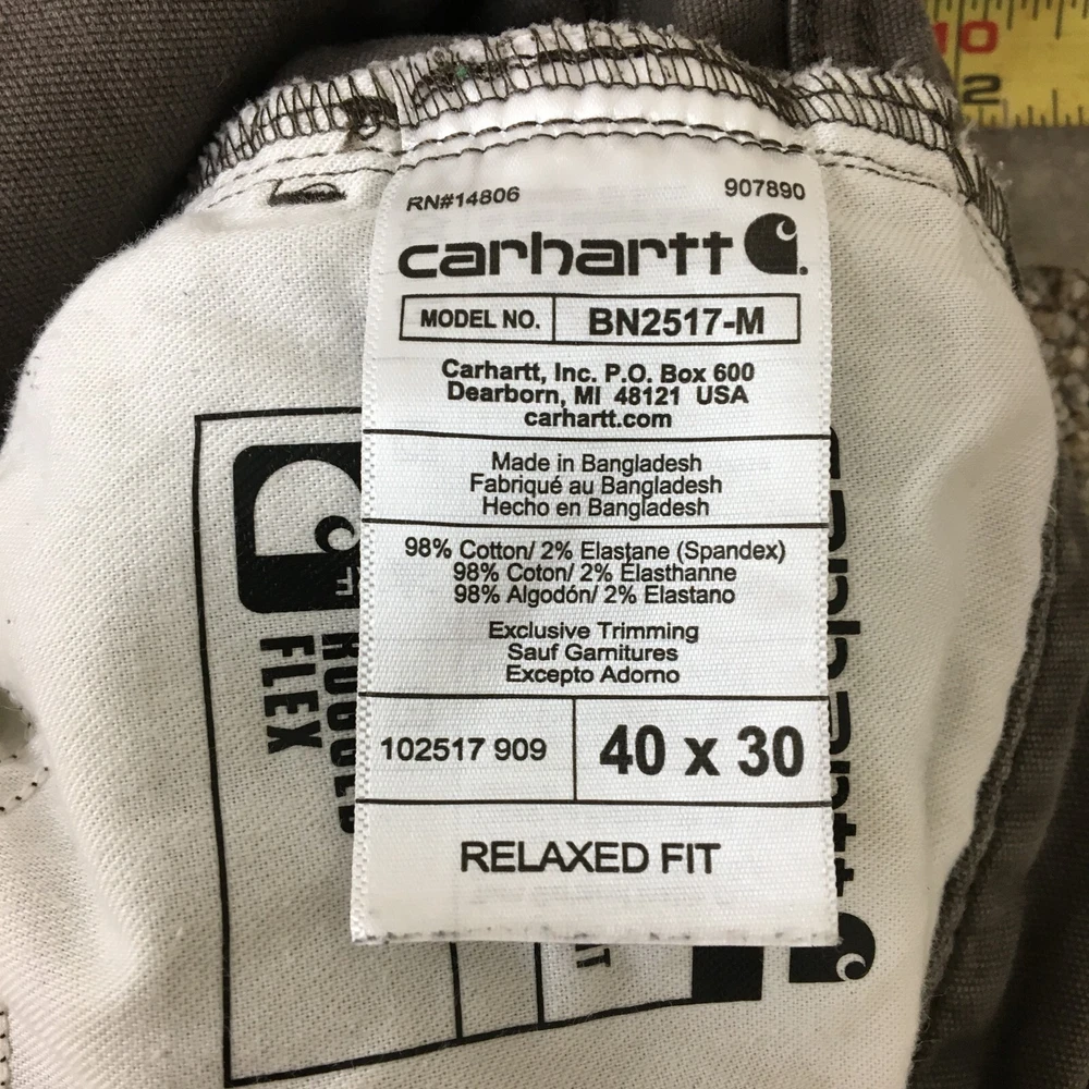 Pattern: Solid Pocket Type: 5-Pocket Design Season: Fall, Spring, Summer, Winter Department: Men Theme: Logo, USA Front Type: Flat Front Size: 40 Fit: Relaxed Rise: Mid (10-12 in) Fabric Type: Canvas Accents: Button, Logo Leg Style: Straight Country/Region of Manufacture: Bangladesh Waist Size: 40 in Brand: Carhartt MPN: bn2517-m Features: Comfort, Easy Care, Pockets Inseam: 29 in Occasion: Casual, Travel, Workwear Material: Cotton, Cotton Blend, Spandex Color: Gray Garment Care: Machine Washable Style: Carpenter Size Type: Regular Closure: Button, Zip Seller Notes: “Good Used Condition. Please, See Pictures for Full Condition and Measurements.” Type: Pants