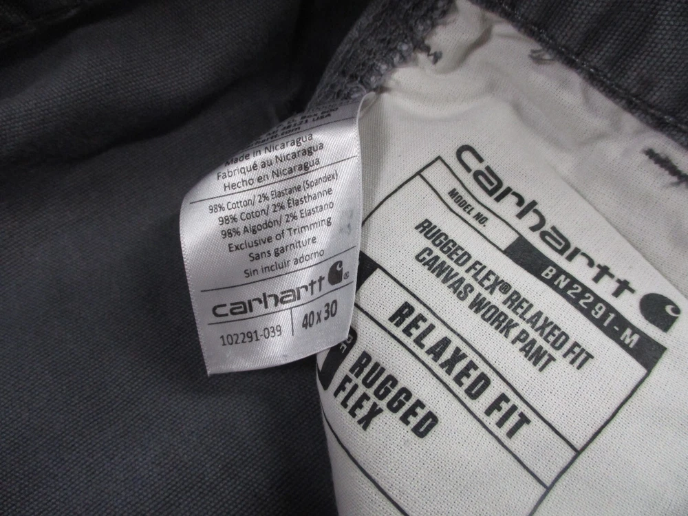 Suspender Buttons/Belt Loops: Belt Loops Accents: Button, Zipper Department: Men Fit: Relaxed Size Type: Regular Occasion: Casual UPC: Does not apply Leg Style: Straight Material: Cotton, Spandex gtin13: Does not apply Size: 40 Features: Stretch Color: Gray Brand: Carhartt Product Line: Carhartt Season: Fall, Spring, Summer, Winter Personalize: No Seller Notes: “Light distressed mark on front. Check below for full description & photos.” Garment Care: Machine Washable Fabric Type: Canvas Theme: Outdoor Type: Pants Handmade: No Front Type: Flat Front Pocket Type: Cargo Pocket Closure: Zip Style: Chino Waist Size: 38 in Pattern: Solid Inseam: 28 in