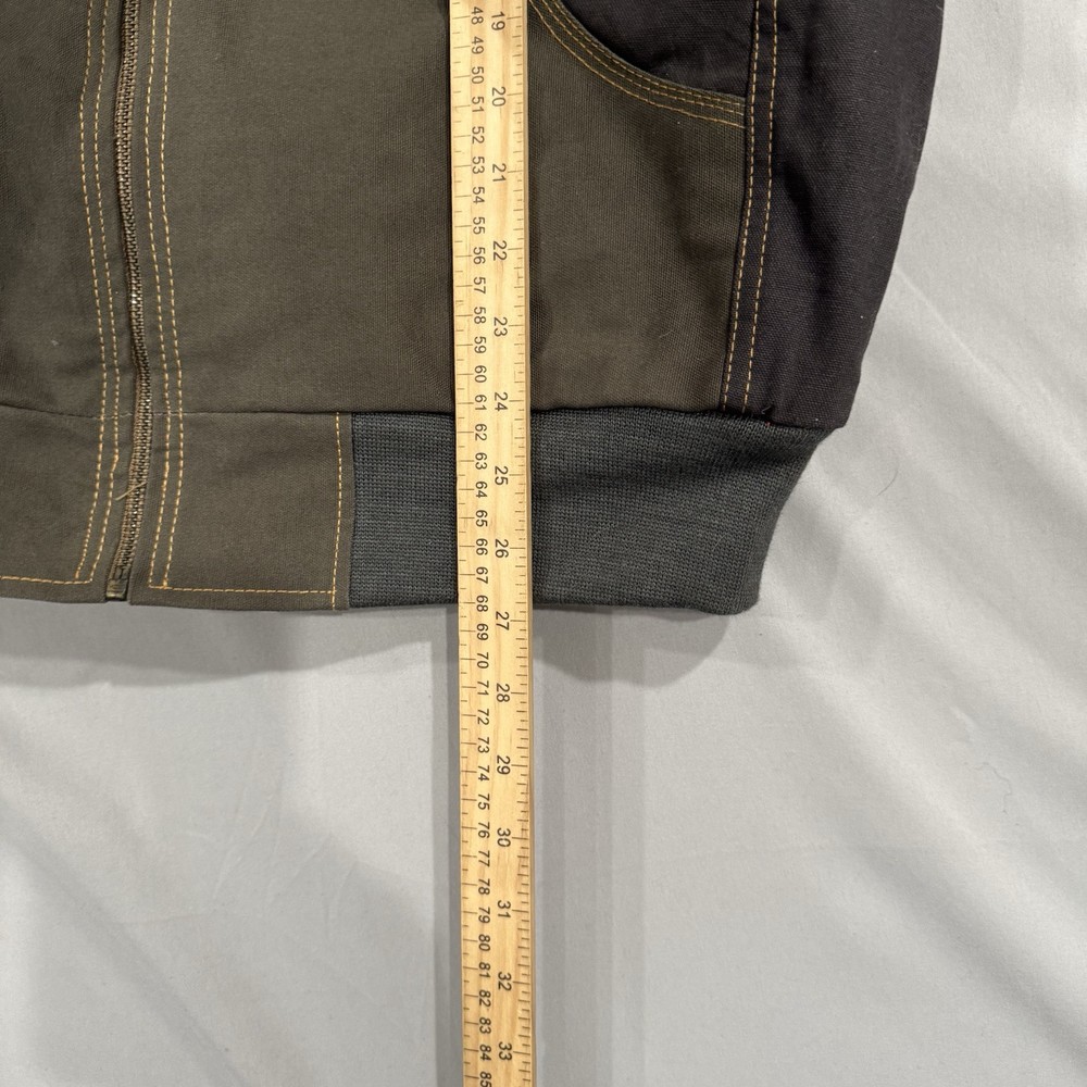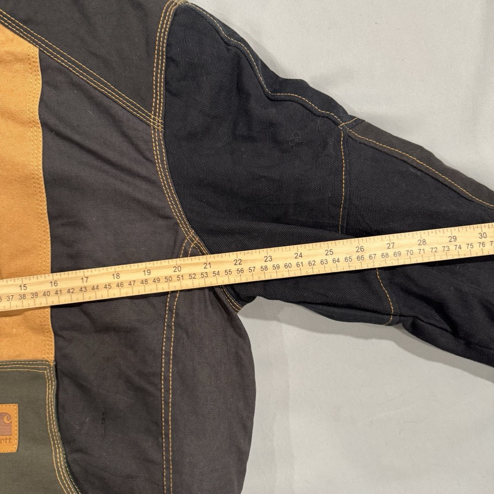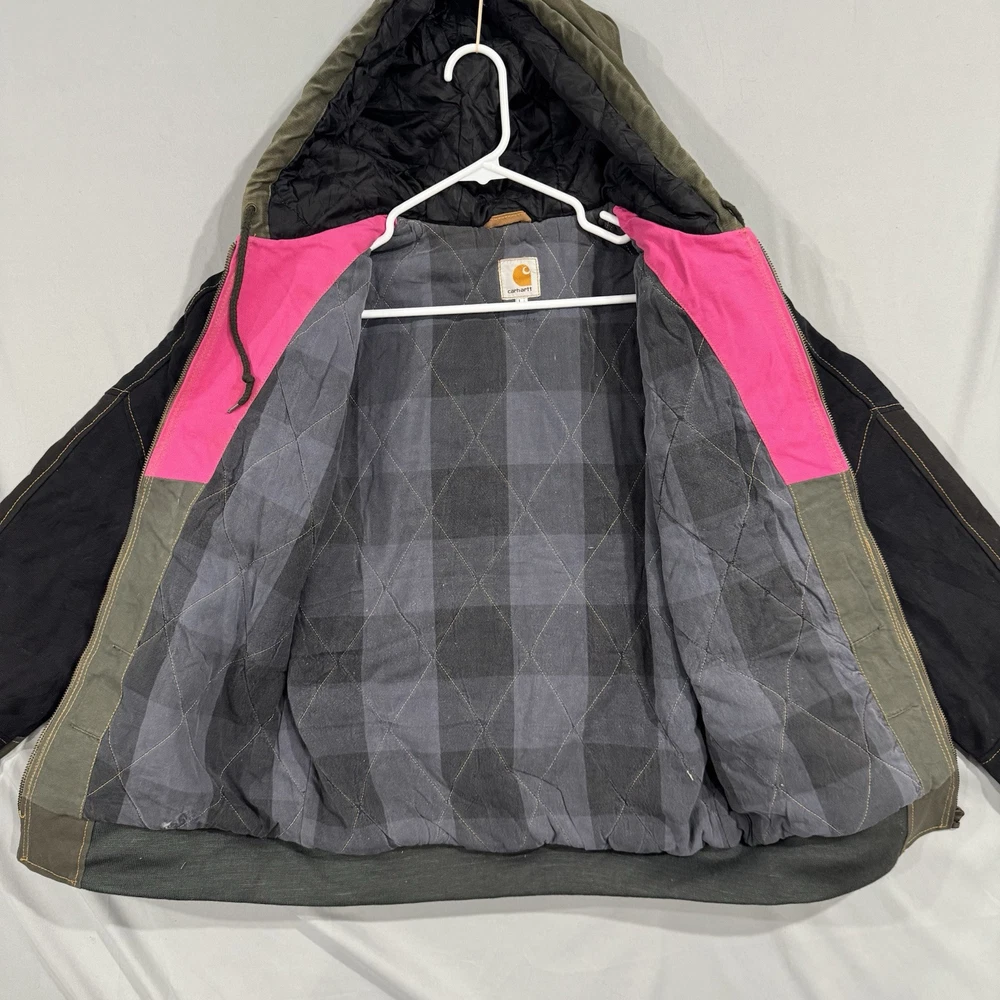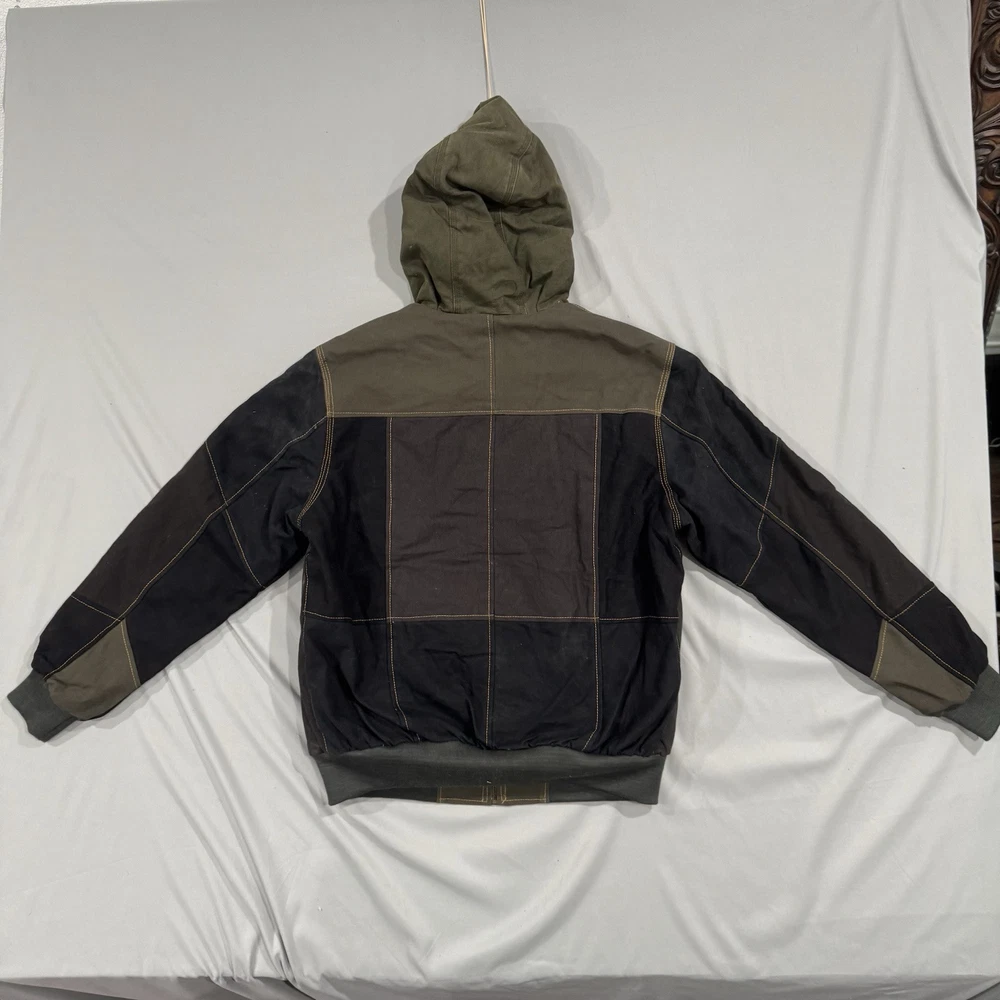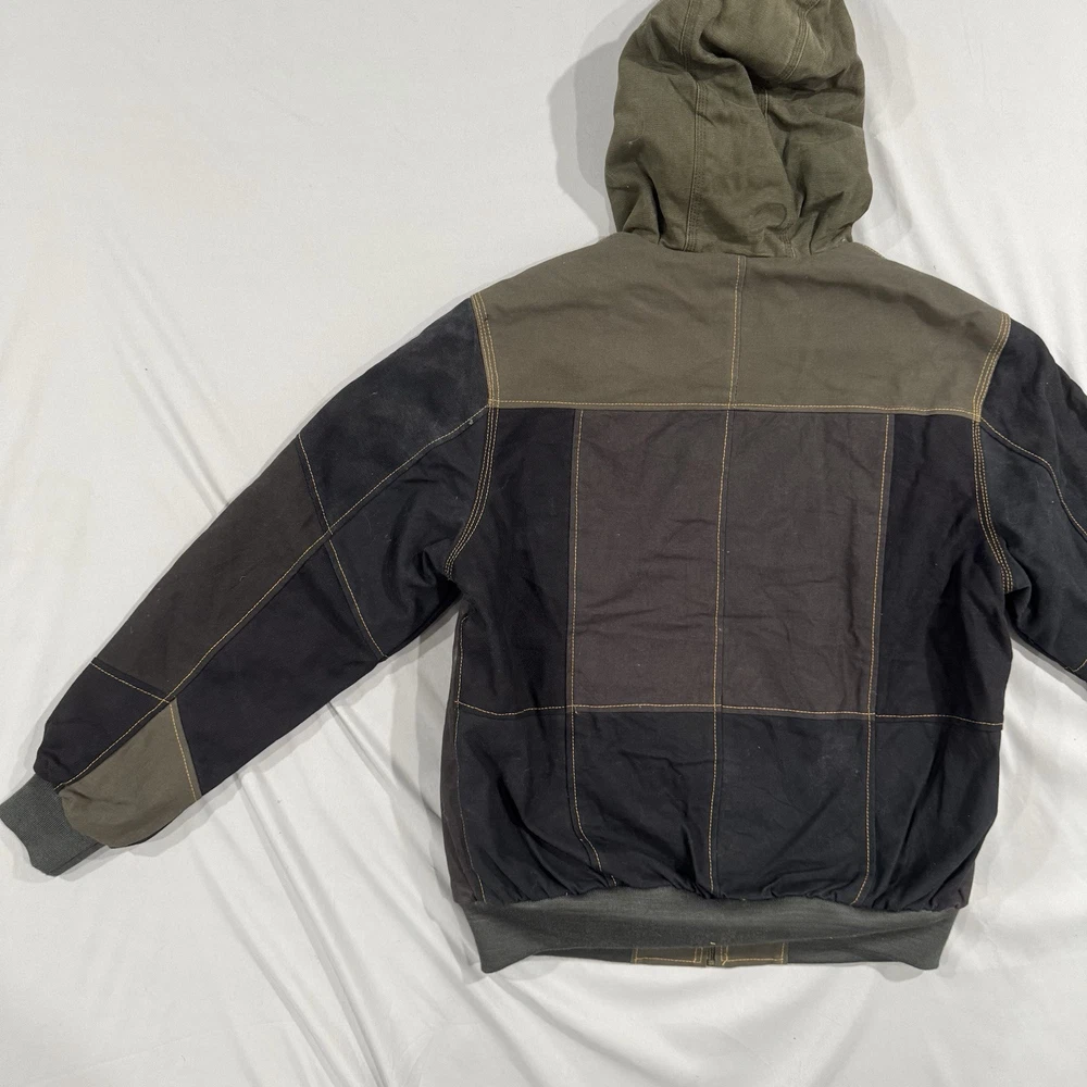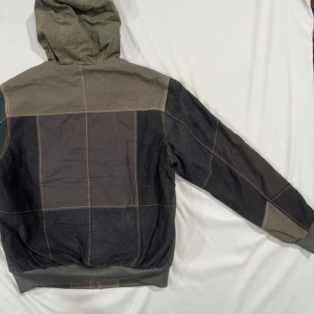 Note: The zipper is broken, the flap broke off (still can unzip and zip) The Carhartt Rework Men's Hooded Jacket in size Large features a full zip design and a hood for added protection against the elements. Made from durable cotton canvas material, this jacket is reworked with patch details and Sherpa lining for a unique and stylish look. The multicolor design adds a touch of versatility, making it a great addition to any men's outerwear collection. Perfect for staying warm and comfortable while maintaining a rugged style, this Carhartt jacket is sure to be a standout piece in your wardrobe.