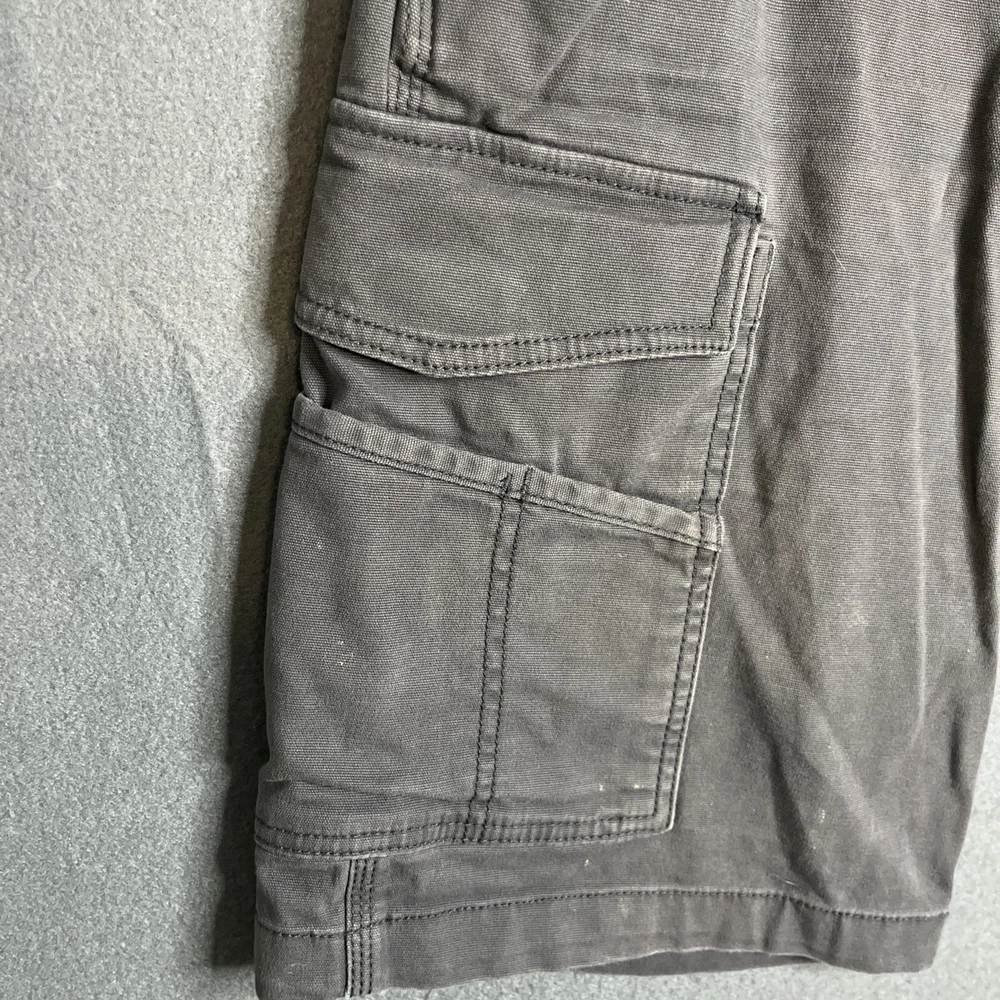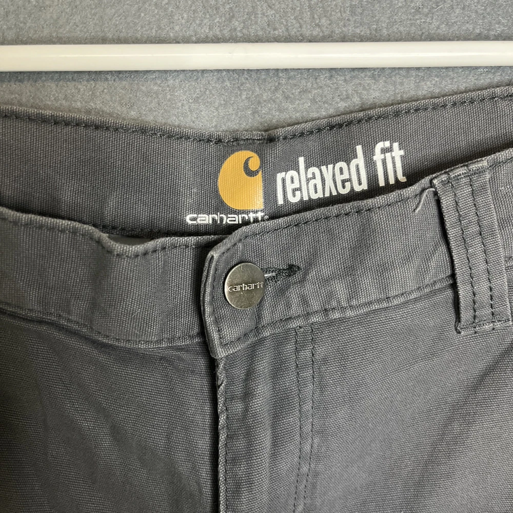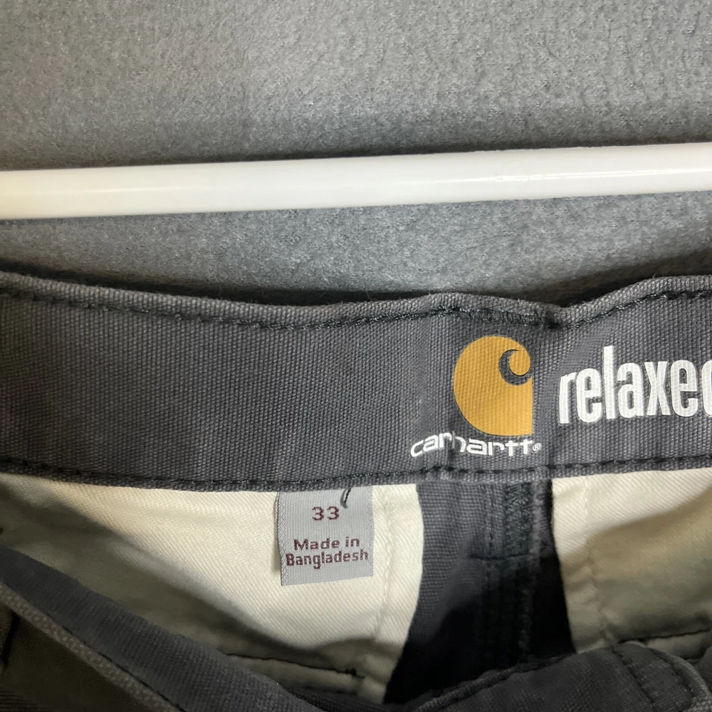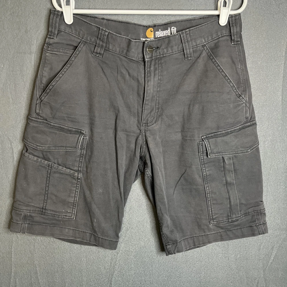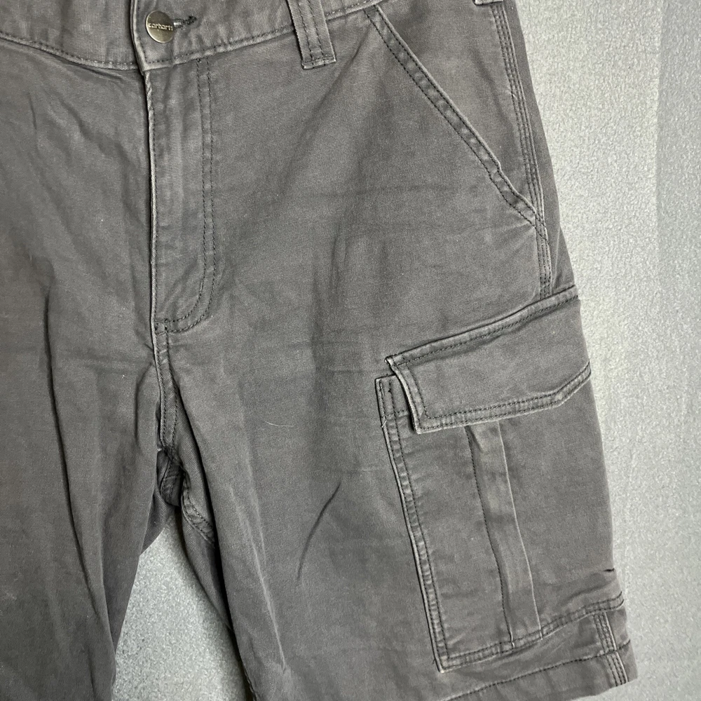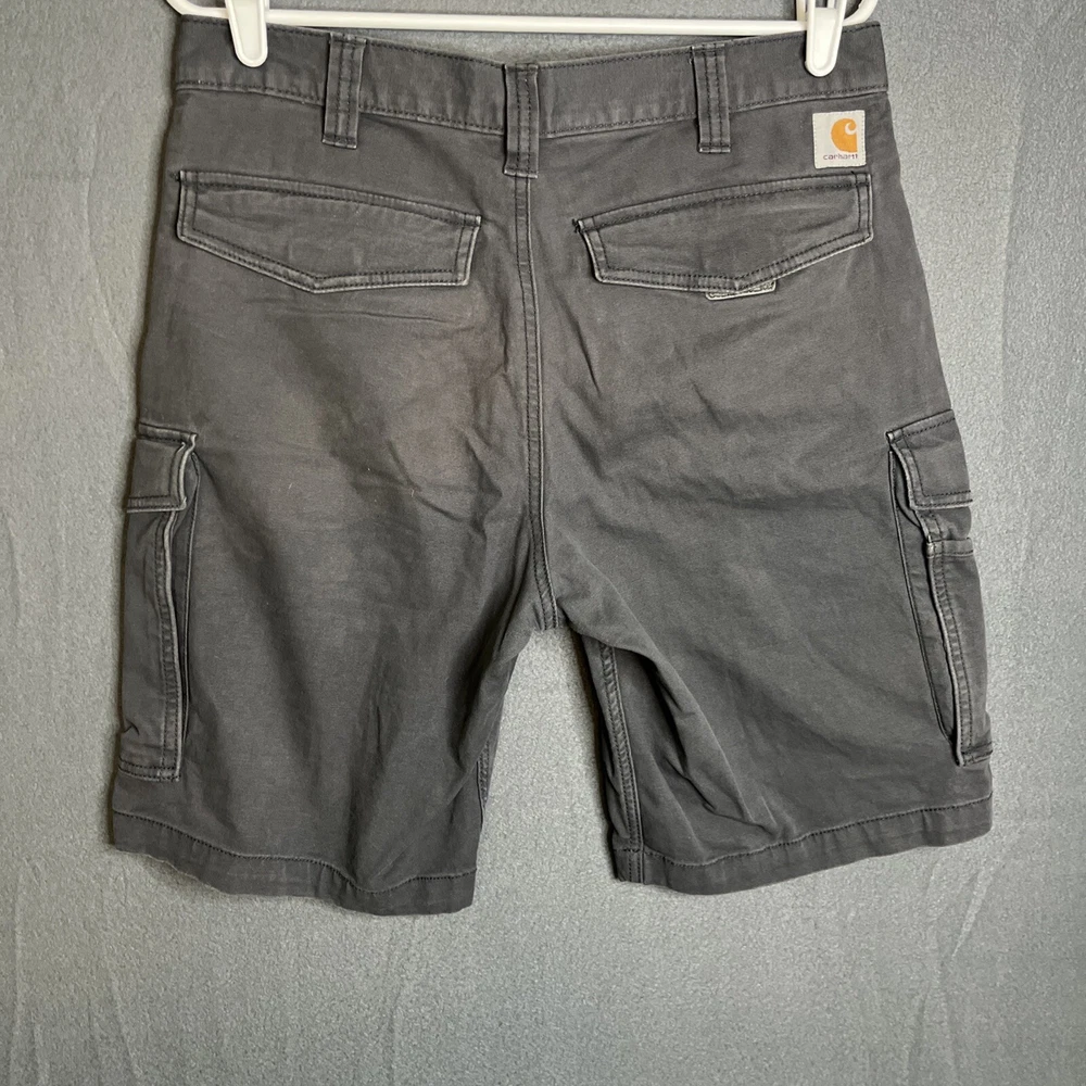 These Carhartt Rugged Cargo Shorts are designed for both casual and workwear occasions. They feature a relaxed fit, a mid-rise style with a 10-inch inseam, and a waist size of 33 inches. Made from a durable cotton blend fabric with a touch of spandex for added comfort, these gray shorts have a flat front design with a zip closure and button accents. The cargo pockets provide extra storage space, making them practical for outdoor activities. The Carhartt logo adds a touch of branding to these versatile and machine washable shorts.