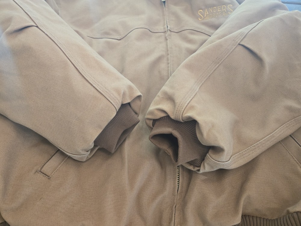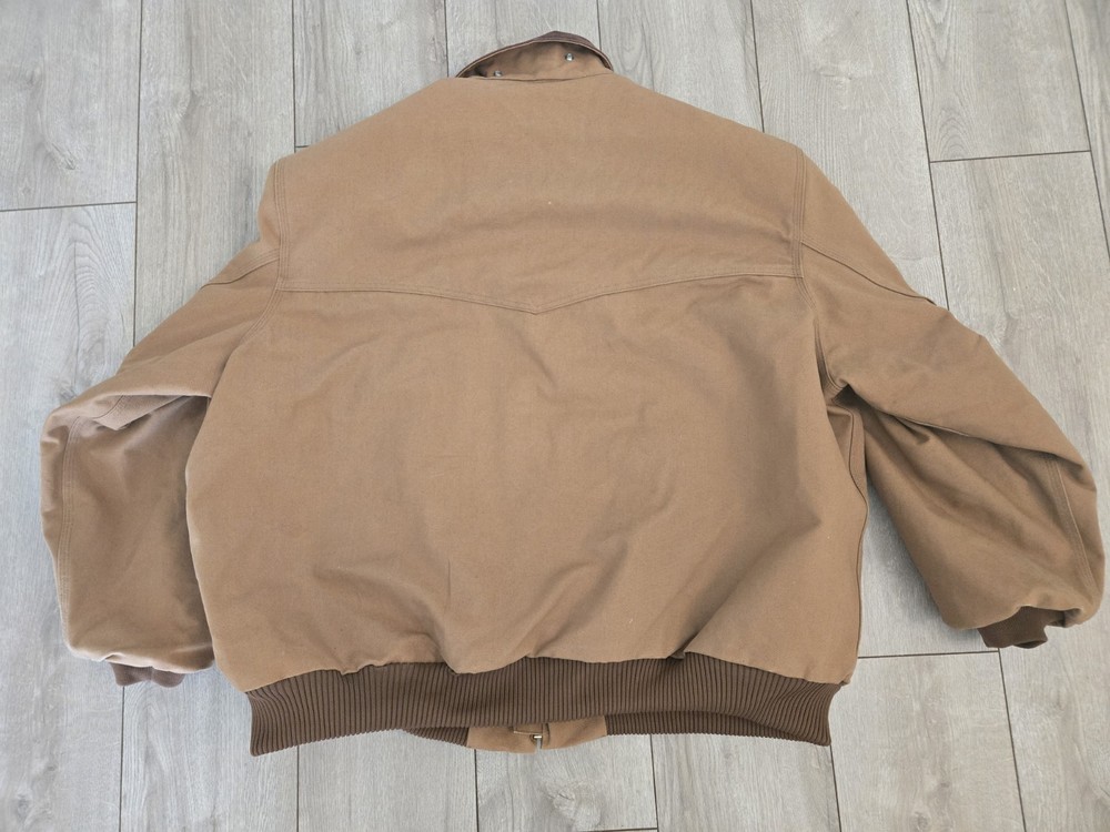 The Carhartt Sante Fe Jacket in size 4XL is a stylish and durable outerwear option for men. Made with cotton canvas material, this bomber jacket features a brown color with a theme of USA and outdoor elements. With multiple occasions for wear, both casual and workwear, this jacket is perfect for the winter, fall, and spring seasons. The Carhartt brand ensures high quality and reliability, making it a sturdy addition to any wardrobe. Has company embroidery. Has a few small marks.