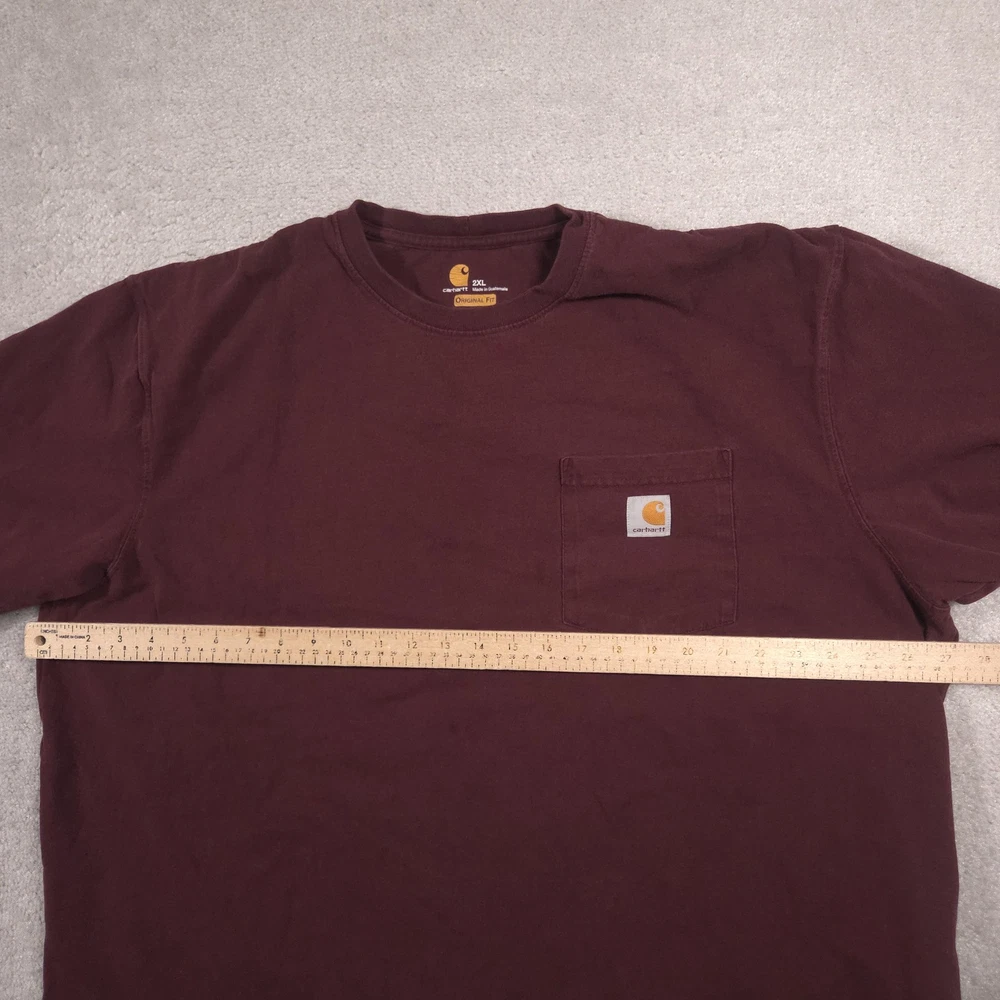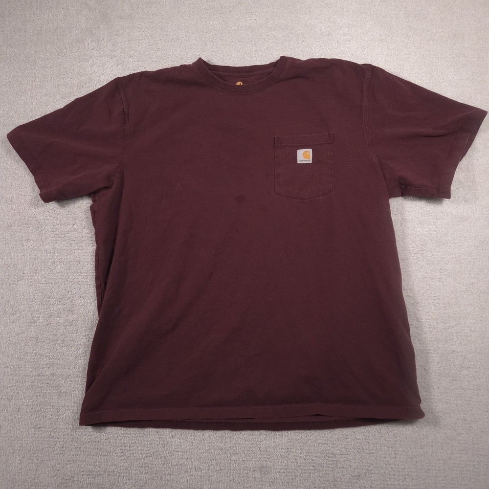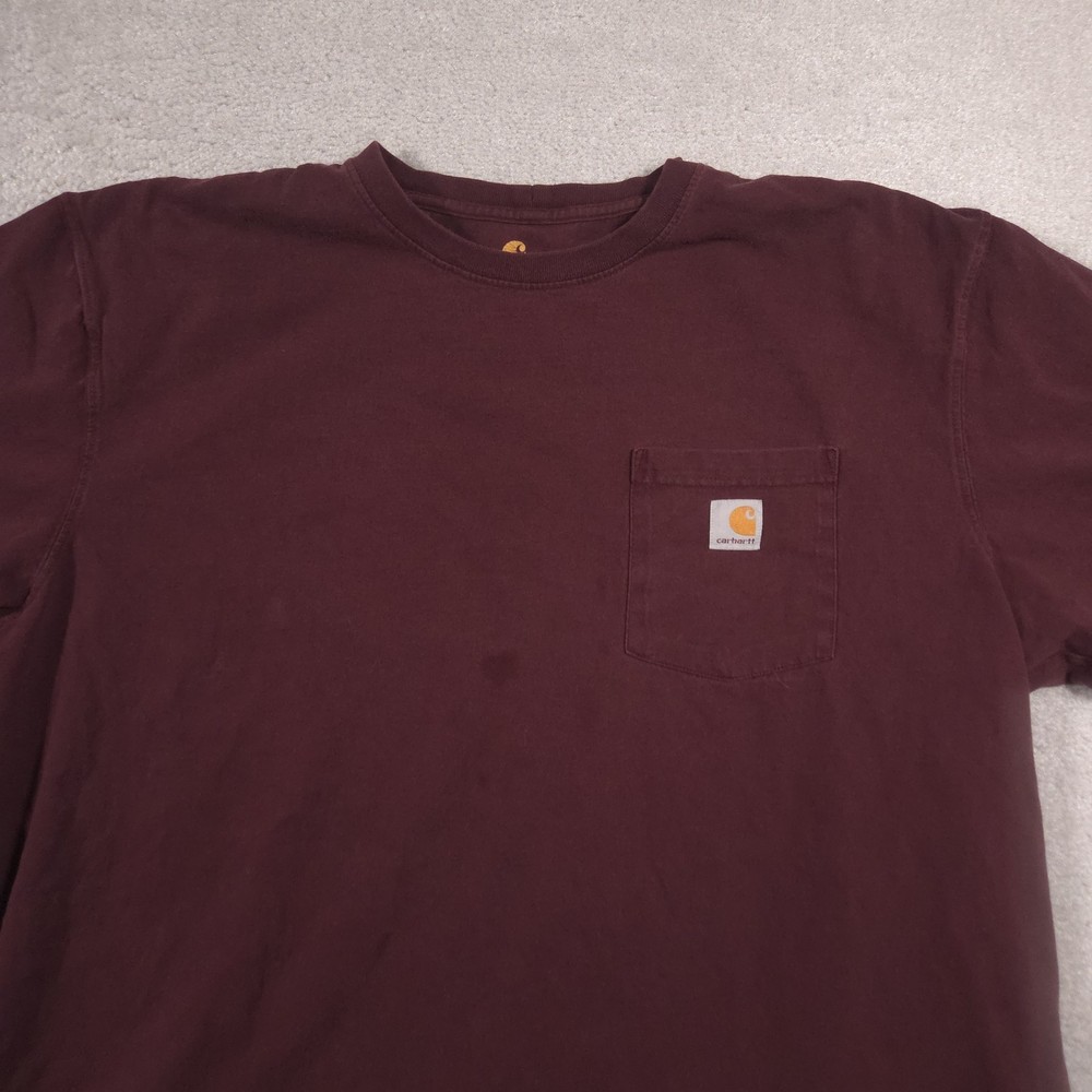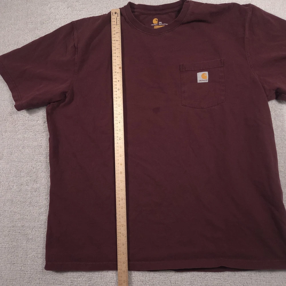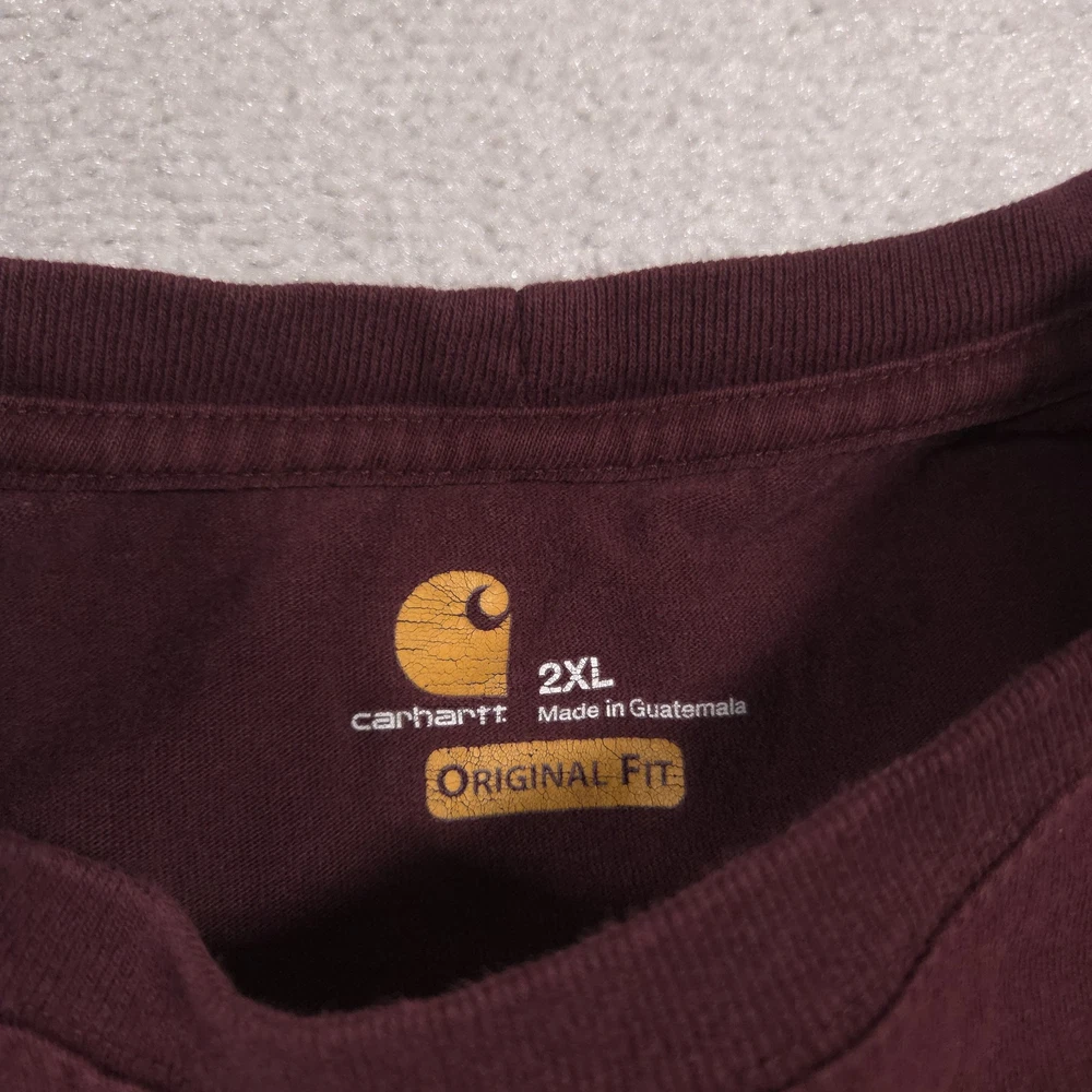 Carhartt Shirt Mens 2XL Red Pocket Workwear Original Fit Tagless Tee Cotton Pre-owned Carhartt mens T-shirt with fabric clean and structurally intact across front, back, and sleeves. Material shows overall wash wear and wrinkling from wear and storage, small faint spots on the front where the pencil points, a tiny pinhole at the front sleeve hem, and a small pinhole on the lower back where the pencil points. Collar, pocket, logo patch, and hems remain attached and functional; printed neck graphics and interior care tag present but no original retail tags or packaging included. Brand: Carhartt Mens short sleeve T-shirt designed for job sites, outdoor projects, and casual everyday wear. Color and pattern: Solid dark red fabric that provides a straightforward, work-ready look. Design details: Crew neckline, single left chest pocket with woven Carhartt logo patch, straight hem, and short sleeves in a classic T-shirt silhouette with a tagless printed neck. Fabric and feel: 100% cotton jersey knit intended to feel durable, midweight, and comfortable for regular wear. Fit and sizing: Interior neck print lists Mens 2XL with Carhartt ORIGINAL FIT cut for a relaxed, roomy fit through the chest and body. Branding and tags: Printed Carhartt logo and size information at the inner neck reading carhartt 2XL Made in Guatemala ORIGINAL FIT, plus interior woven care tag indicating 100% cotton and style code 100137. Use occasions: Suitable for construction work, shop or warehouse environments, yard work, and casual outfits with jeans or work pants during spring, summer, and fall. Condition notes: See the condition section for details. BoxbigD001