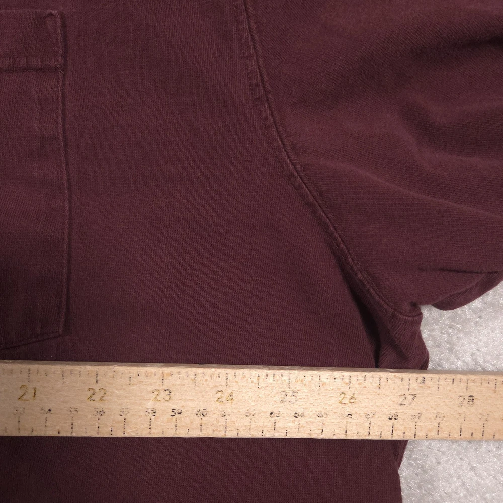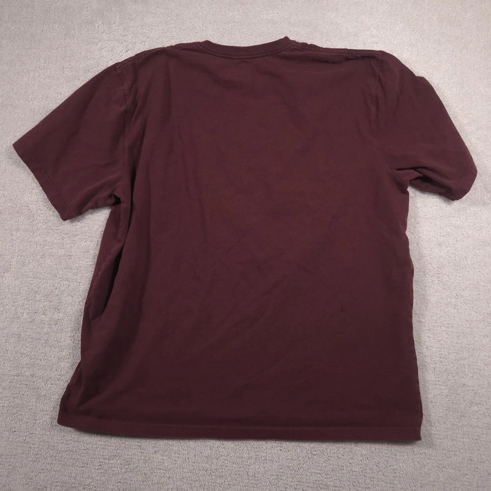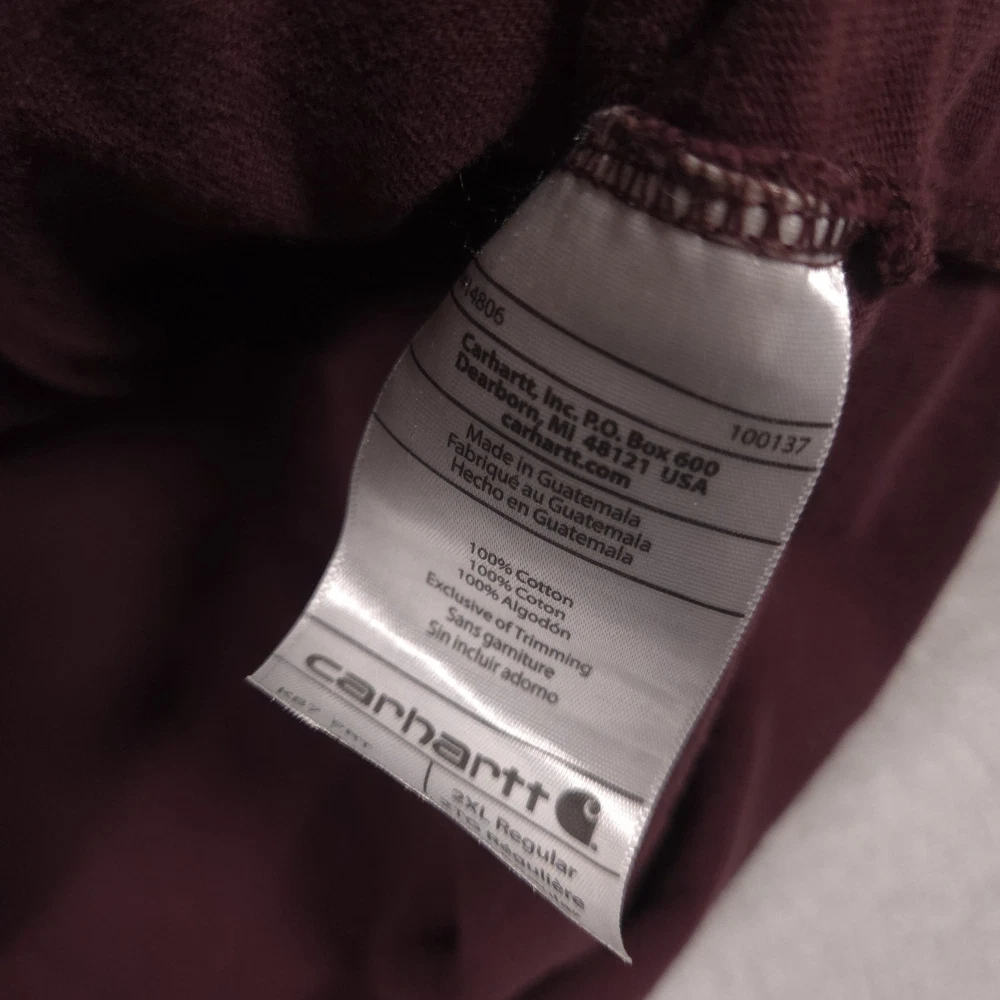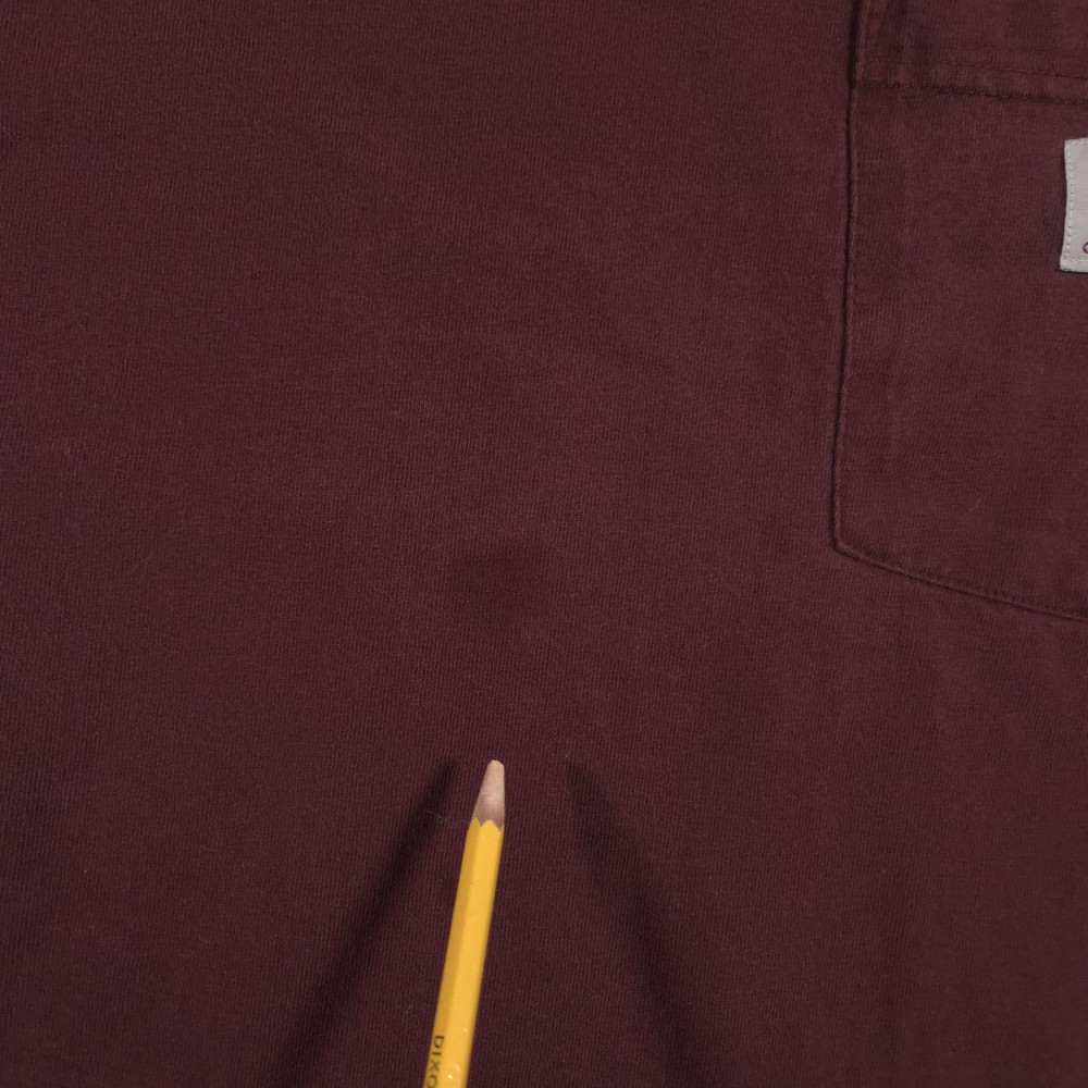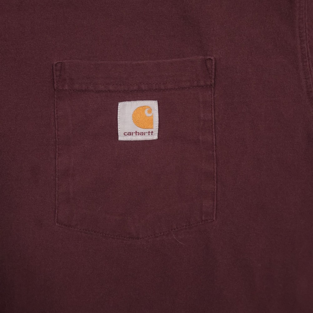 Carhartt Shirt Mens 2XL Red Pocket Workwear Original Fit Tagless Tee Cotton Pre-owned Carhartt mens T-shirt with fabric clean and structurally intact across front, back, and sleeves. Material shows overall wash wear and wrinkling from wear and storage, small faint spots on the front where the pencil points, a tiny pinhole at the front sleeve hem, and a small pinhole on the lower back where the pencil points. Collar, pocket, logo patch, and hems remain attached and functional; printed neck graphics and interior care tag present but no original retail tags or packaging included. Brand: Carhartt Mens short sleeve T-shirt designed for job sites, outdoor projects, and casual everyday wear. Color and pattern: Solid dark red fabric that provides a straightforward, work-ready look. Design details: Crew neckline, single left chest pocket with woven Carhartt logo patch, straight hem, and short sleeves in a classic T-shirt silhouette with a tagless printed neck. Fabric and feel: 100% cotton jersey knit intended to feel durable, midweight, and comfortable for regular wear. Fit and sizing: Interior neck print lists Mens 2XL with Carhartt ORIGINAL FIT cut for a relaxed, roomy fit through the chest and body. Branding and tags: Printed Carhartt logo and size information at the inner neck reading carhartt 2XL Made in Guatemala ORIGINAL FIT, plus interior woven care tag indicating 100% cotton and style code 100137. Use occasions: Suitable for construction work, shop or warehouse environments, yard work, and casual outfits with jeans or work pants during spring, summer, and fall. Condition notes: See the condition section for details. BoxbigD001