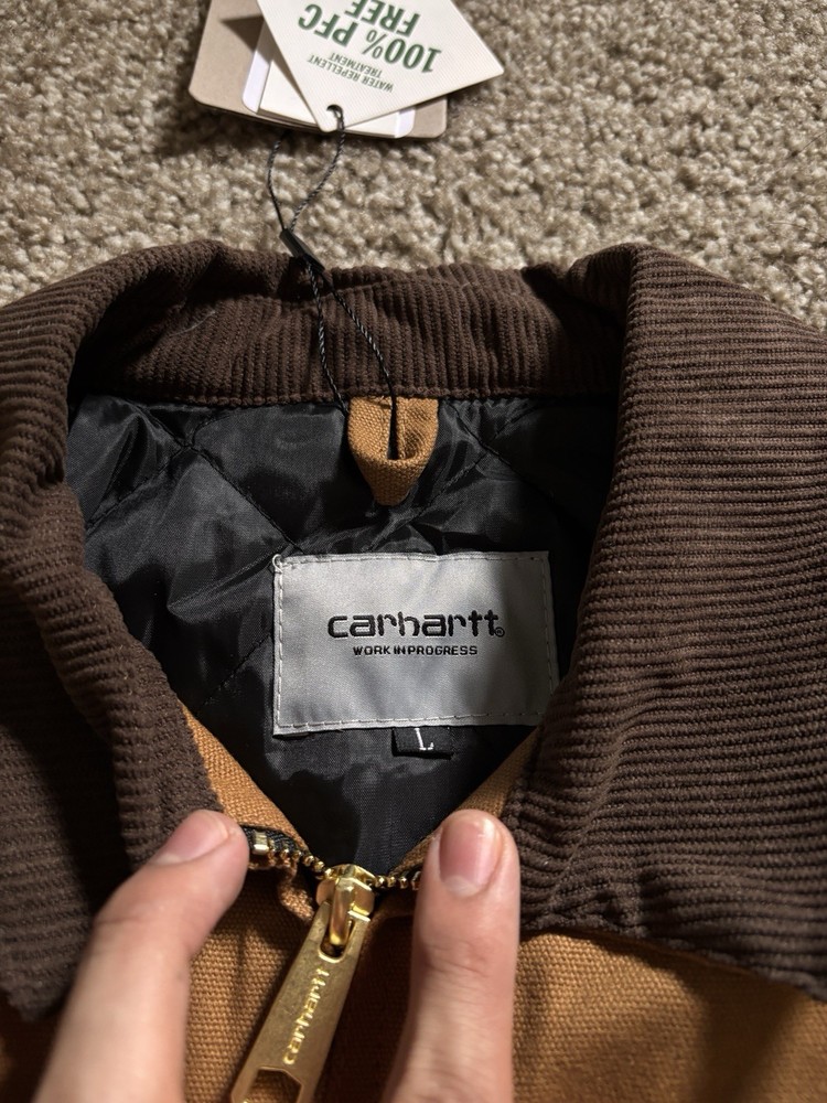 Brand new with tags 100% authentic Carhartt WIP Size Large (Men’s) Carhartt WIP Detroit Jacket in classic Hamilton Brown featuring a quilted insulated interior lining for colder weather. Built from heavyweight cotton canvas with the signature corduroy collar and structured Work In Progress fit. Details: • Heavyweight cotton canvas shell • Quilted insulated lining (warm / winter ready) • Corduroy collar • Gold-tone full zip closure • Zip chest pocket • Dual hand pockets • Signature Carhartt WIP square label • Modern tailored WIP silhouette This is the warmer Detroit model — ideal for fall and winter while keeping the timeless workwear look. Ships next business day. Message with any questions