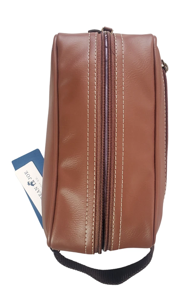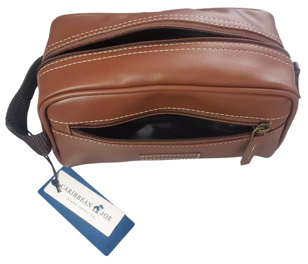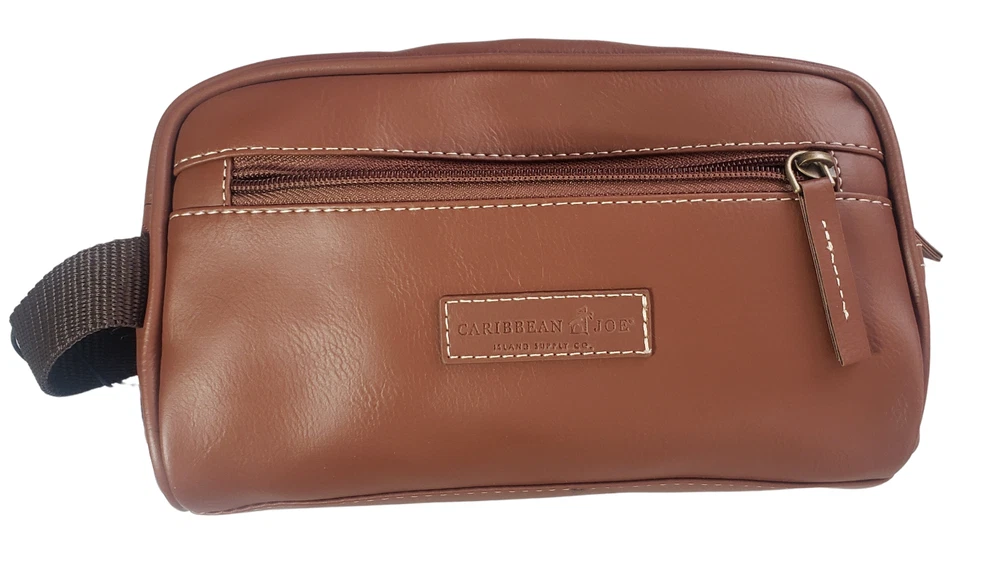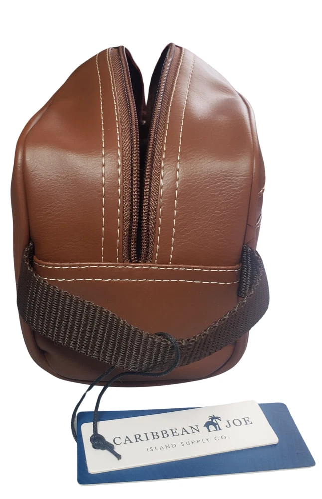 This Caribbean Joe unisex shaving kit is perfect for the traveling man or woman. Front and Main Zip closure and a top handle. The bag has an inside zipper compartment for convenient storage and is made of faux leather and man-made materials The polyester lining ensures a soft touch, and the faux leather material adds a touch of luxury. Measures approx. 8 3/4 inches long, 6 inches high and 4 1/4 wide. Beautiful Tan Color Top Zipper main compartment Caribbean Joe logo on front of bag. Retail tag MSRP $35.00
