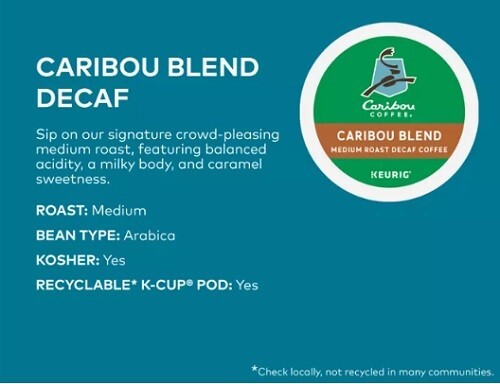 • A decaf classic among classics. Perfectly balanced. Sweet with a touch of spice. • Medium roast, decaf coffee • 100% Arabica coffee • Certified Orthodox Union Kosher • Packaging may vary A cup of Caribou Blend Decaf is perfect for any time of the day. The secret of this blend's relaxed complexity is the rich, hearty Indonesian bean.