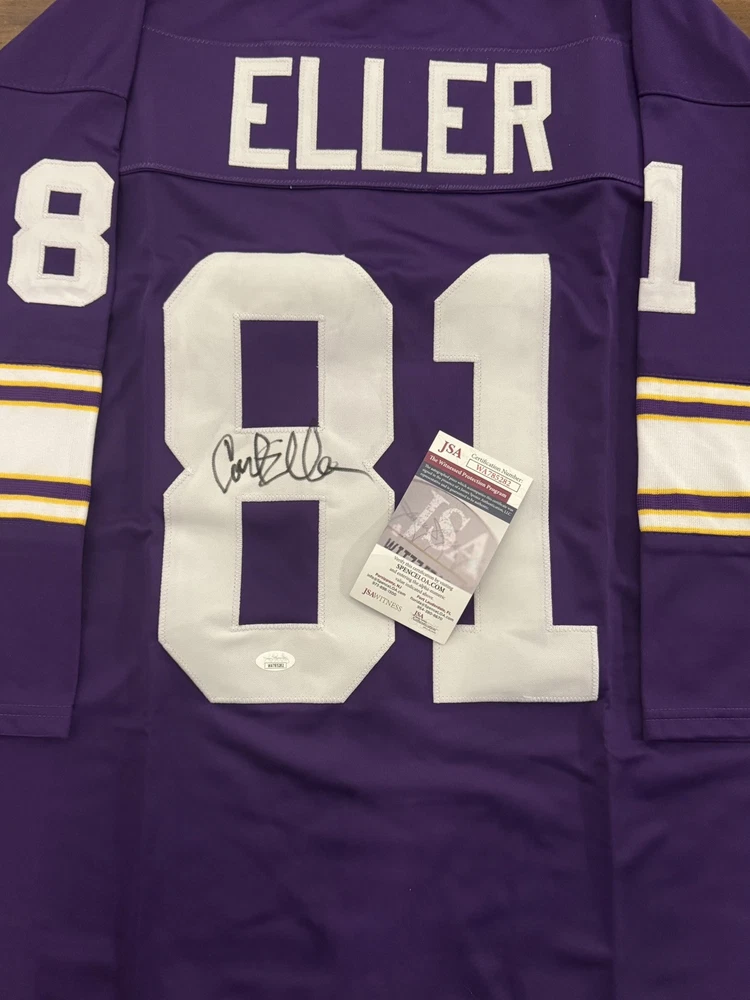 Own a piece of Minnesota Vikings history with this Carl Eller signed jersey. The jersey is an original piece and comes with a JSA Certificate of Authenticity. This purple jersey is a must-have for any serious football fan and collector. The signature is located on the front of the jersey and is visible in the provided photos. Add this unique item to your collection today!