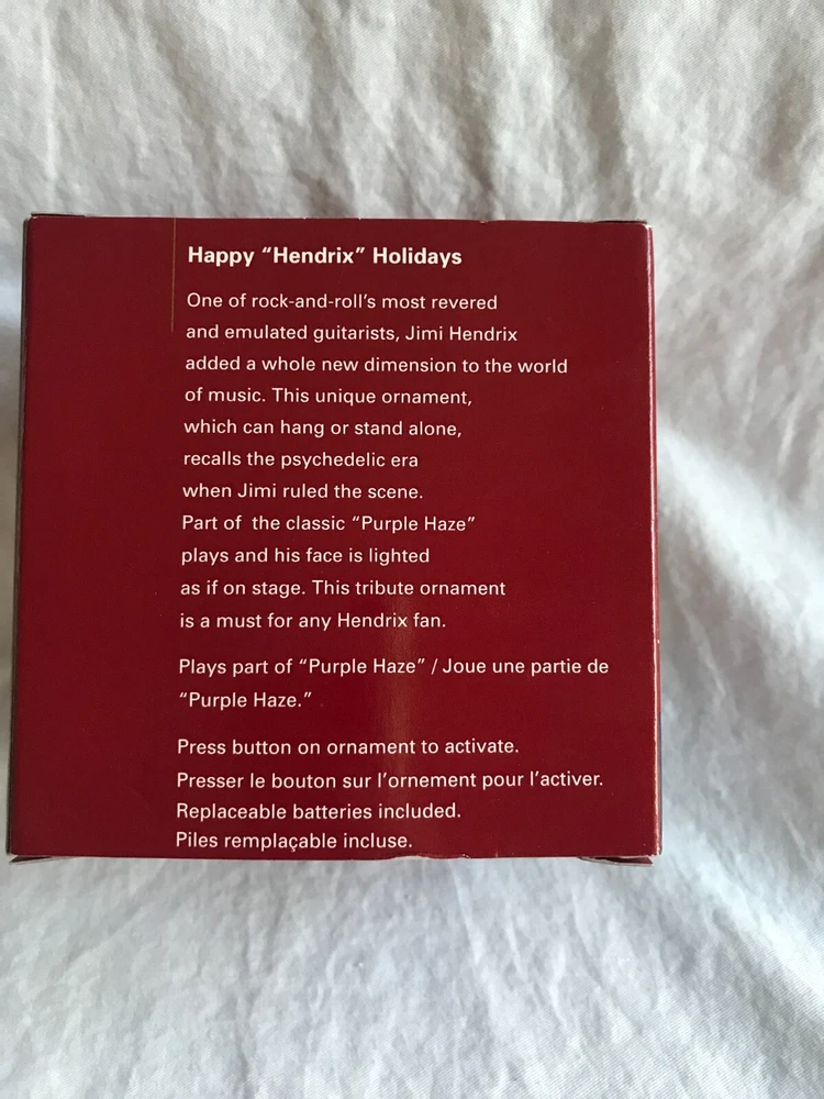 Antique: No Occasion: All Occasions Year Manufactured: 2005 Number of Items: 1 gtin13: 661526652328 Subject: Jimi Hendrix Set Includes: Ornament Brand: Carlton Cards Type: Ornament Original/Licensed Reproduction: Original Personalize: No UPC: 661526652328 Color: Purple Collection: Heirloom Handmade: No Franchise: Jimi Hendrix MPN: 134 Shape: Custom Character: Jimi Hendrix Theme: Music Vintage: No Time Period Manufactured: 2000-2009 Country/Region of Manufacture: China