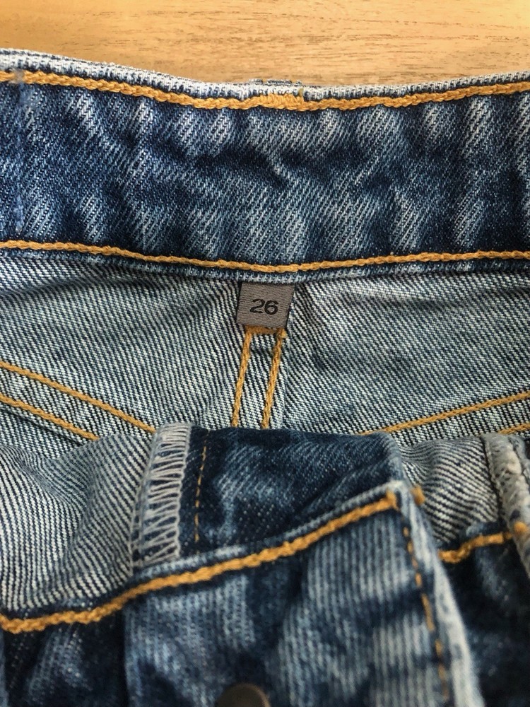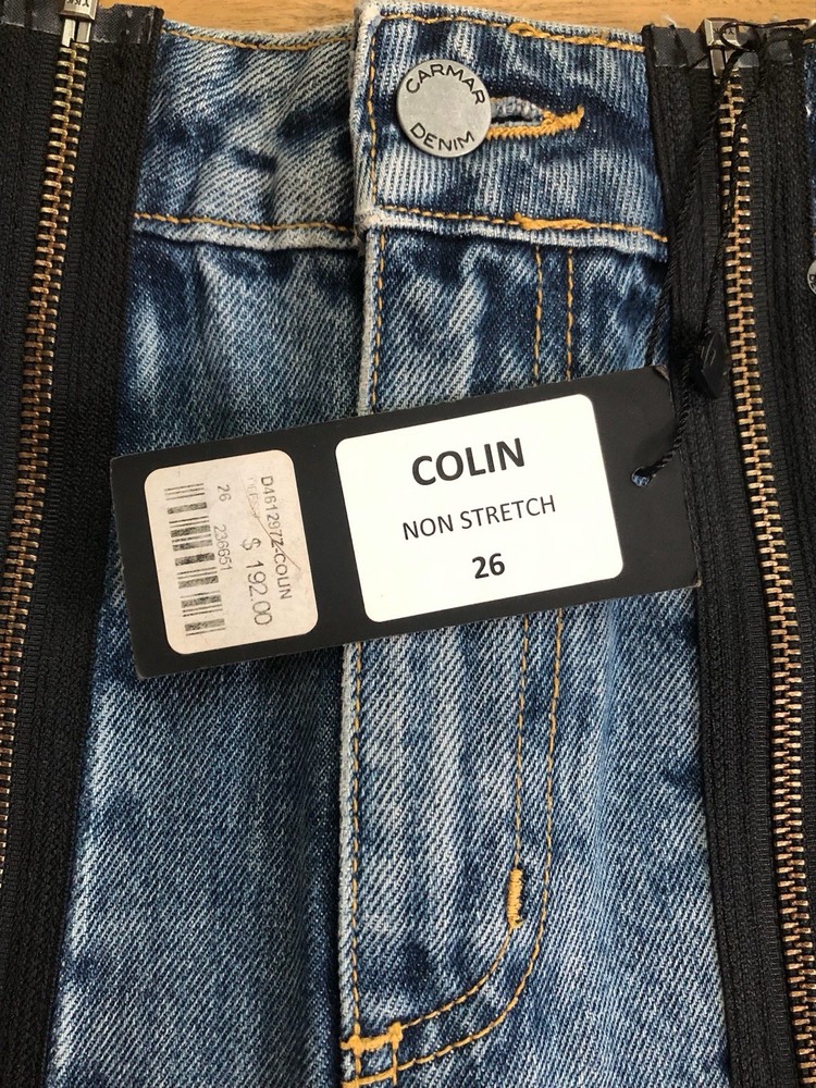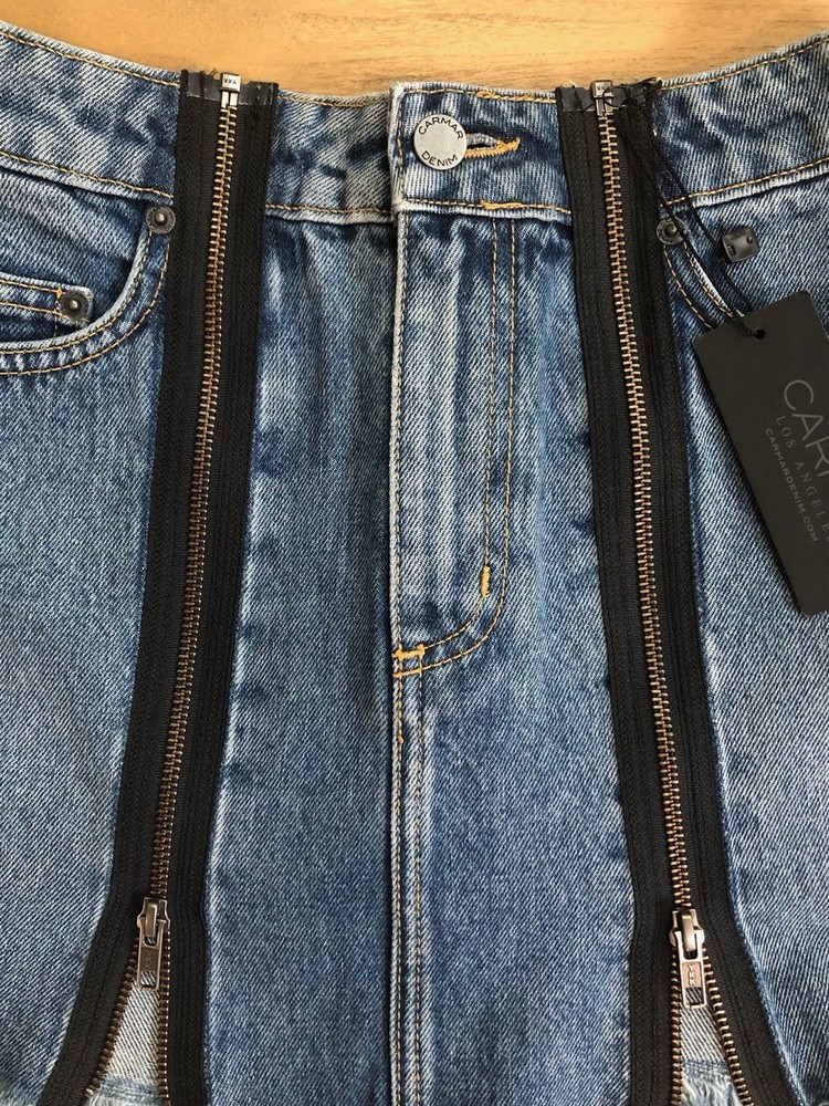 The Carmar Denim Blue Jean Skirt in size 26 features a unique double zip front closure and a frayed hem, adding a trendy touch to the classic denim skirt. Made of cotton denim in a solid blue color, this mini skirt is perfect for both casual and party occasions. With a mid-rise and a short length, it embodies a festival, American, and Bohemian theme, making it a versatile piece for all seasons. Designed by the brand CARMAR, this skirt is machine washable and is a stylish addition to any woman's wardrobe. Bin C