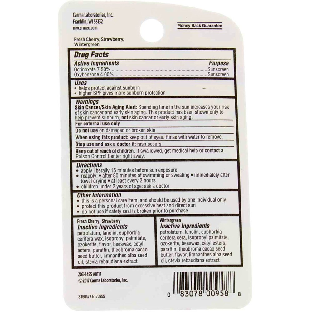 Product Description Smoothes, soothes and softens lips. Everyday SPF 15 sun protection and water-resistant up to 80 minutes. Keeps lips looking and feeling healthy with daily use. 1 x Fresh Cherry (0.15 oz / 4.25 g) 1 x Strawberry (0.15 oz / 4.25 g) 1 x Wintergreen (0.15 oz / 4.25 g). Product Description Smoothes, soothes and softens lips. Everyday SPF 15 sun protection and water-resistant up to 80 minutes. Keeps lips looking and feeling healthy with daily use. 1 x Fresh Cherry (0.15 oz / 4.25 g) 1 x Strawberry (0.15 oz / 4.25 g) 1 x Wintergreen (0.15 oz / 4.25 g). Disclaimer The product descriptions and instructions provided by Vitabox are for informational purposes only and are qualified in their entirety by the information available from manufacturers of the products. You should carefully read all product packaging, and contact the manufacturer with any questions before using a product. While we endeavor to ensure that product descriptions are current, manufacturers sometimes change their products. We are not liable for inaccuracies or misstatements about products. We do not provide medical advice or recommendations. You should not use the information provided by Vitabox for diagnosing or treating a health problem or disease. If you have or suspect that you have a medical problem, immediately contact your health care provider. Information and statements regarding dietary supplements have not been evaluated by the Food and Drug Administration or any other government agency and are not intended to diagnose, treat, cure, or prevent any disease.