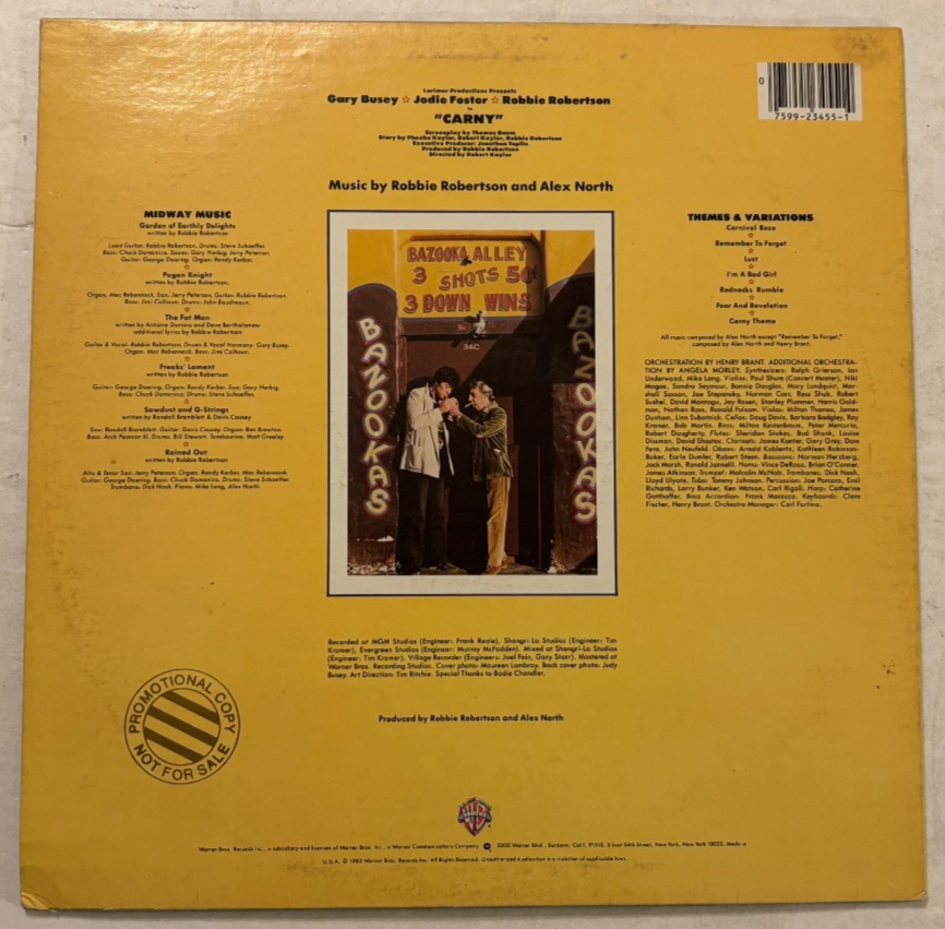 The product is a vintage 1980 LP vinyl record of the soundtrack from the movie "Carny" starring Jodie Foster. This stereo promo vinyl features various artists and was released by Warner Bros. The record is in near mint condition, with a 12" size and comes in a cardboard sleeve. The soundtrack is in English and reflects the film score style from the 1980s era. It is a collectible item for fans of vintage music and film enthusiasts. Sale conditions for all new/old stock vintage (20+ years) still-sealed record albums only *Please read the condition description carefully. *Visual grading only, to the best of my ability. *No returns accepted on all sealed albums if opened or shrinkwrap removed. *All returns must be in same condition when received. *All sealed albums are listed and sold as collectible, investment, and/or future PSA grading, and not as a playing copy. *For playing and enjoyment, I recommend an excellent to near mint copy. *I will list only albums that is in decent condition and playable for listening . *Original or replacement inner paper sleeve. *Record with no warping. *Please note: (New and sealed only) Album cover with minor creases, and flaws such as dented and/or creases corners, shrink-wrap with partial tears, and ring wear are possible. *If you have any questions or concerns before buying, feel free to contact me. Thank you. Vintage 80s Warner Bros. HS-3455 Stereo Promo Copy (stamped on back) Jodie Foster / Gary Busey "Carny" (1980) LP Condition: Pre-owned.