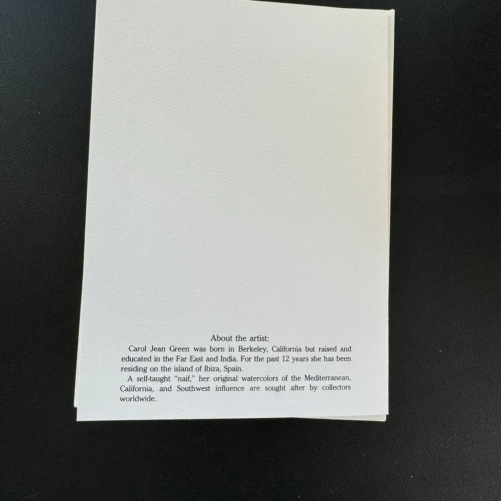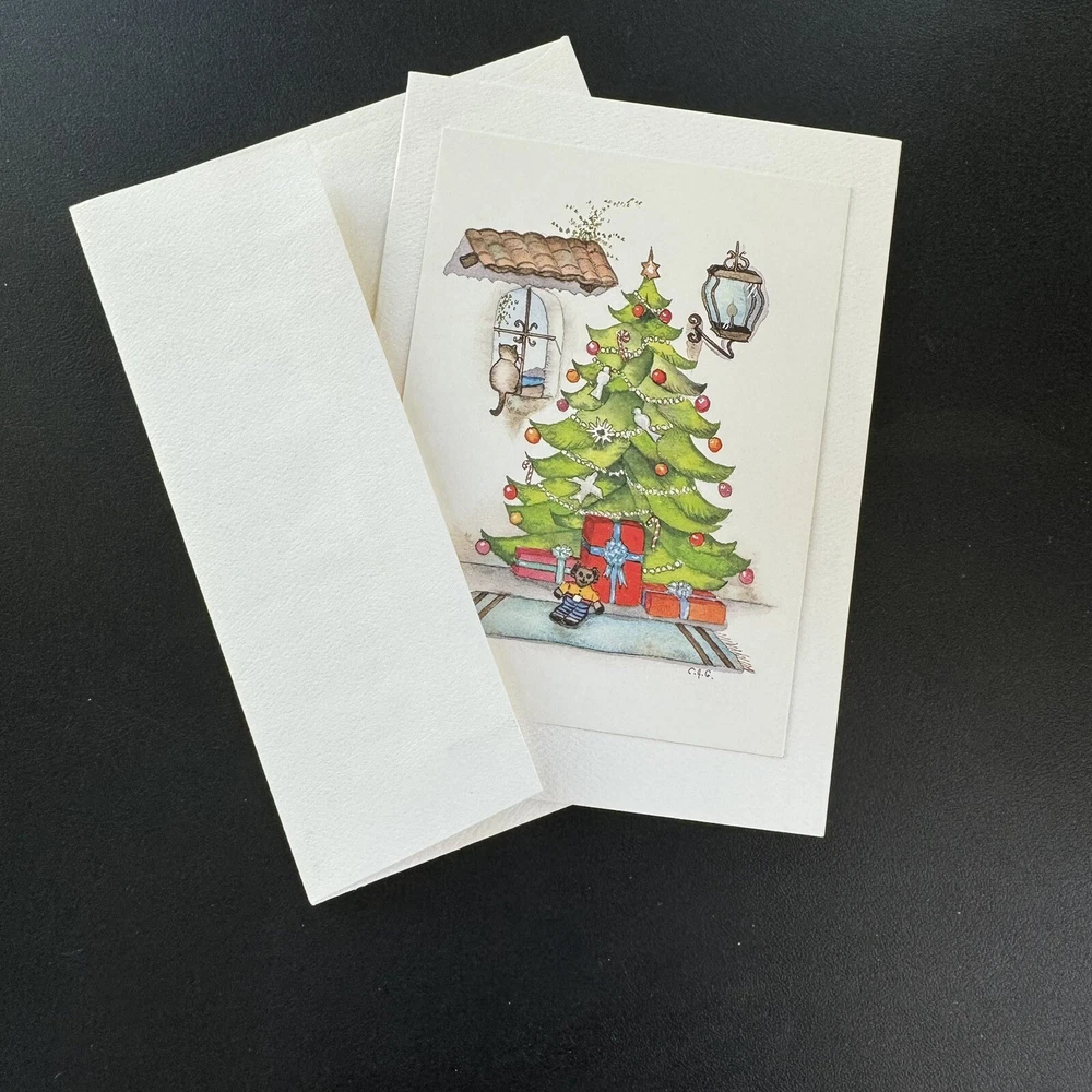 Southwest style watercolor Christmas card with tree, cat, teddy bear and presents. California artist Carol Jean Green. Blank inside. Comes with envelope.