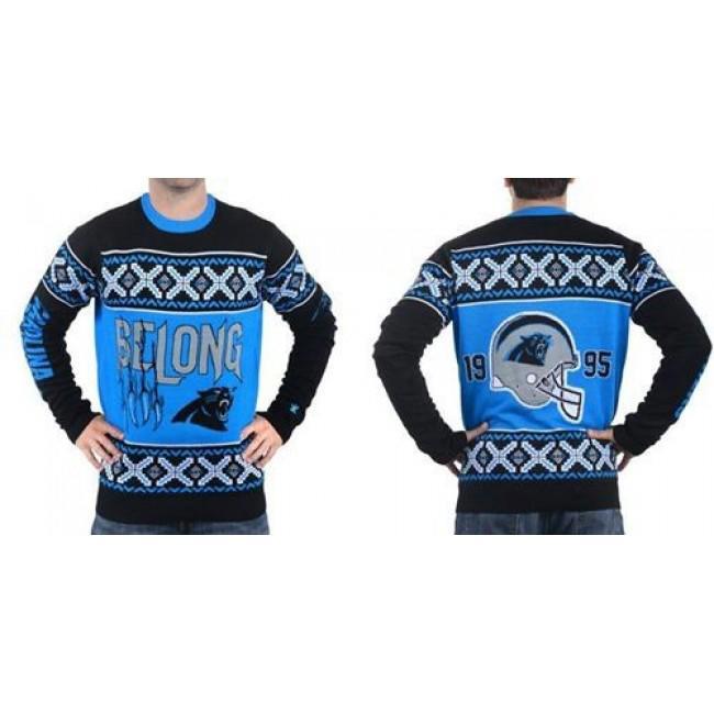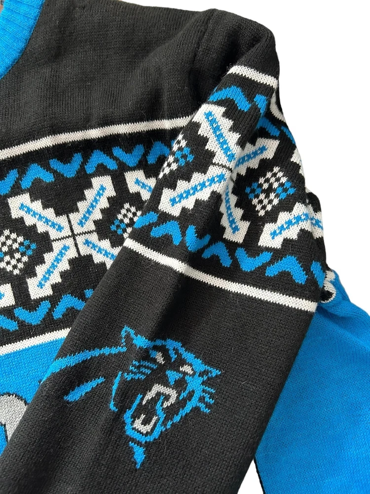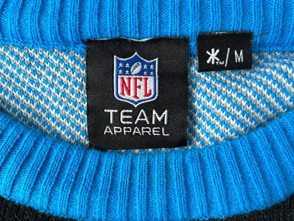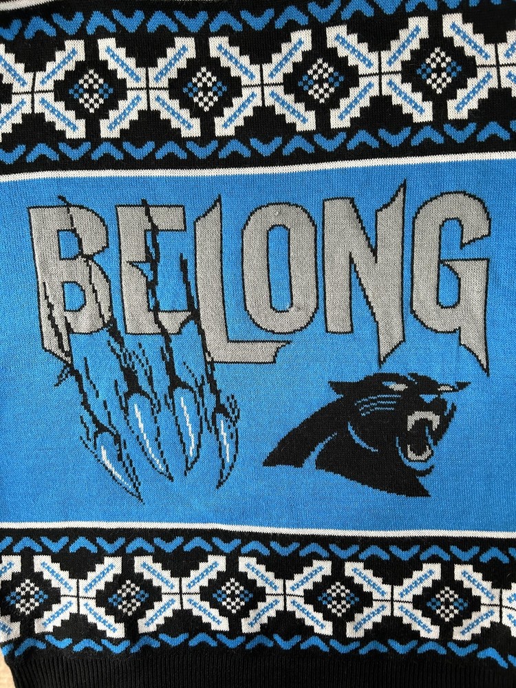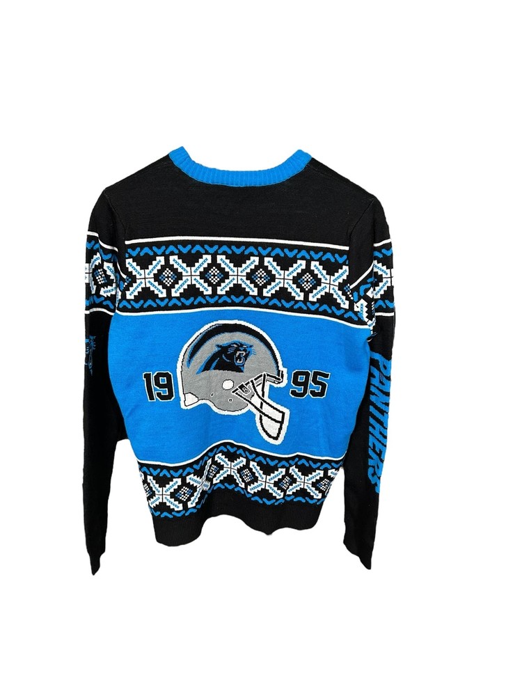 Keep Pounding in this authentic and rare Carolina Panthers "Ugly" Crew Neck Holiday Sweater celebrating the inaugural year the Panthers joined the NFL, and features the "Belong" claws on front and the 1995 Helmut on the back...Its available now in a Size Medium, but probably long-gone by Christmas...Excellent Condition/ No Flaws - may not have been worn. Retail: $195 --- SAME DAY SHIPPING for Orders Received by 3:30 EST --- • Condition: Excellent Condition - Like New • Size: Men's Medium • Color: Carolina Blue, Black, and Silver • Fabric: 100% Acrylic • Measurements: Chest (Pit to Pit): 21.5" Sleeve Length (shoulder seam to end of Sleeve): 28.5" Length (Top of back collar to bottom of hem): 27.5"