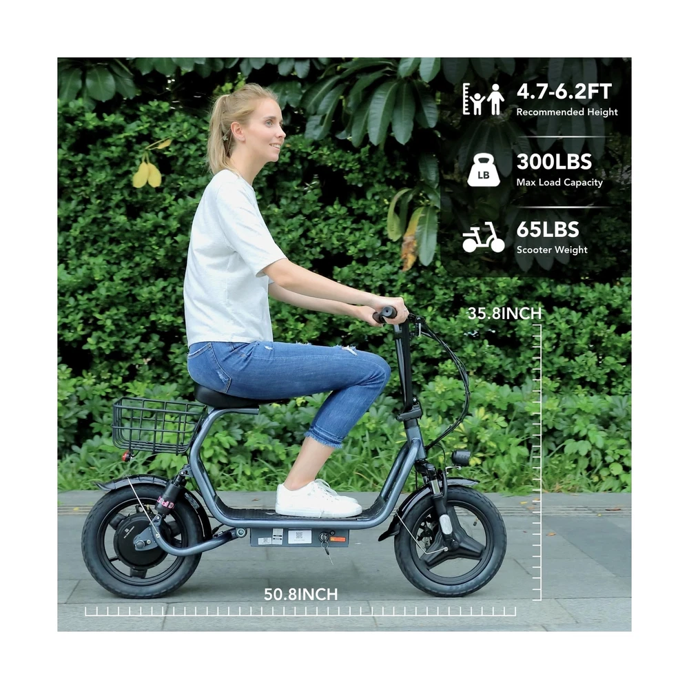 Caroma Peak 1200W Electric Scooter with Seat, 14" Fat Tire Electric Scooter Adults, 500Wh Battery up to 30 Miles&20MPH, Foldable Adult Electric Scooter for Commuting with Basket&Shock Absorbing Description Features: 560W Electric Scooter & 36V Battery350W powerful motor(peak to 560W) electric scooter has 15-mile range and max speed of 20 mph with 10% hill climbing capability. The large capacity 36V lithium battery with regenerative braking has a long range which is ideal for anyone who wants to commute short distance for school or office. Multiple Suspension and 14" Fat TiresThe e scooter comes with multiple shock absorptions (front, rear suspension, and seat shock) that significantly reduce shock, making your ride more comfortable and stable. The 14" large pneumatic tires have excellent grip, high elasticity, and wear resistance. Meanwhile, this adult scooter comes with a large, soft seat and an extra-wide non-slip deck to make long rides a breeze. Foldable & Safe Electric Scooter AdultsThis motorized scooter has folding design for increased portability and safety features like responsive and effective dual drum braking systems, bell, headlight and red tail-light, making it a portable electric scooter for commuting. It also has durable one-piece wheel hubs and a high-strength steel frame with a good weight capacity. The compact folded size makes it easy to store in car trunks and other tight spaces. (NOTE: Max load 300lbs) Smart Electric Scooter with Seat The Caroma P4 is an electric commuter scooter designed for adults. It has a basket above the rear wheels and can carry up to 30 pounds, making it ideal for quick errands and shopping. This electric scooter also features an LCD display that clearly shows the real-time power level of the ride. Meanwhile, the handle-mounted throttle allows you to control your riding speed easily and precisely. Easy Assembly & After Sales GuaranteeThe adult scooter comes mostly assembled with instructions and installation tools. We provide warranty for the e scooter. Caroma electric scooter has passed UL2272 certification, ensuring it meets stringent safety standards. Product Details: Brand: Caroma Color: Grey-Shock Absorption Age Range (Description): Adult Special Feature: Digital Display, Seat, Dual Braking System, Basket, Foldable Weight Limit: 300 Pounds Number of Wheels: 2 Model Name: P4 Electric Scooter Wheel Material: Rubber Frame Material: Aluminum Item Weight: 29.5 Kilograms Brand: Caroma Color: Grey-Shock Absorption Age Range (Description): Adult Special Feature: Digital Display, Seat, Dual Braking System, Basket, Foldable Weight Limit: 300 Pounds Number of Wheels: 2 Model Name: P4 Electric Scooter Wheel Material: Rubber Frame Material: Aluminum Item Weight: 29.5 Kilograms Handlebar Type: Fixed Handle Height: 51.2 Inches Wheel Size: 14 Inches Wheel Type: Pneumatic Suspension Type: Dual Suspension Grip Type: Ergonomic Brake Style: Front Braking, Rear Braking Warranty Type: Extended Charging Time: 4 Hours Recommended Uses For Product: Commuting Maximum Distance Range: 15 Miles Manufacturer: Guangzhou Plenty Bicycle Co.,Ltd Item Package Dimensions L x W x H: 50.79 x 26.38 x 9.06 inches Package Weight: 65 Pounds Brand Name: Caroma Warranty Description: 12 Months Warranty Material: Iron Suggested Users: unisex-adult Number of Items: 1 Part Number: P1 Electric Scooter Style: 560W 15Miles Classic Grey with seat Included Components: 1 x User Manual, 1 x Power Adaper, 1 x Electric Scooter, 1 x Toolkit Size: 129*23*67CM Date First Available: December 27, 2023 Delivery We Do Not Ship Outside of the Continental US. Return Policy All items qualify for returns within 30 days of receipt. Buyer is responsible for return shipping on any item that is not damaged. Feedback We take our reputation seriously, we buy and sell online, so we understand the value of trust. If you are unsatisfied with your order, please contact us and we will work with you to resolve it to your satisfaction.