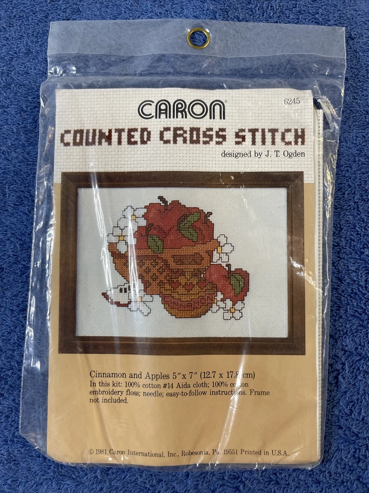 Caron Counted Cross Stitch Kit. Apples & Cinnamon in Basket 5”x7” No Frame. There is a hole in the plastic in the front of package-see pictures- no harm to the item inside noted.