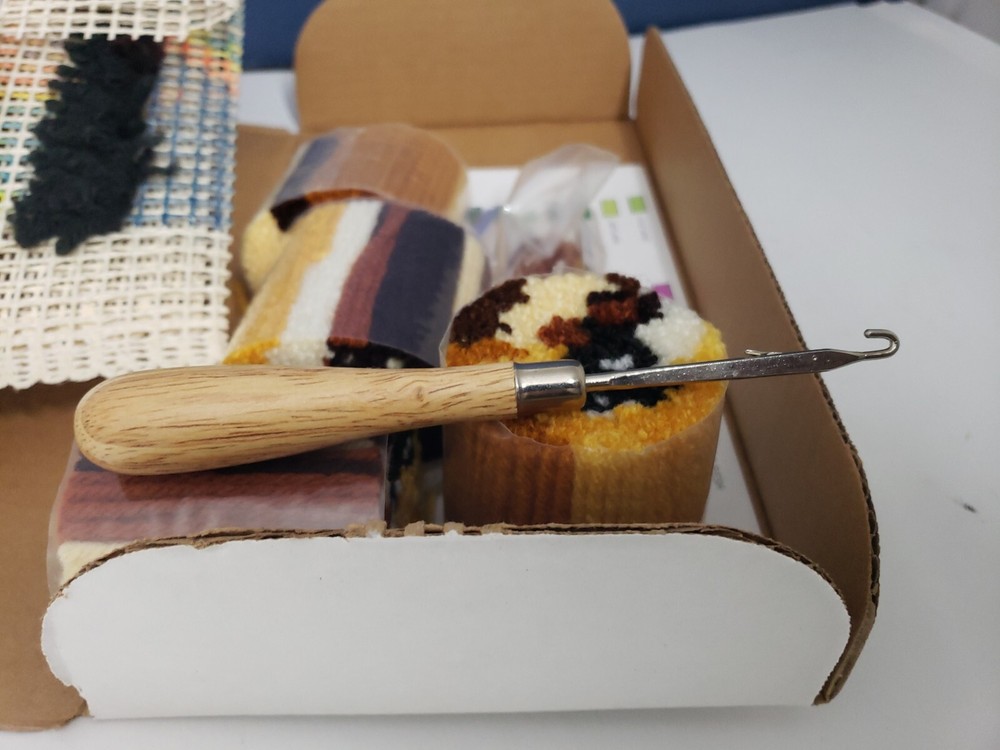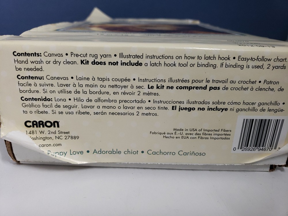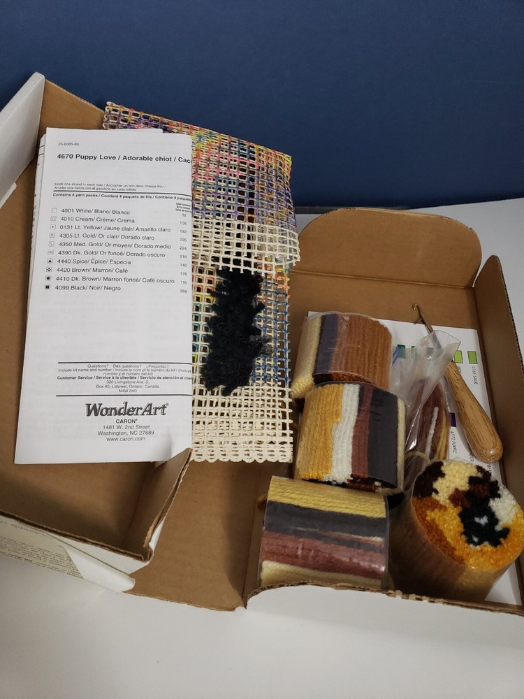 Crochet WONDER ART Caron LATCH HOOK KIT # 4670 PUPPY LOVE 12" X 12" Labrador. Condition: open box, comes with Latch hook Tool, a few used items included, see actual pics