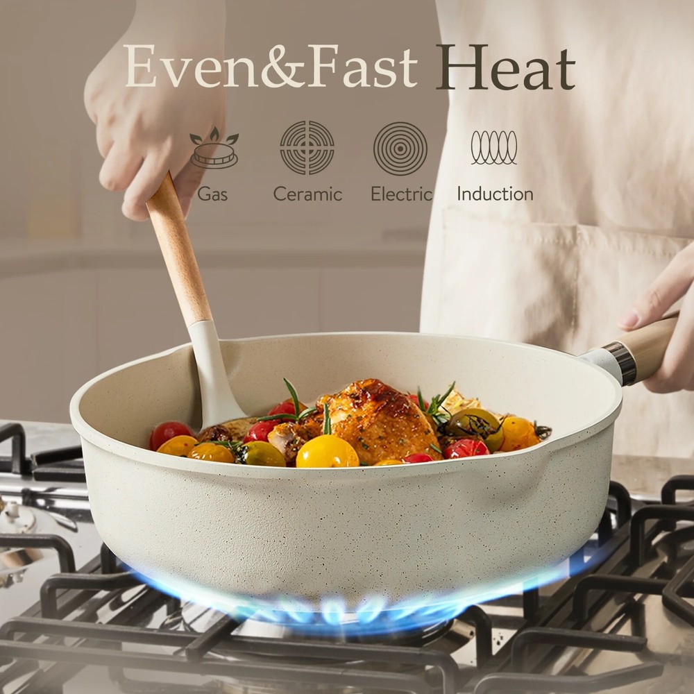 This frying pan is a game-changer in the kitchen! The nonstick surface works like a dream—eggs slide right off, and cleanup is a breeze. The sturdy construction feels premium, and the induction-safe base heats evenly without hot spots. The included lid is a nice bonus for simmering sauces or keeping food warm. Love the sleek white design—it looks great on my stove. Carote delivers amazing quality at an unbeatable price. Highly recommend for anyone who loves hassle-free cooking!