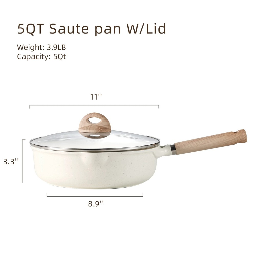 Why Carote? Enjoy the Best Quality. Carote is committed to offering you the best quality at the fairest and most honest price, with 25 years of experience in the nonstick cookware industry. We sell directly from our factory. A typical M13C model allows us to offer the lowest cost with higher quality products. We always adhere to the principle of customer first, pay attention to the customer's shopping experience, and provide excellent service to ensure each customer receives the best value for their money. STURDY BODY - Made of heavy-duty cast aluminum, this nonstick pan resists warping and wobbling while heating quickly and evenly. SUPER NONSTICK: This sauté pan features a premium nonstick coating in creamy white with speckles and a sleek granite look, making cooking and cleanup a breeze. Food slides off easily, and less oil or butter is needed, promoting healthier cooking. EASY TO CLEAN - The non-stick surface and soft-touch Bakelite handle make cleaning a breeze, saving you time and effort in the kitchen. COMFORTABLE HANDLE - Sturdy round handle with safe flame guard ring for comfortable and safe cooking COMPATIBLE WITH ALL STOVETOPS - The stainless steel induction base is suitable for gas, induction, electric, and ceramic stovetops. VISIBLE COOKING - The clear tempered glass lid allows easy monitoring of cooking progress LARGE CAPACITY -5.0 QUART, 11 inch/28 cm diameter, perfect for preparing meals for family and friends gathering. Features Nonstick, Induction Compatible Brand Carote Cleaning, Care & Maintenance Just gently wipe it with a paper towel or rinse it with water Assembled Product Dimensions (L x W x H) 19.09 x 11.42 x 3.35 Inches