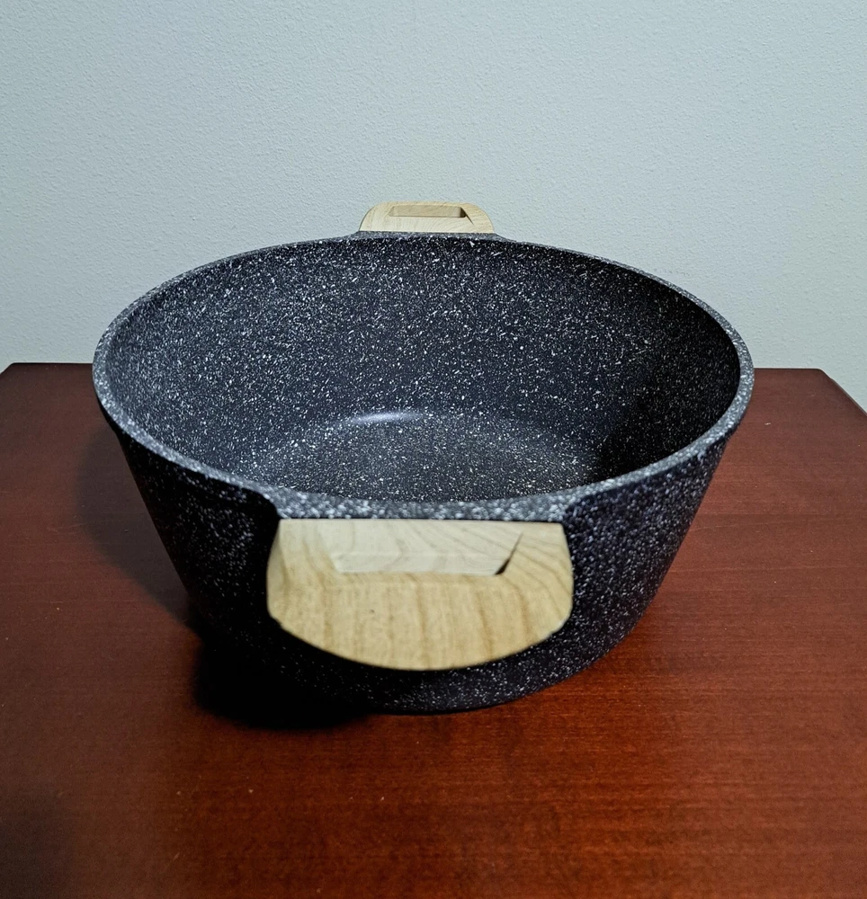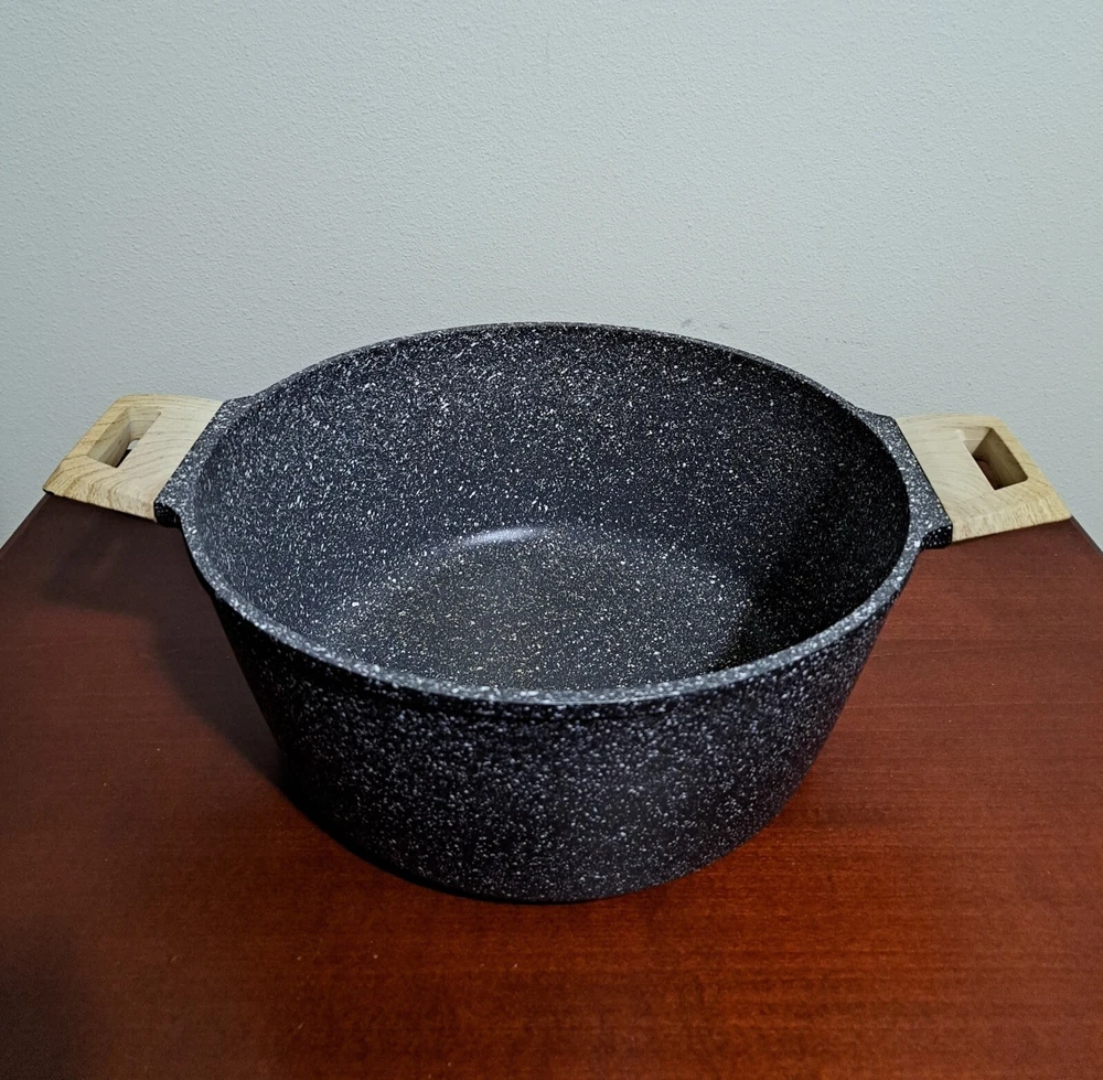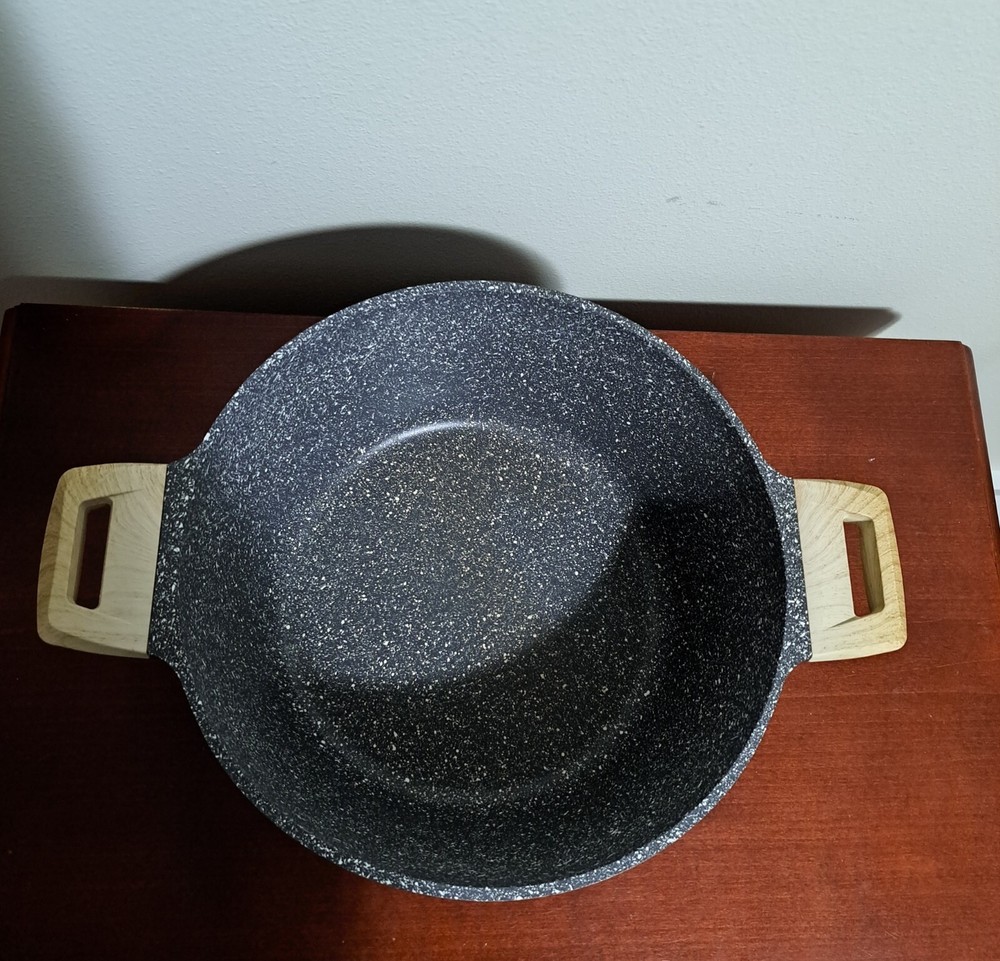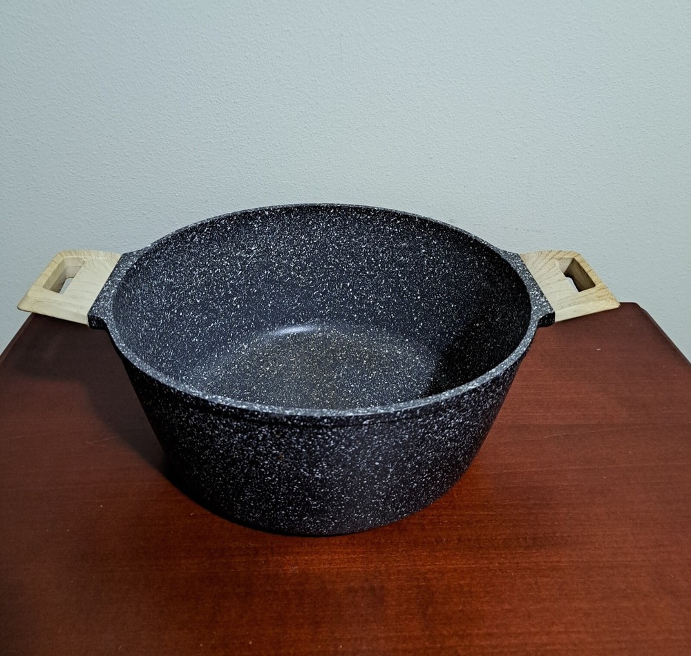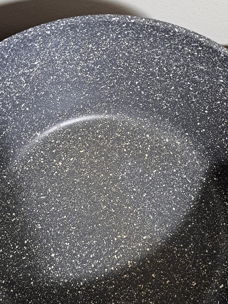 Carote Gray Speckled 6 Quart Nonstick Dutch Oven With Lid. Good Preowned Condition. There are some scratches on the lid, staining inside the pot, and burner marks on the bottom.